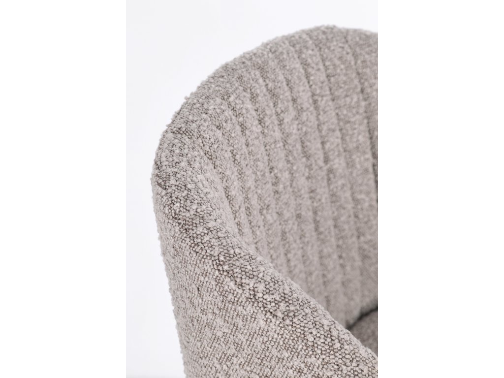 Výplň z polyuretánovej peny s hustotou 22 kg/m3 zabezpečuje pohodlné a ergonomické sedenie, čo je dôležité najmä pri dlhších sedeniach. Polyesterový a akrylový poťah s efektom bouclé dodáva stoličke štýlový a moderný vzhľad, zároveň je odolný voči opotrebeniu a ľahko sa udržiava v čistote.