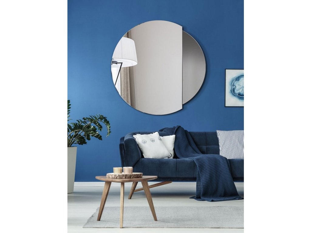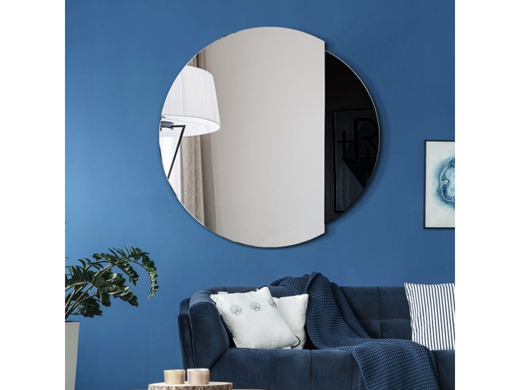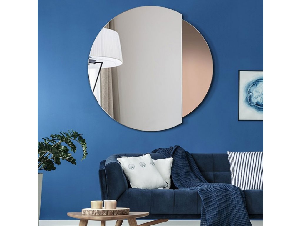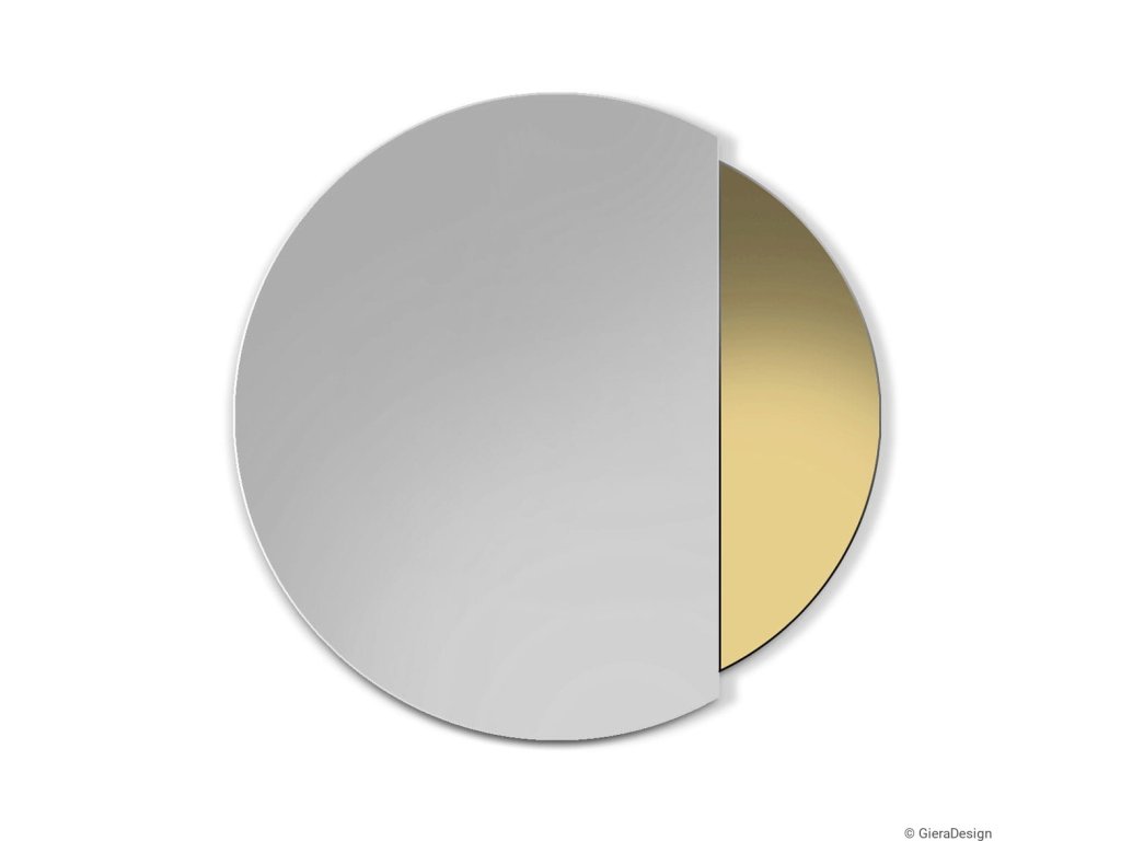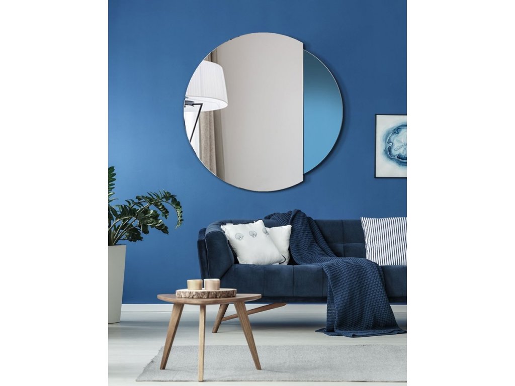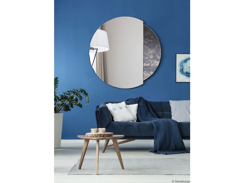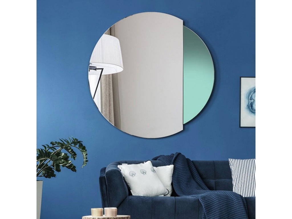 Elegantné okrúhle nástenné zrkadlo v štýle Art Déco inšpirované grafikou 60.rokov. Krásna dekorácia do moderného interiéru, ideálne vhodná aj do módnych eklektických priestorov. Zrkadlo vyrobené z dvoch kusov zlepených dohromady. Väčšiu časť tvorí klasické zrkadlové sklo skombinované s farebným zrkadlom podľa výberu.
