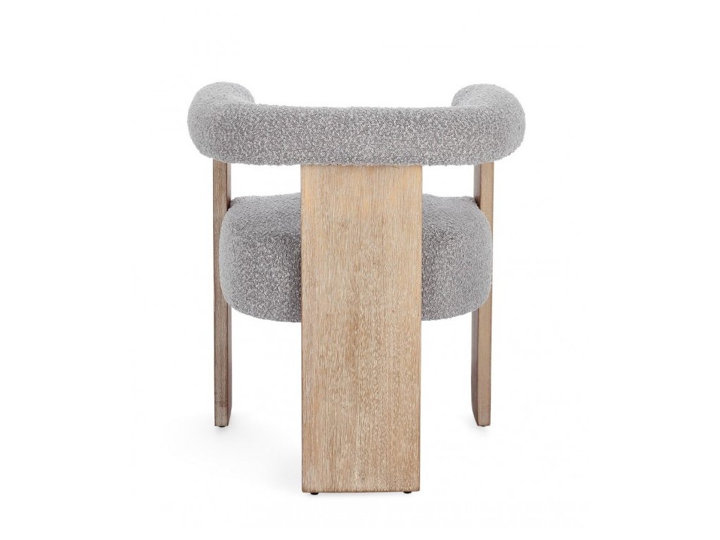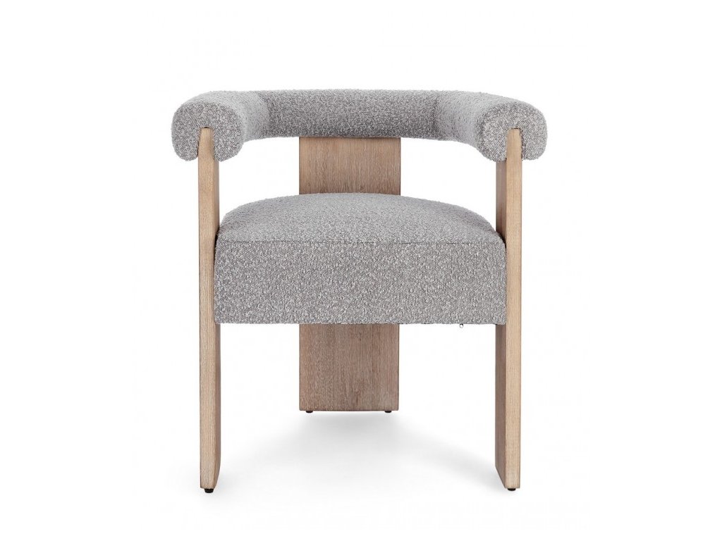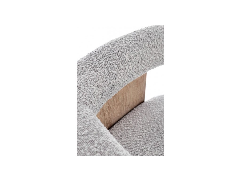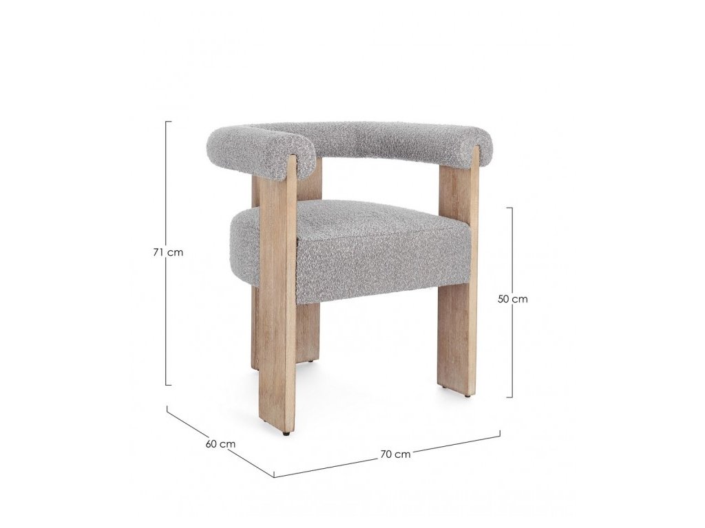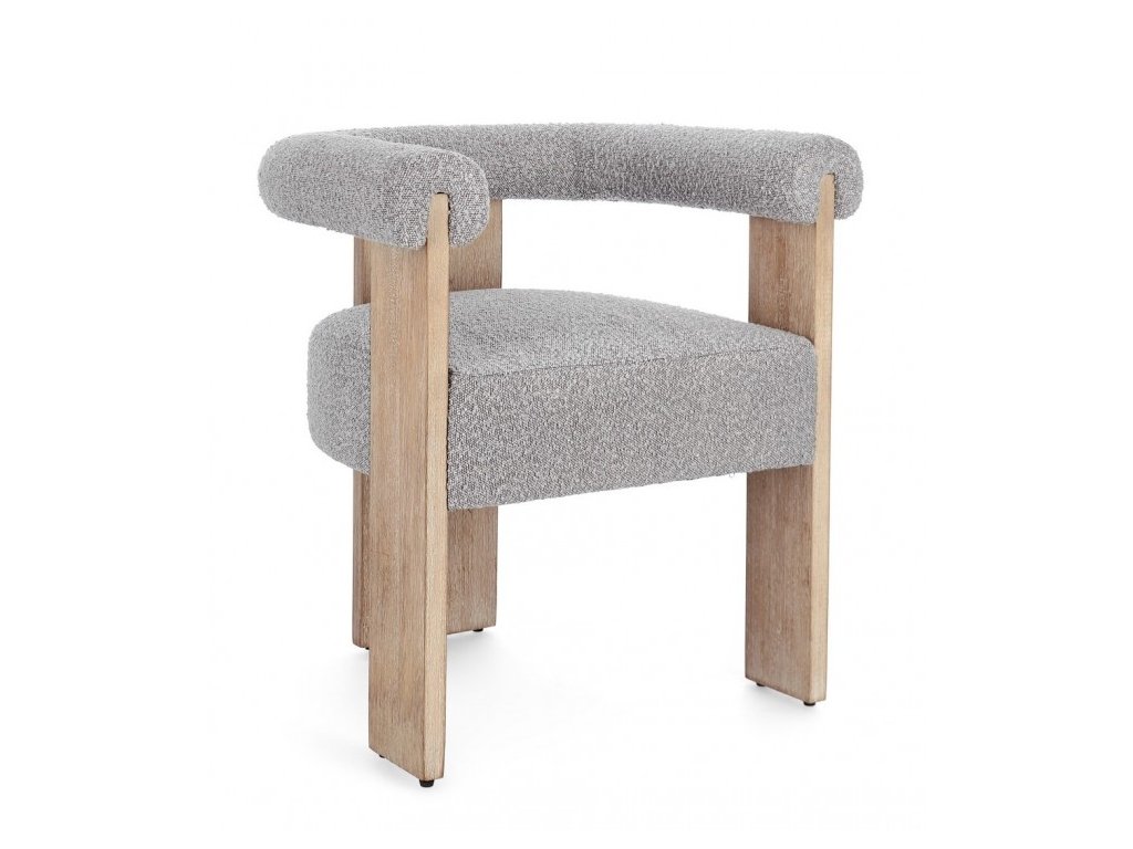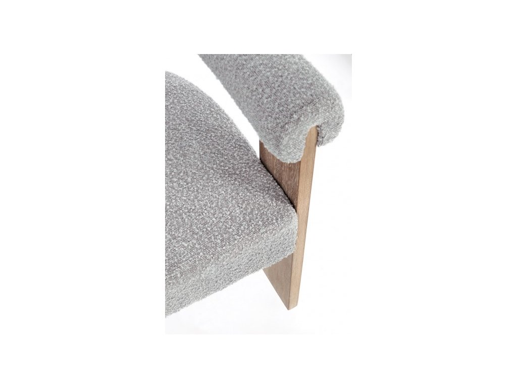 Luxusná jedálenská stolička s boucle efektom a lakťovou opierkou. Rám stoličky je z borovicového dreva, nohy stoličky tvorí kaučukové drevo. Moderná stolička sa hodí do kuchyne, jedálne či ako kreslo do vstupnej chodby. Hustota náplne polyuretánovou penou 18/30 kg/m3.