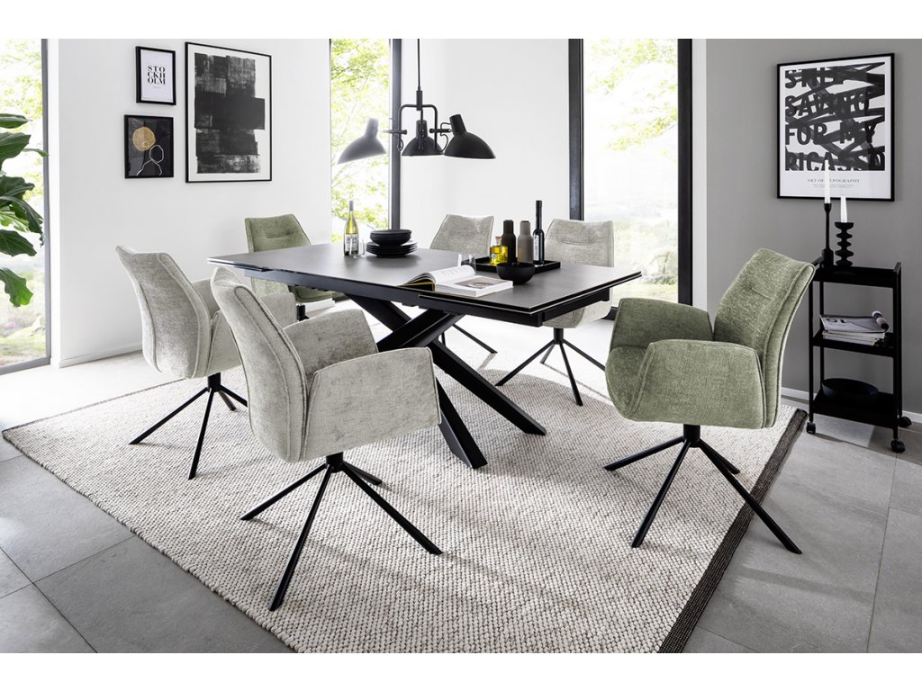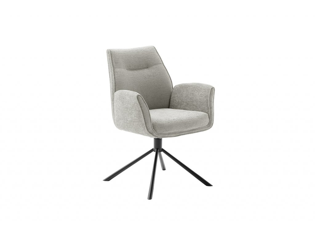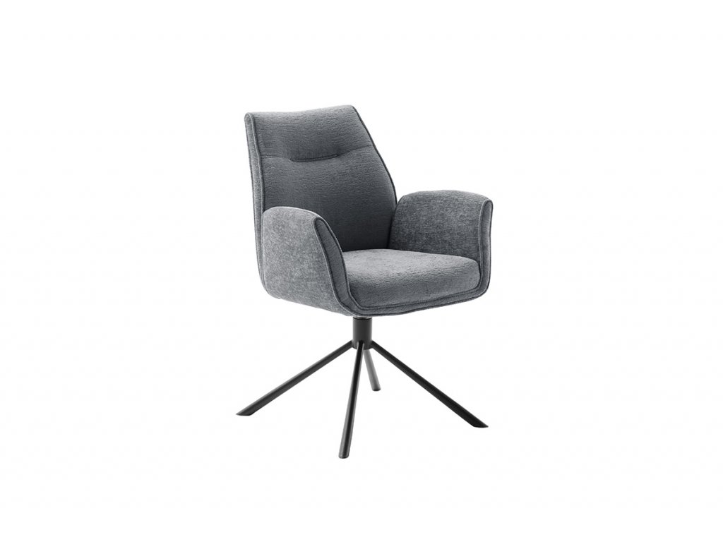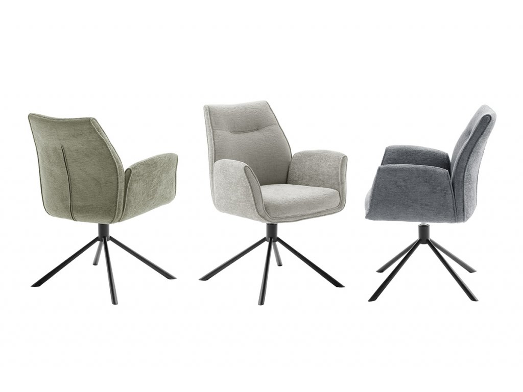 Jedálenská stolička Diveria kombinuje luxusný štýl a funkčnosť. So štyrmi šikmými nohami z kovu v čiernej farbe prináša moderný a elegantný vzhľad. Otočné sedadlo s 360° rotáciou a automatickým návratovým mechanizmom zaručuje maximálne užívateľské pohodlie. Sedadlo s vreckovými pružinami a opierkami rúk poskytuje výnimočný komfort pri sedení. Povrch stoličky je potiahnutý ženilkovou látkou, ktorá je veľmi príjemná na dotyk. Zaručene oživí každú kuchyňu. Dostupná v troch farbách antracitovej, olivovej a sivej.
