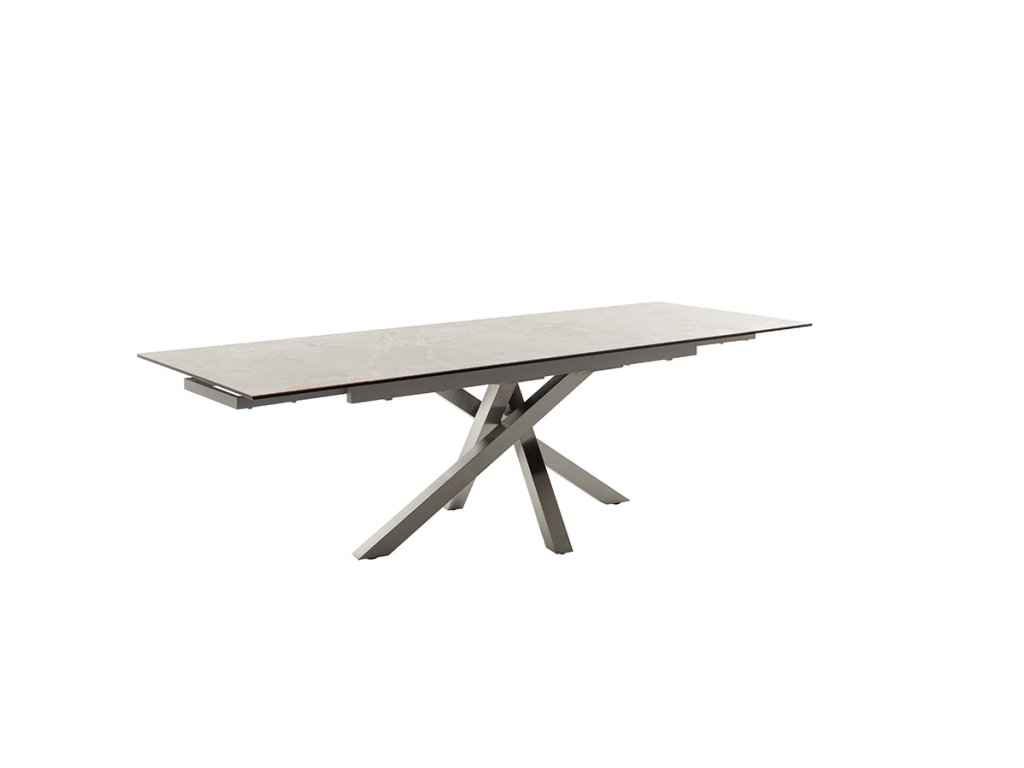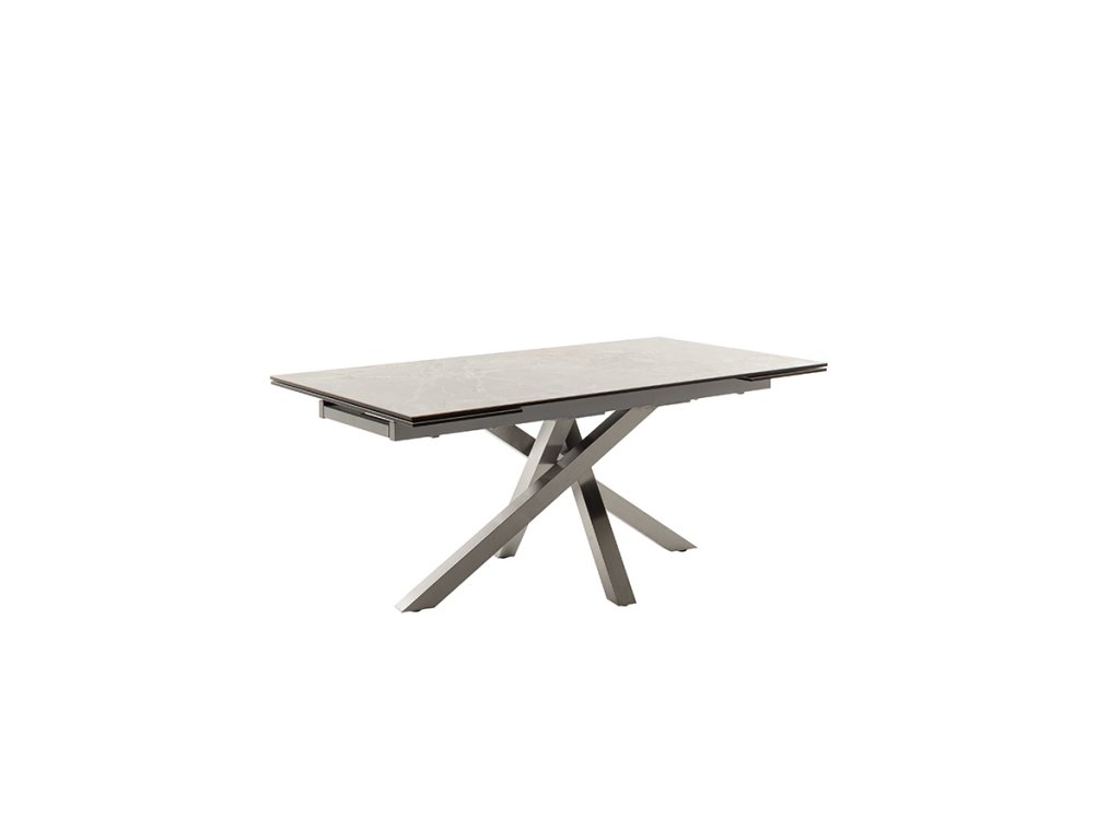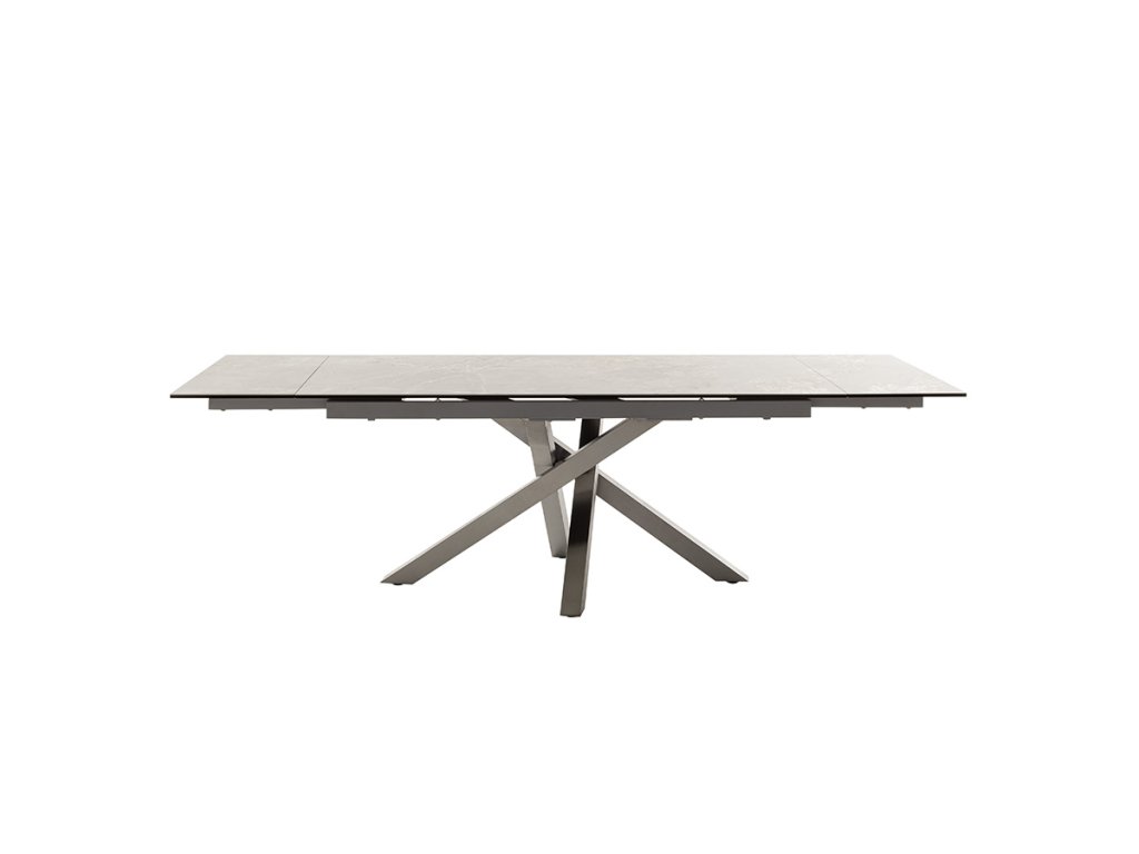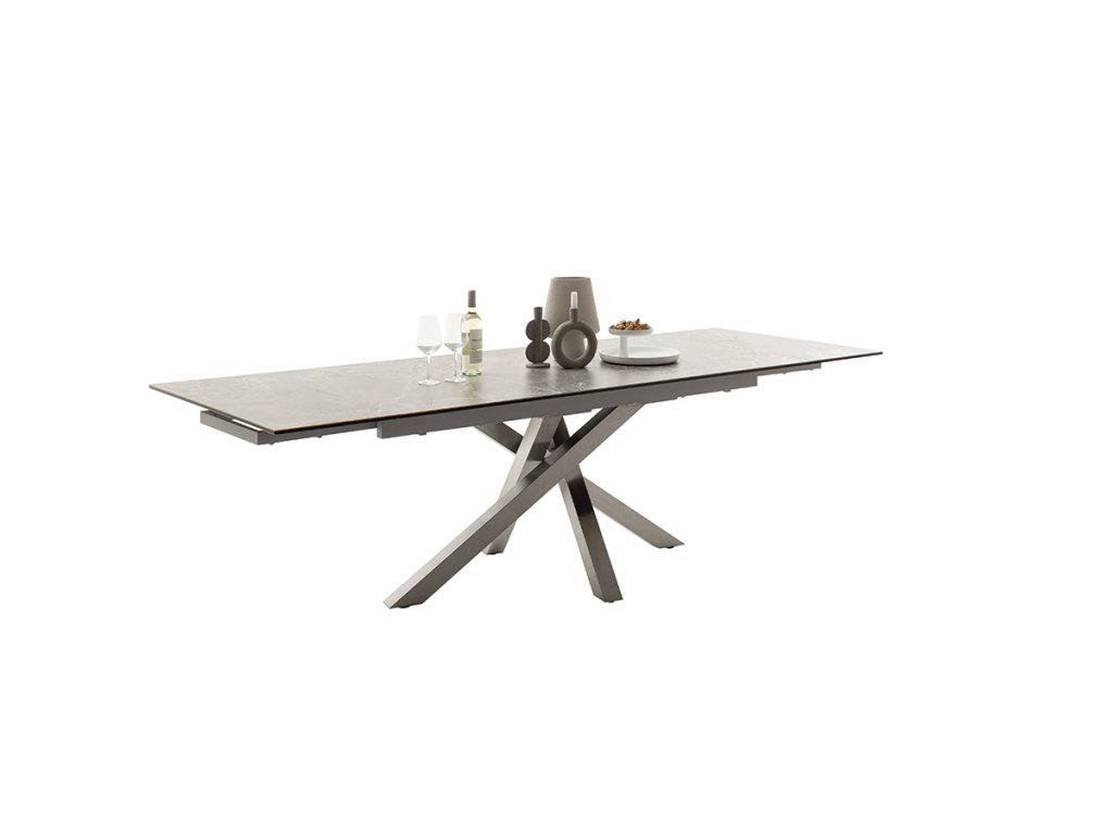 Jedálenský stôl Almiros v krásnom sivom prevedení stolovej dosky vás očarí svojím moderným dizajnom. So šikovnými bočnými doskami ľahko premeníte jeho štandardnú dĺžku 180 cm na impozantných 260 cm. Stôl je ideálny nielen na rodinné obedy, ale aj na spoločné večery plné zábavy v kruhu priateľov. Jedinečný lúčovitý rám z brúsenej nehrdzavejúcej ocele pridáva stolu nádych exkluzivity. Doska z keramického materiálu a bezpečnostného skla s hrúbkou 13 mm je nielen esteticky príťažlivá, ale aj mimoriadne odolná a ľahko udržiavateľná. Moderný rozkladací jedálenský stôl z keramiky a skla do kuchyne či jedálne.