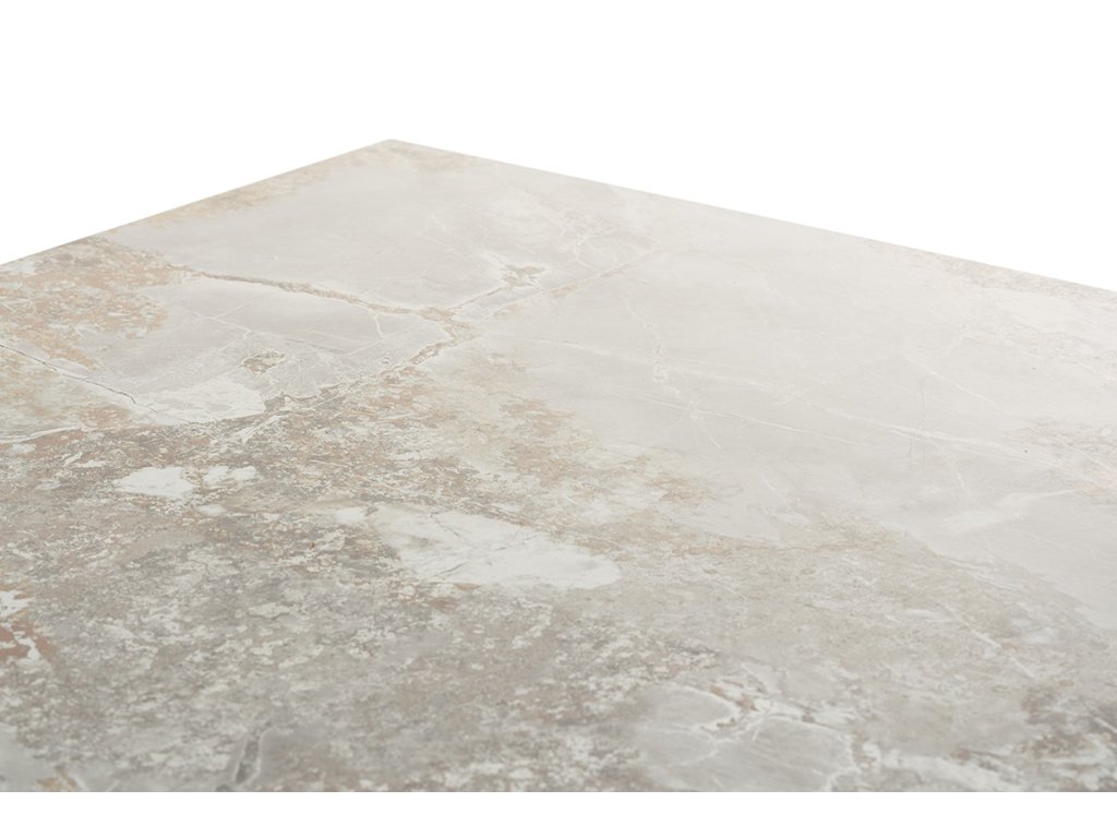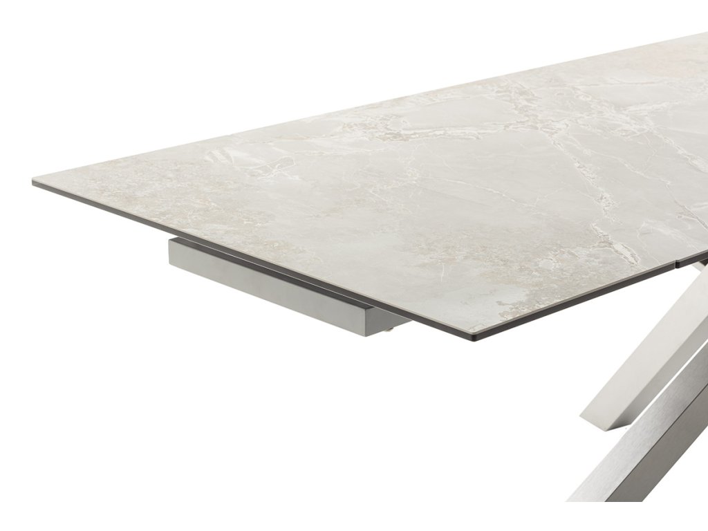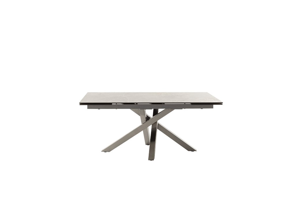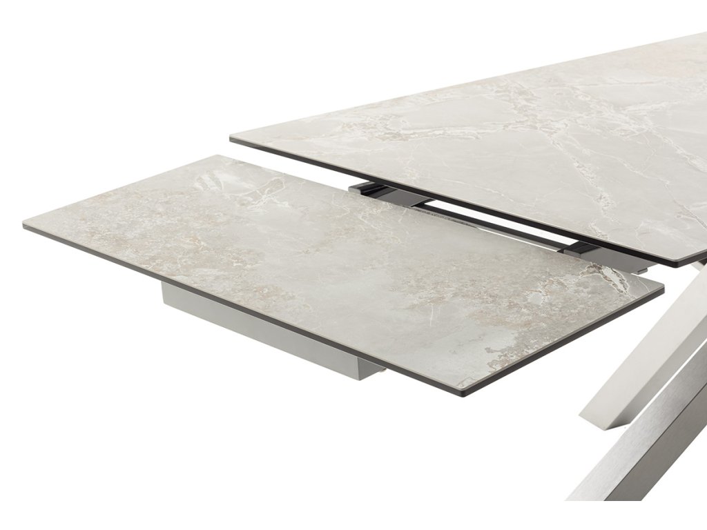 Jedálenský stôl Almiros v krásnom sivom prevedení stolovej dosky vás očarí svojím moderným dizajnom. So šikovnými bočnými doskami ľahko premeníte jeho štandardnú dĺžku 180 cm na impozantných 260 cm. Stôl je ideálny nielen na rodinné obedy, ale aj na spoločné večery plné zábavy v kruhu priateľov. Jedinečný lúčovitý rám z brúsenej nehrdzavejúcej ocele pridáva stolu nádych exkluzivity. Doska z keramického materiálu a bezpečnostného skla s hrúbkou 13 mm je nielen esteticky príťažlivá, ale aj mimoriadne odolná a ľahko udržiavateľná. Moderný rozkladací jedálenský stôl z keramiky a skla do kuchyne či jedálne.