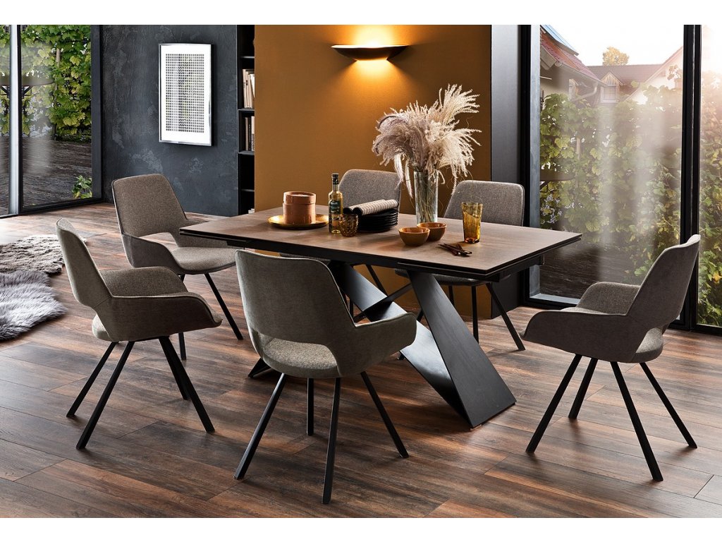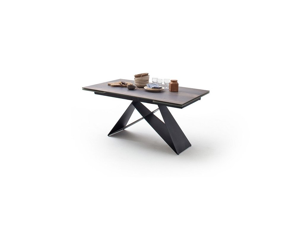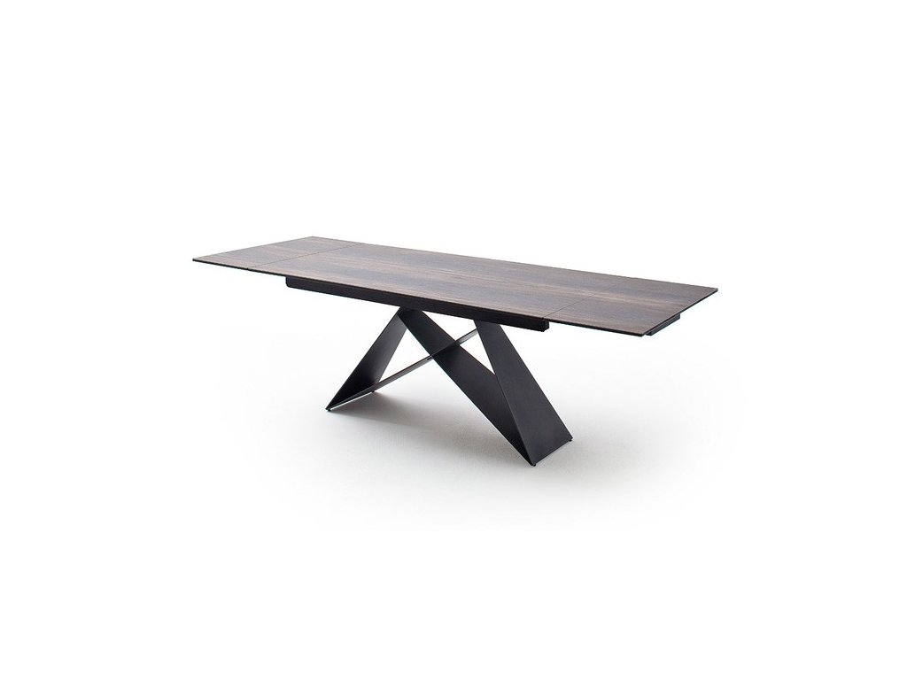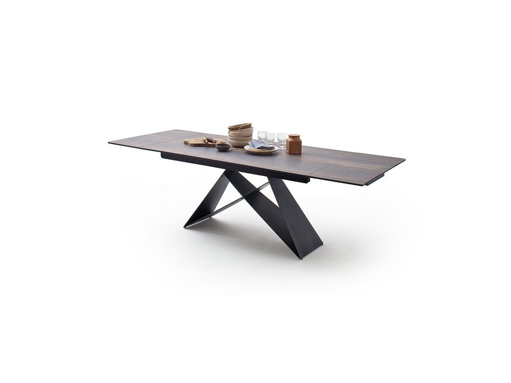 Nádherný elegantný dizajnový stôl s unikátnou kovovou podnožou v matnej čiernej farbe. Doska stola pozostáva z keramiky - optika tmavé drevo. Stôl je možné rozložiť do dĺžky až 240 cm. Hrúbka stolovej dosky je 13 cm, presah dosky 25 cm, bočná strana 7 cm. Na obrázku so stoličkami stôl Kobe v prevedení natur.