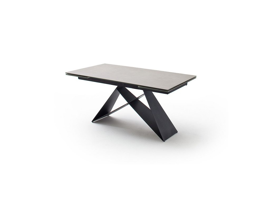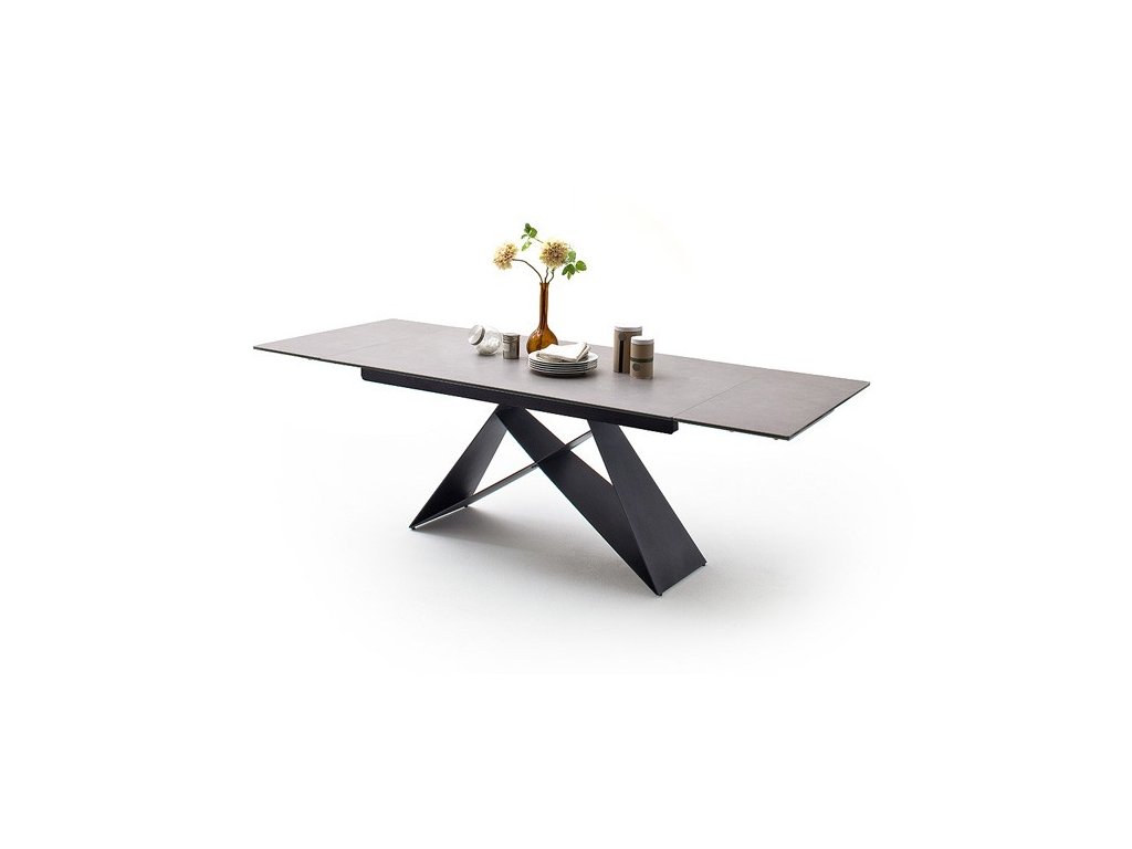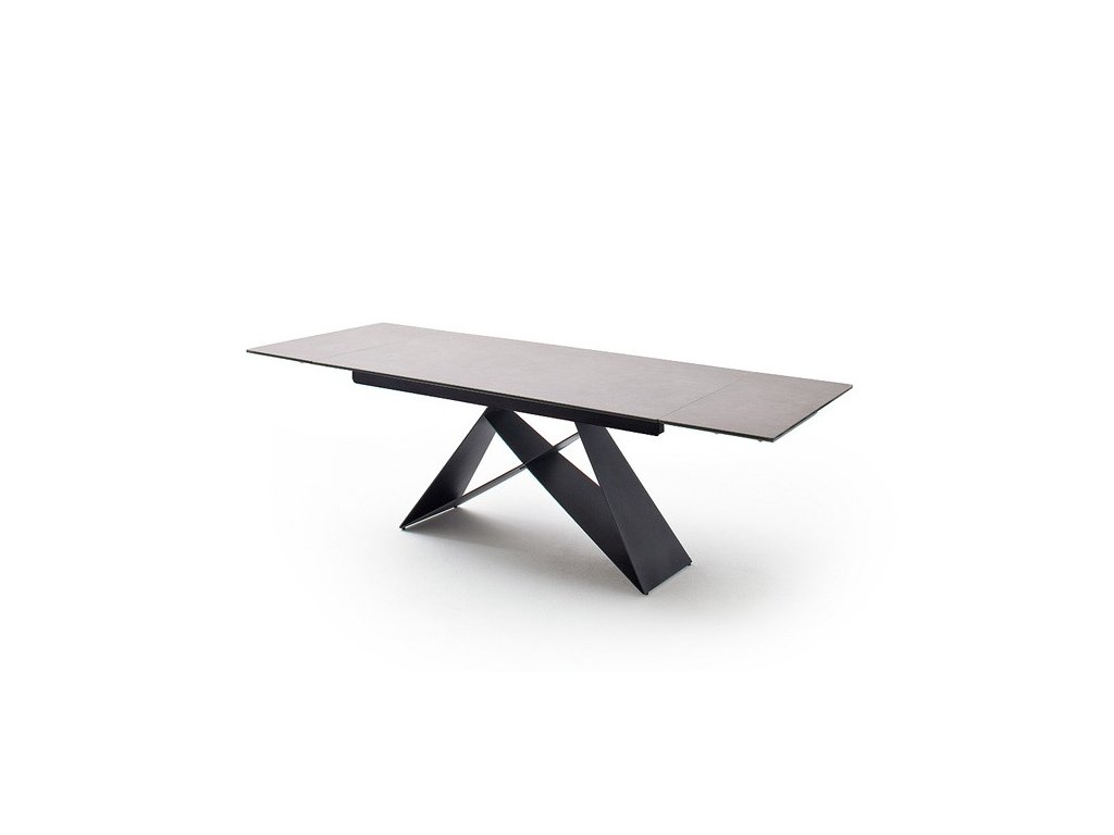 Nádherný elegantný dizajnový stôl s unikátnou kovovou podnožou v matnej čiernej farbe. Doska stola pozostáva z keramiky - svetlosivá. Stôl je možné rozložiť do dĺžky až 240 cm. Hrúbka stolovej dosky je 13 cm, presah dosky 25 cm, bočná strana 7 cm. Na obrázku so stoličkami stôl Kobe v prevedení natur.
