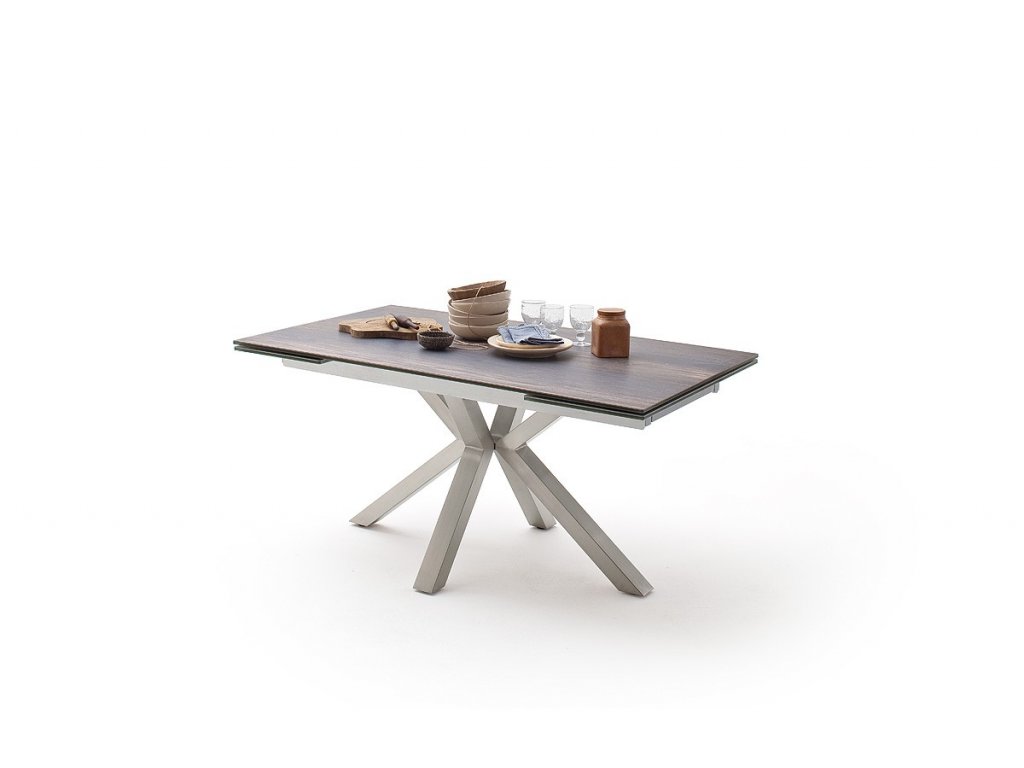 Nádherný elegantný dizajnový stôl s unikátnou mohutnou podnožou z ušľachtilej ocele. Doska stola pozostáva z keramiky v optike tmavého dreva - barrique. Stôl je možné rozložiť do dĺžky až 240 cm. Hrúbka stolovej dosky je 13 cm, presah dosky 17 cm, bočná strana 7 cm.