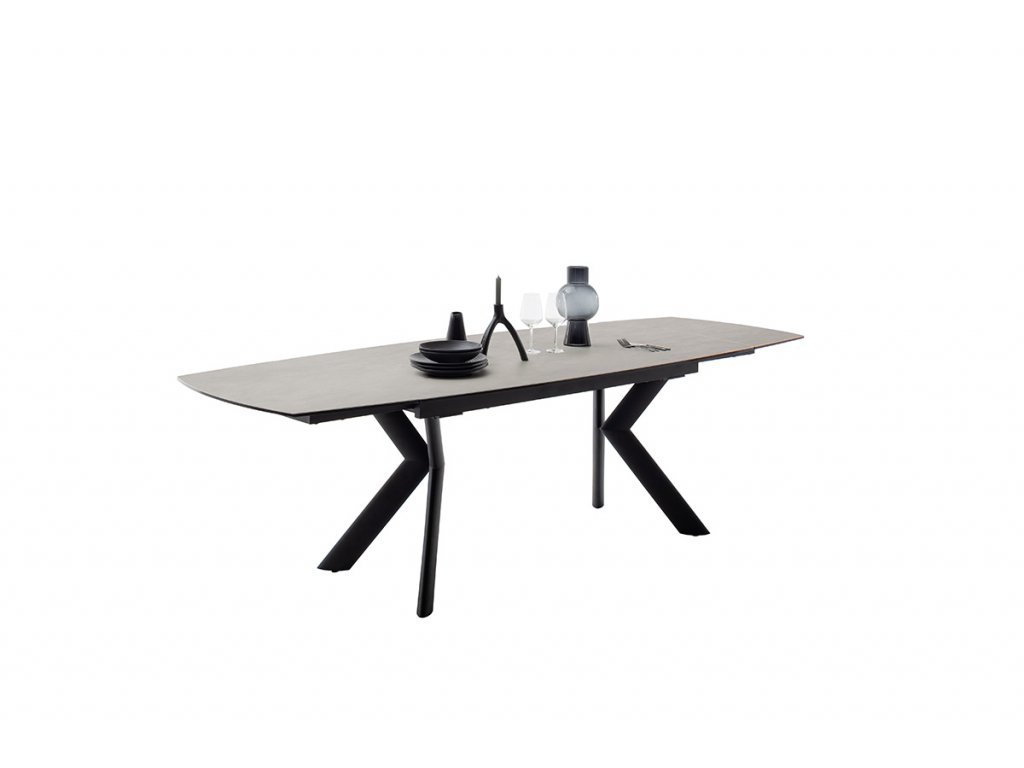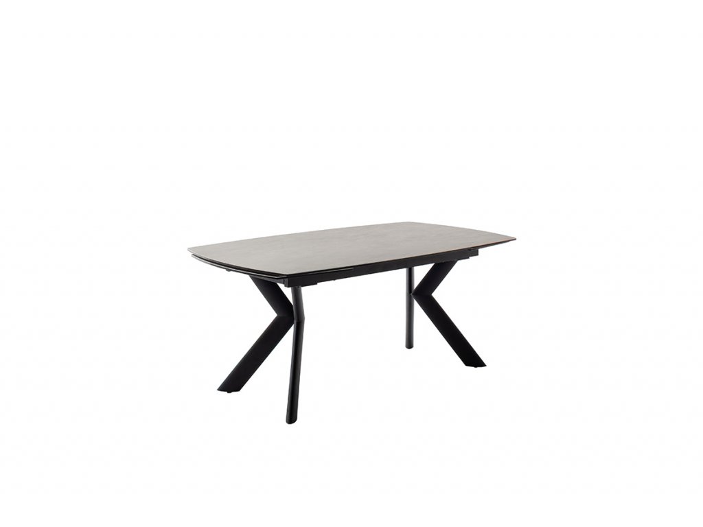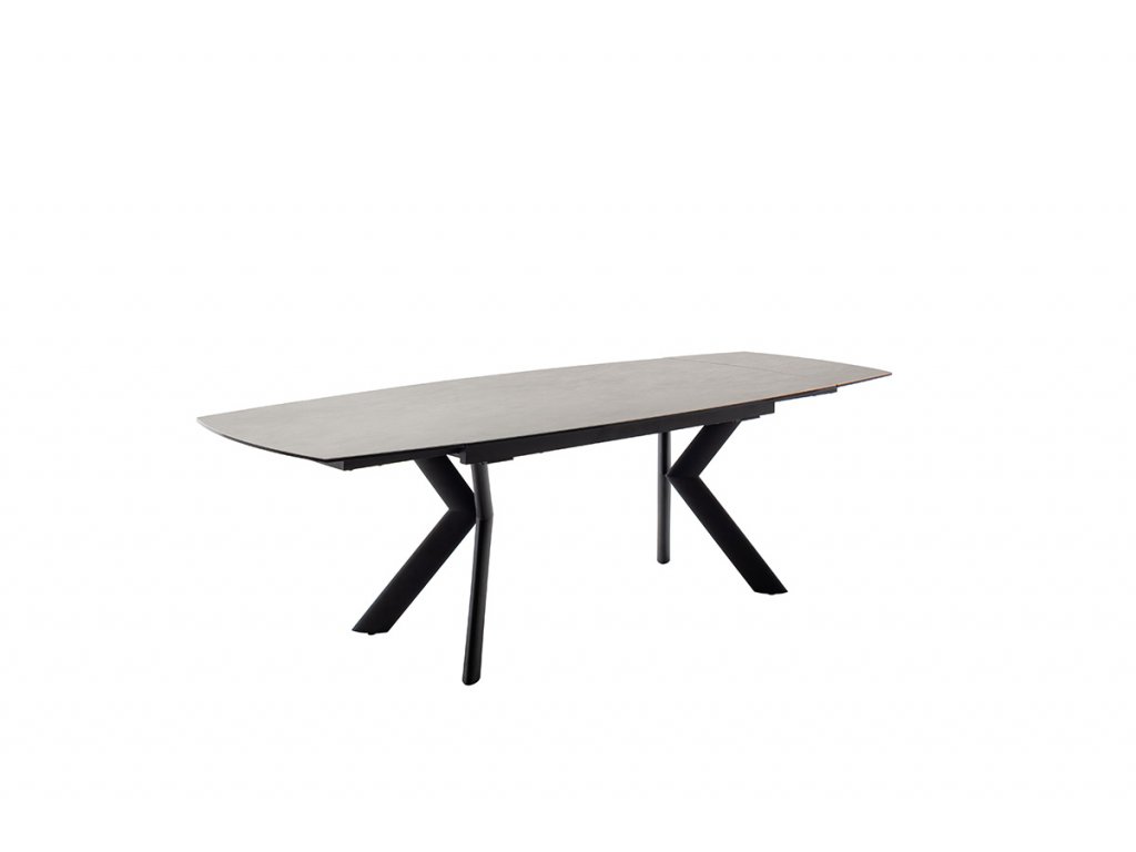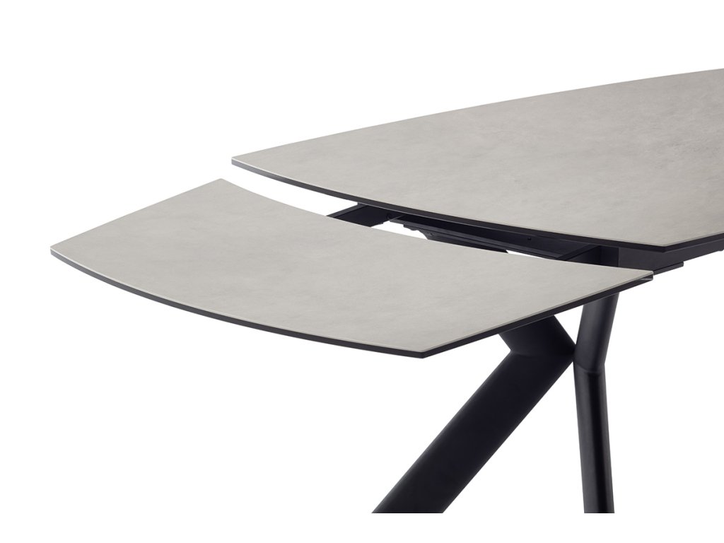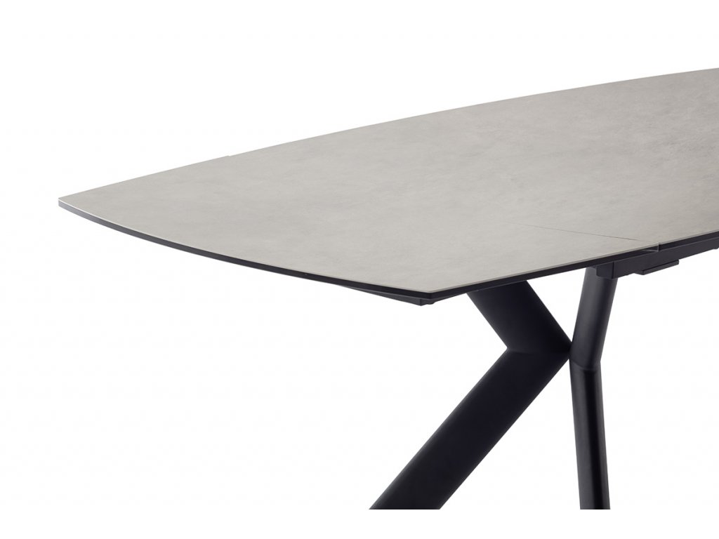 Jedálenský stôl Ossana zaujme svojím moderným dizajnom stolovej dosky a podnože. Zaručene dodá vášmu domovu štýlový nádych. Vďaka praktickým bočným výsuvným doskám môžete jeho dĺžku ako šibnutím čarovného prútika zväčšiť zo 180 cm na pôsobivých 260 cm. Oceníte to pri rodinných obedoch, ale aj pri dlhých večeroch s priateľmi. Dizajnová skosená podnož z kovu čiernej farby vytvára punc jedinečnosti a exkluzivity. Doska s celkovou hrúbkou 13 mm je kombináciou keramického materiálu a bezpečnostného skla. Je nielen esteticky atraktívna, ale aj mimoriadne odolná a jednoduchá na údržbu. Antracitové farebné prevedenie je už len malá čerešnička na torte. Dizajnový keramický jedálenský rozkladací stôl s čiernymi kovovými nohami.