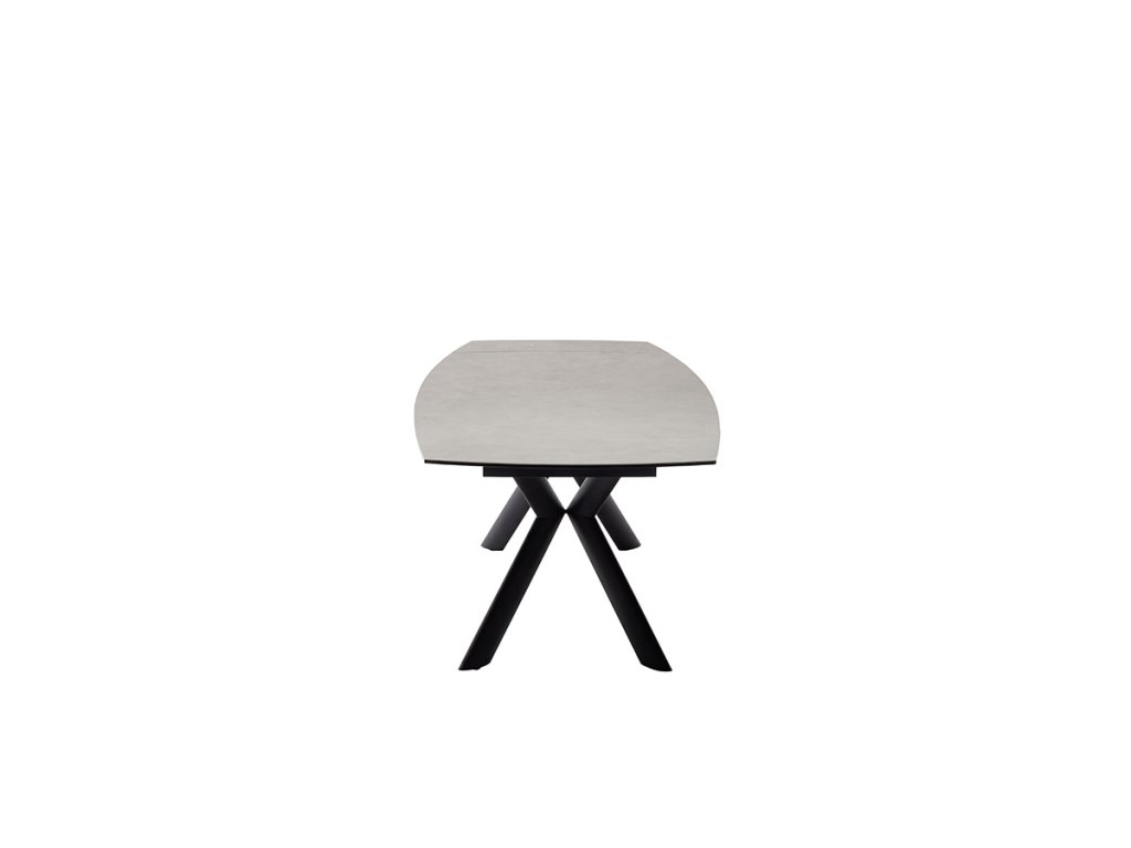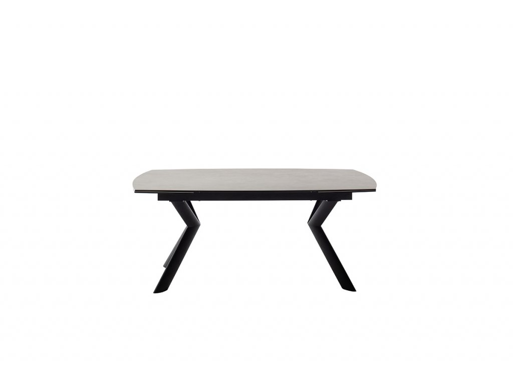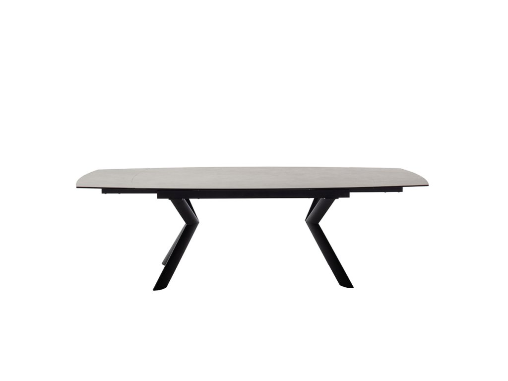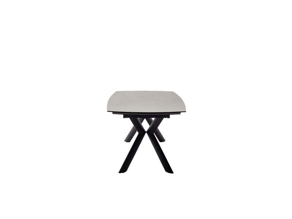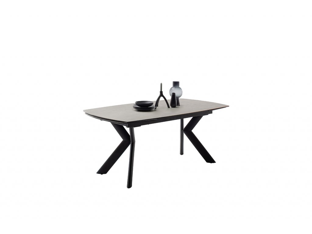 Jedálenský stôl Ossana zaujme svojím moderným dizajnom stolovej dosky a podnože. Zaručene dodá vášmu domovu štýlový nádych. Vďaka praktickým bočným výsuvným doskám môžete jeho dĺžku ako šibnutím čarovného prútika zväčšiť zo 180 cm na pôsobivých 260 cm. Oceníte to pri rodinných obedoch, ale aj pri dlhých večeroch s priateľmi. Dizajnová skosená podnož z kovu čiernej farby vytvára punc jedinečnosti a exkluzivity. Doska s celkovou hrúbkou 13 mm je kombináciou keramického materiálu a bezpečnostného skla. Je nielen esteticky atraktívna, ale aj mimoriadne odolná a jednoduchá na údržbu. Antracitové farebné prevedenie je už len malá čerešnička na torte. Dizajnový keramický jedálenský rozkladací stôl s čiernymi kovovými nohami.