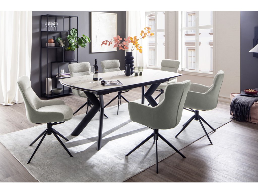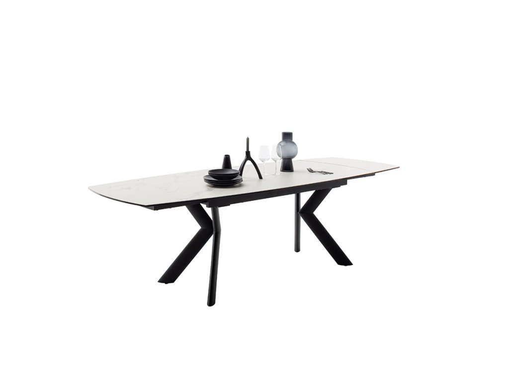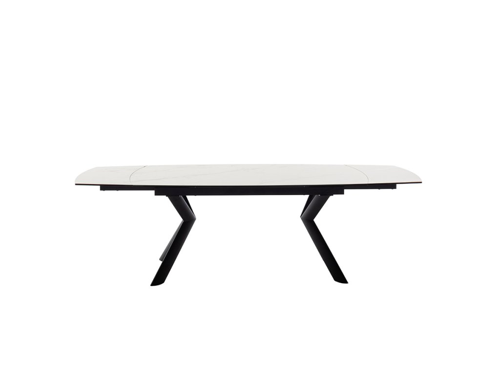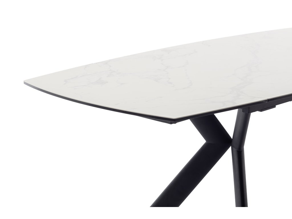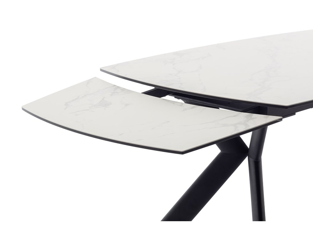 Jedálenský stôl Ossana zaujme svojím moderným dizajnom stolovej dosky a podnože. Zaručene dodá vášmu domovu štýlový nádych. Vďaka praktickým bočným výsuvným doskám môžete jeho dĺžku ako šibnutím čarovného prútika zväčšiť zo 180 cm na pôsobivých 260 cm. Oceníte to pri rodinných obedoch, ale aj pri dlhých večeroch s priateľmi. Dizajnová skosená podnož z kovu čiernej farby vytvára punc jedinečnosti a exkluzivity. Doska s celkovou hrúbkou 13 mm je kombináciou keramického materiálu a bezpečnostného skla. Je nielen esteticky atraktívna, ale aj mimoriadne odolná a jednoduchá na údržbu. Mramorová optika a krémové prevedenie je už len malá čerešnička na torte. Nadčasový jedálenský rozkladací stôl z keramiky s čiernymi kovovými nohami.