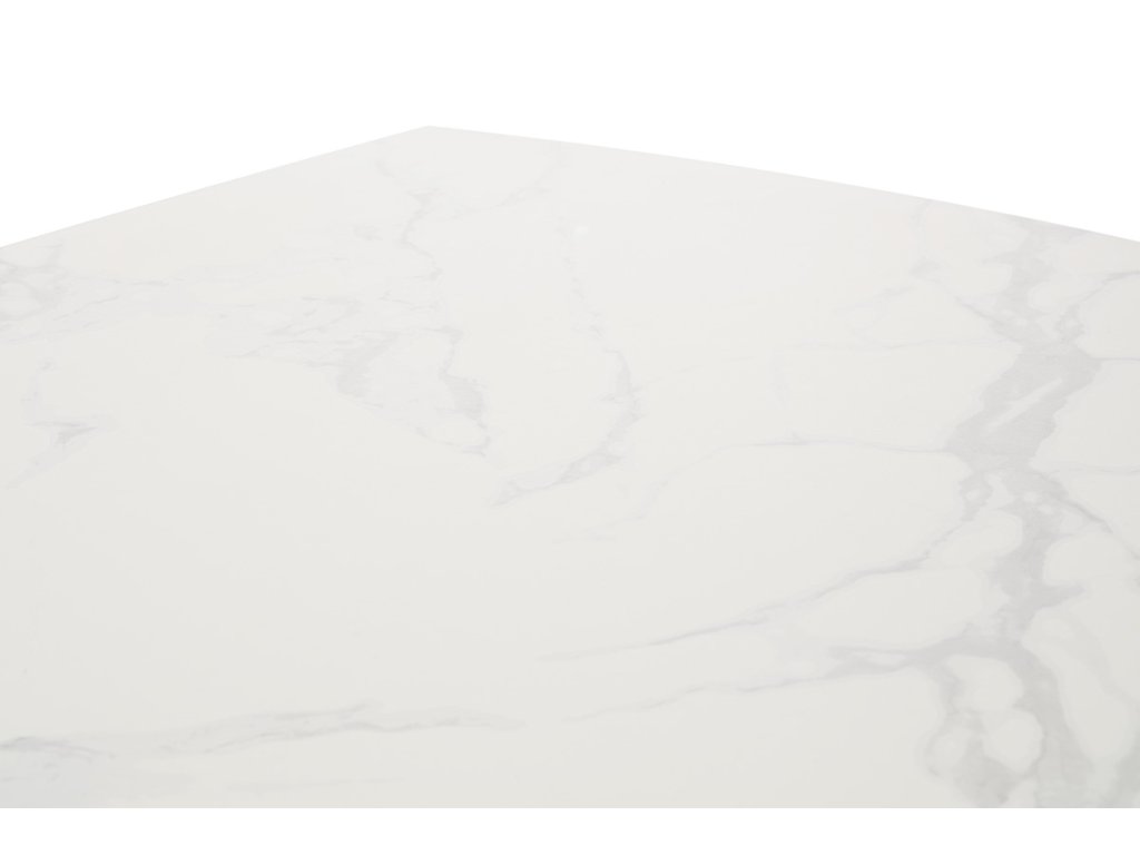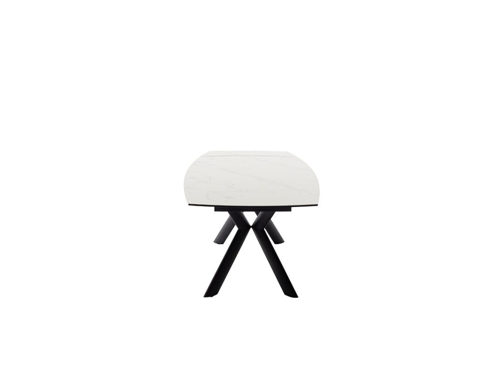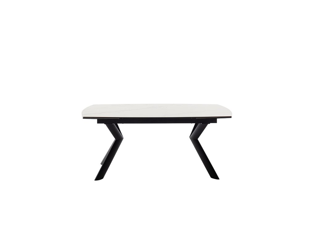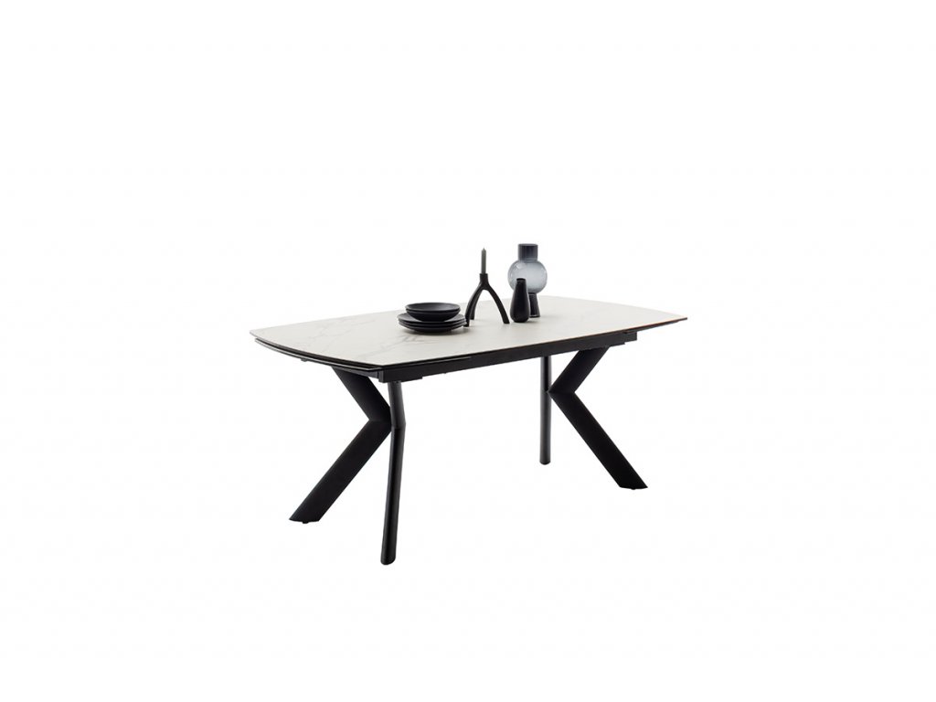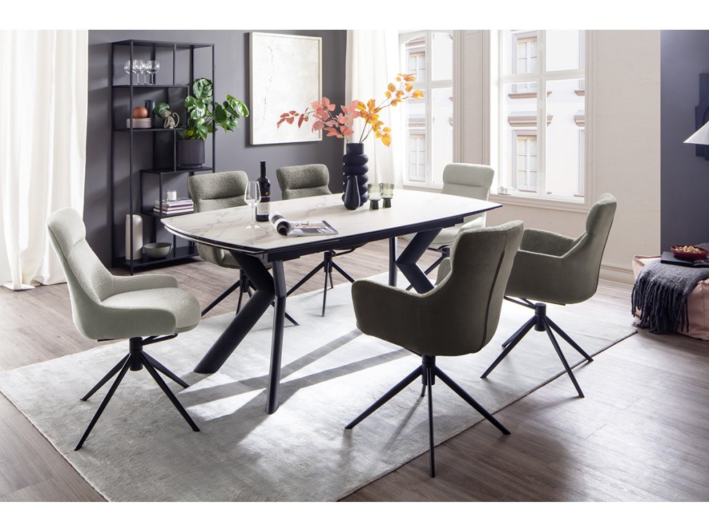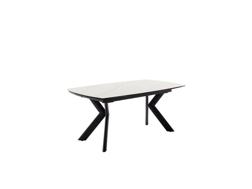 Jedálenský stôl Ossana zaujme svojím moderným dizajnom stolovej dosky a podnože. Zaručene dodá vášmu domovu štýlový nádych. Vďaka praktickým bočným výsuvným doskám môžete jeho dĺžku ako šibnutím čarovného prútika zväčšiť zo 180 cm na pôsobivých 260 cm. Oceníte to pri rodinných obedoch, ale aj pri dlhých večeroch s priateľmi. Dizajnová skosená podnož z kovu čiernej farby vytvára punc jedinečnosti a exkluzivity. Doska s celkovou hrúbkou 13 mm je kombináciou keramického materiálu a bezpečnostného skla. Je nielen esteticky atraktívna, ale aj mimoriadne odolná a jednoduchá na údržbu. Mramorová optika a krémové prevedenie je už len malá čerešnička na torte. Nadčasový jedálenský rozkladací stôl z keramiky s čiernymi kovovými nohami.