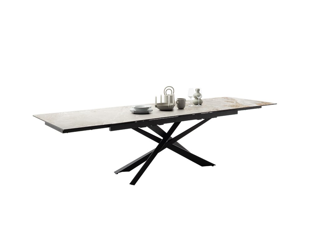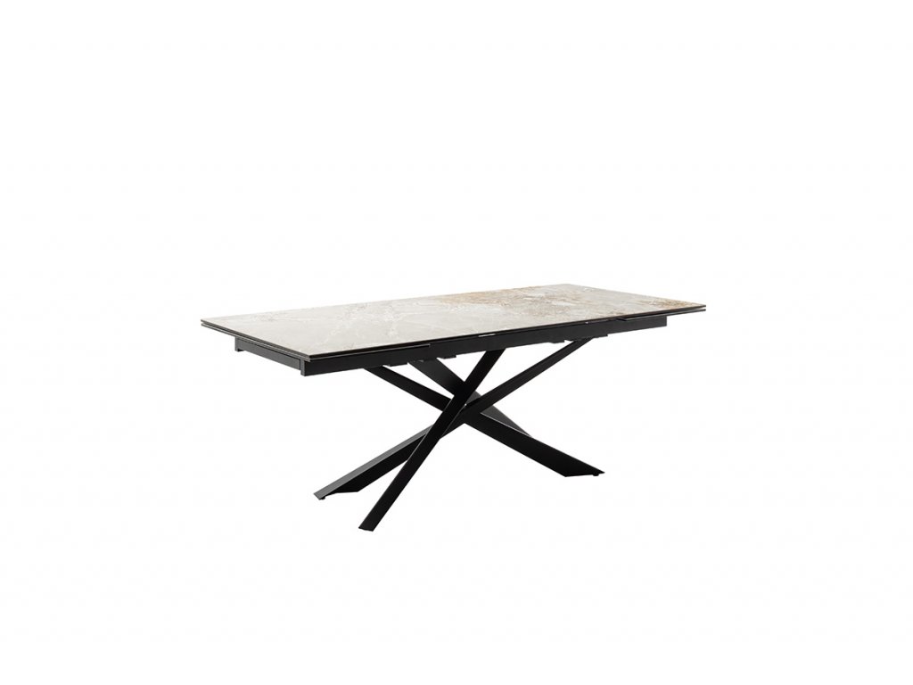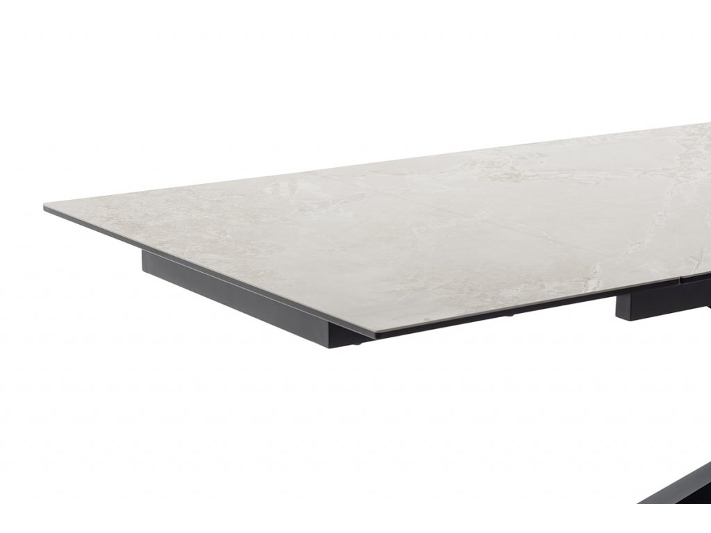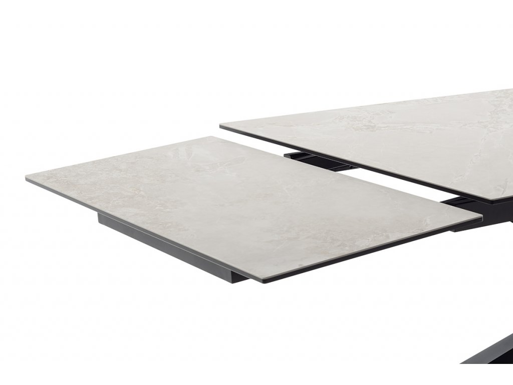 Jedálenský rozkladací stôl Tesero II má základné rozmery dosky približne 200 x 95 cm. Vďaka funkčnému rozkladaciemu mechanizmu na oboch stranách sa však dá jednoducho rozšíriť až o celkovo 100 cm. Doska stola je z osvedčenej keramiky sivej farby v optike mramoru a bezpečnostného skla. Táto kombinácia prináša extrémnu odolnosť a údržbu bez námahy. Podnož je z kovu čiernej matnej farby. Nepôsobí však vôbec nenápadne, práve naopak. Svojím lúčovitým vzhľadom upúta nielen svojho majiteľa, ale aj prípadnú návštevu.