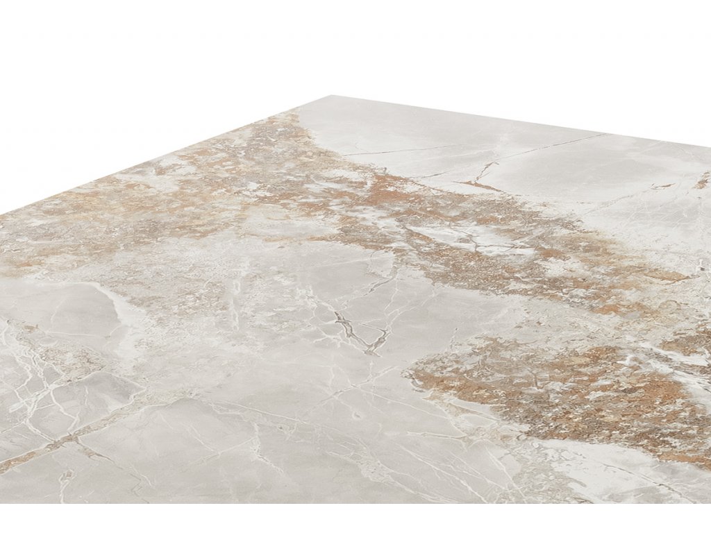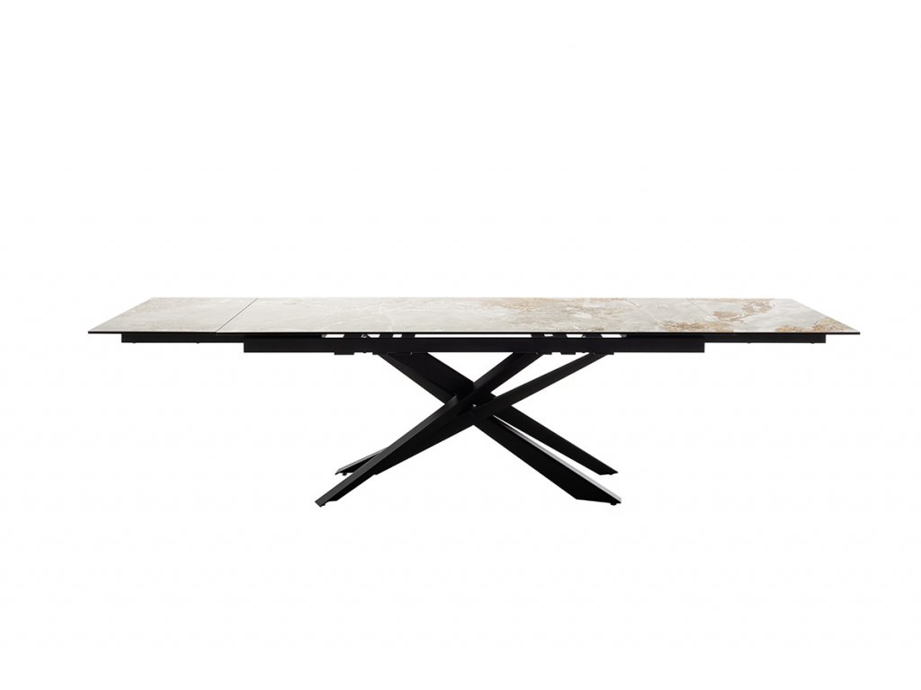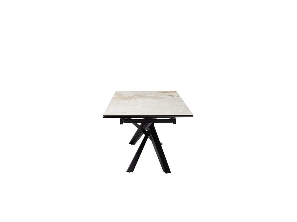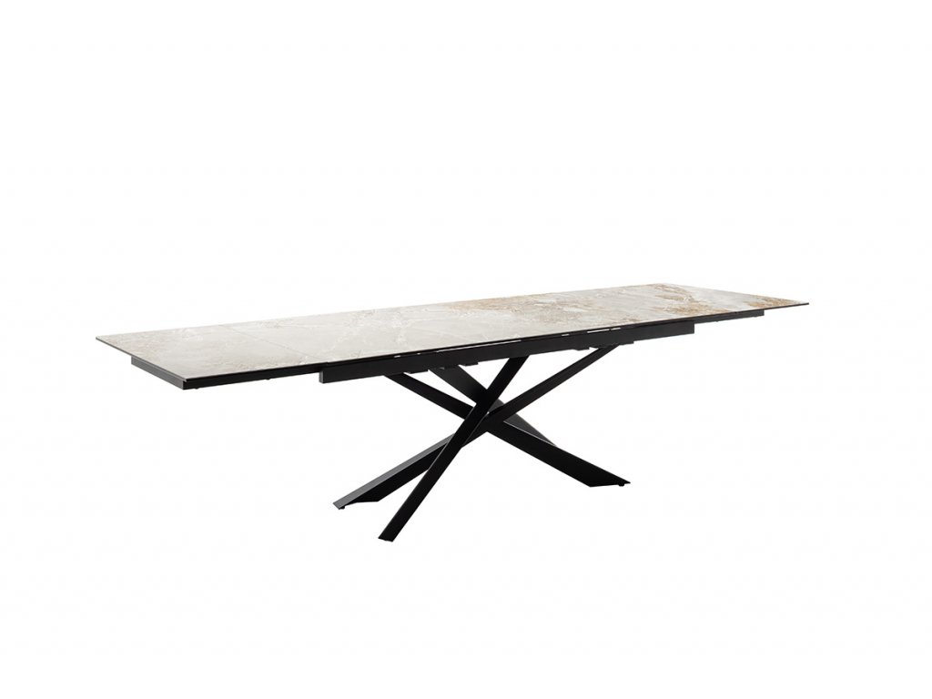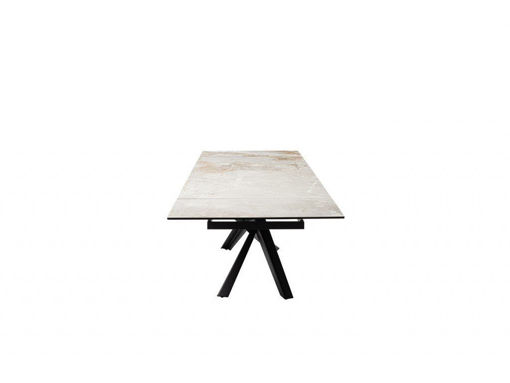 Jedálenský rozkladací stôl Tesero II má základné rozmery dosky približne 200 x 95 cm. Vďaka funkčnému rozkladaciemu mechanizmu na oboch stranách sa však dá jednoducho rozšíriť až o celkovo 100 cm. Doska stola je z osvedčenej keramiky sivej farby v optike mramoru a bezpečnostného skla. Táto kombinácia prináša extrémnu odolnosť a údržbu bez námahy. Podnož je z kovu čiernej matnej farby. Nepôsobí však vôbec nenápadne, práve naopak. Svojím lúčovitým vzhľadom upúta nielen svojho majiteľa, ale aj prípadnú návštevu.