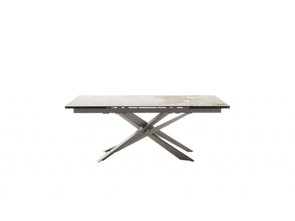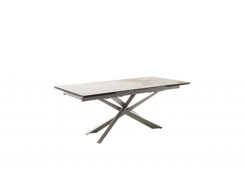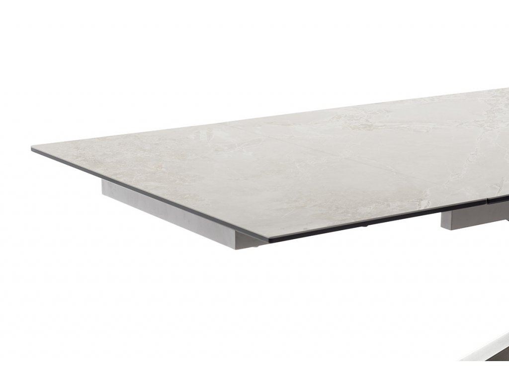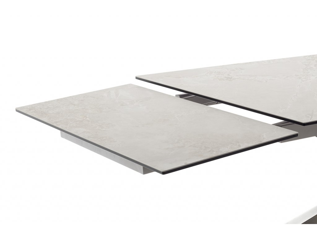 Jedálenský rozkladací stôl Tesero má základné rozmery dosky približne 200 x 95 cm. Vďaka funkčnému mechanizmu na oboch stranách sa však dá jednoducho rozšíriť až o celkovo 100 cm. Doska stola je z osvedčenej keramiky v optike mramoru sivej farby a bezpečnostného skla. Táto kombinácia prináša extrémnu odolnosť a údržbu bez námahy. Podnož z brúsenej nehrdzavejúcej ocele svojím nadčasovým vzhľadom upúta nielen svojho majiteľa, ale aj prípadnú návštevu.