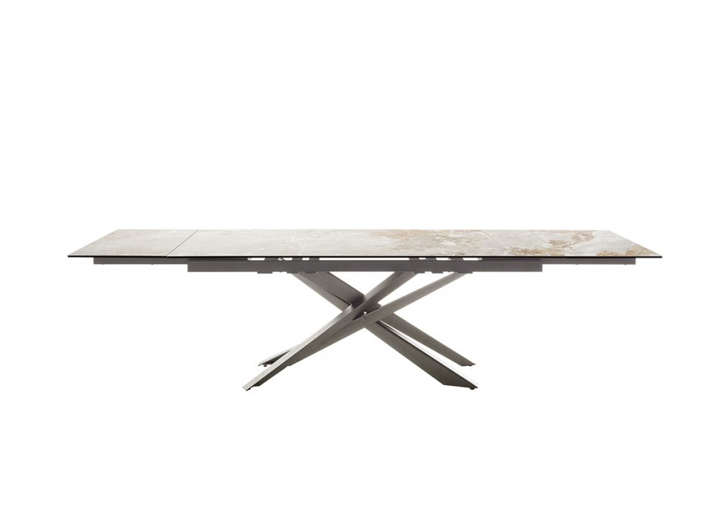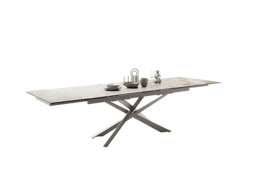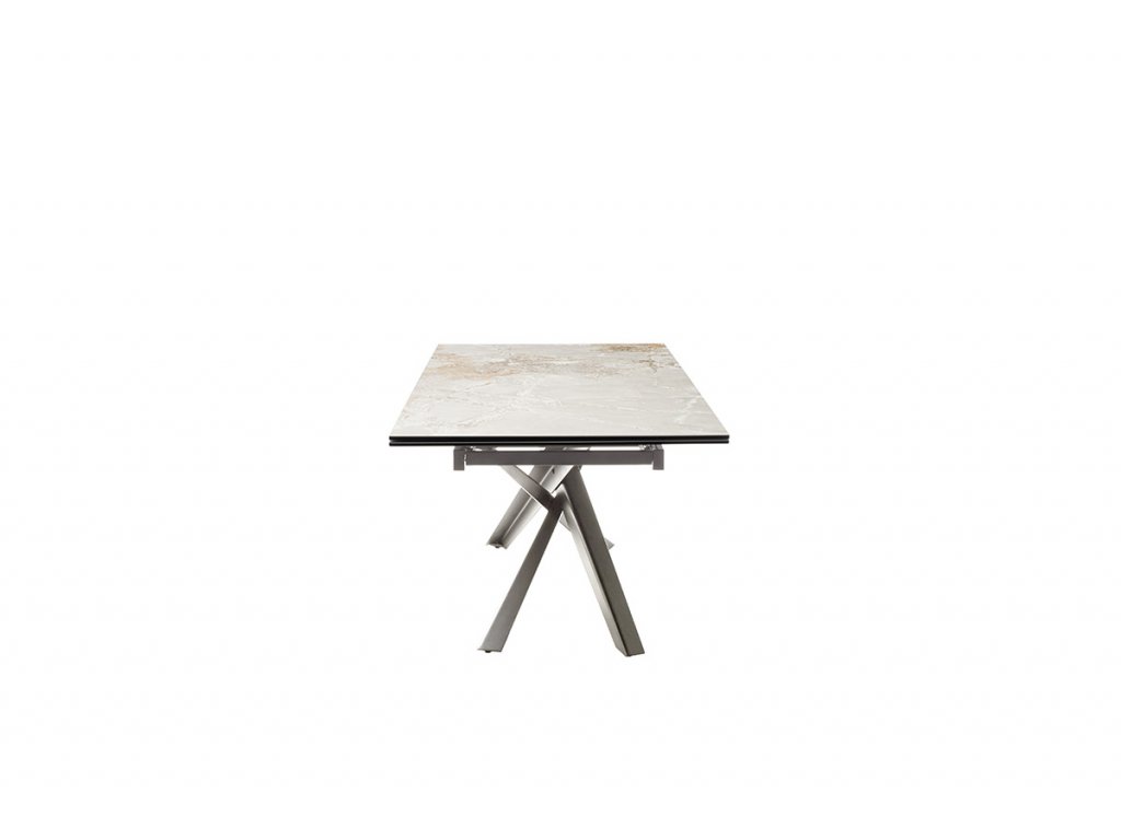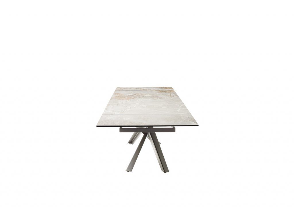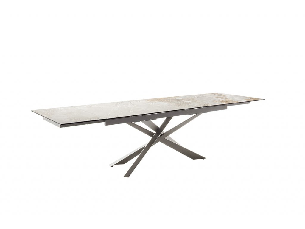 Jedálenský rozkladací stôl Tesero má základné rozmery dosky približne 200 x 95 cm. Vďaka funkčnému mechanizmu na oboch stranách sa však dá jednoducho rozšíriť až o celkovo 100 cm. Doska stola je z osvedčenej keramiky v optike mramoru sivej farby a bezpečnostného skla. Táto kombinácia prináša extrémnu odolnosť a údržbu bez námahy. Podnož z brúsenej nehrdzavejúcej ocele svojím nadčasovým vzhľadom upúta nielen svojho majiteľa, ale aj prípadnú návštevu.