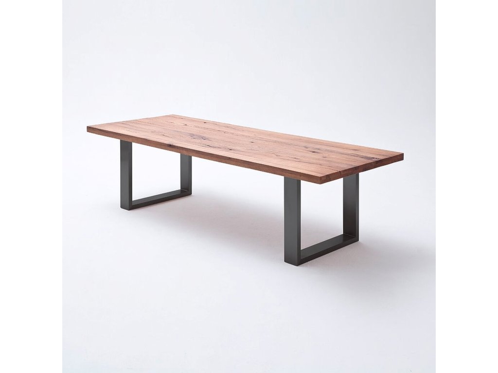 Na jedálenskom stole Castello vás neupúta len jeho surový masívny vzhľad. Aj tento stôl patrí ako napríklad stôl Matras medzi jedinečné unikáty. Štyri druhy stromov, štyri rôzne prevedenia. Každý zo stromov, ktoré boli použité pri výrobe rastie v iných klimatických podmienkach, čo sa odráža na jedinečnej farebnosti, vzore, zakrivení a trhlinách. Jednoducho ORIGINÁL. Masívnej dubovej doske stola s hrúbkou 6 cm poskytuje pevnú podporu dvojica kovových podnoží v tvare písmena U nalakovaných lakom vo farbe antracit.