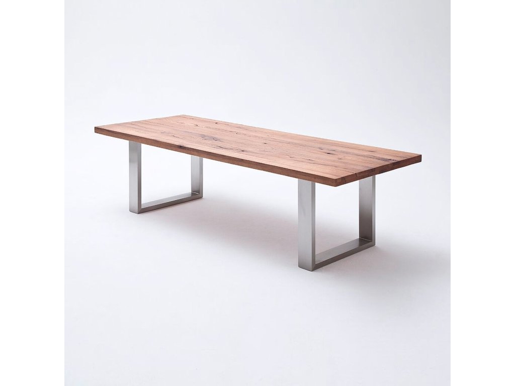 Na jedálenskom stole Castello vás neupúta len jeho surový masívny vzhľad. Aj tento stôl patrí ako napríklad stôl Matras medzi jedinečné unikáty. Štyri druhy stromov, štyri rôzne prevedenia. Každý zo stromov, ktoré boli použité pri výrobe rastie v iných klimatických podmienkach, čo sa odráža na jedinečnej farebnosti, vzore, zakrivení a trhlinách. Jednoducho ORIGINÁL. Masívnej dubovej doske stola s hrúbkou 6 cm poskytuje pevnú podporu dvojica podnoží v tvare písmena U z nerezovej ocele.