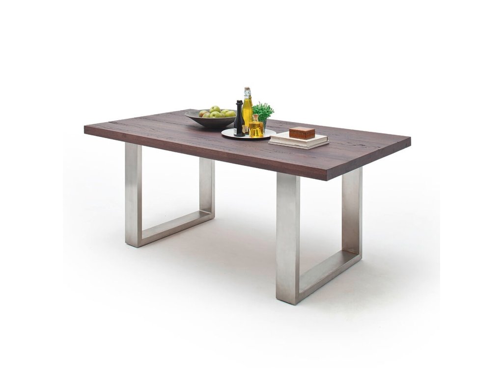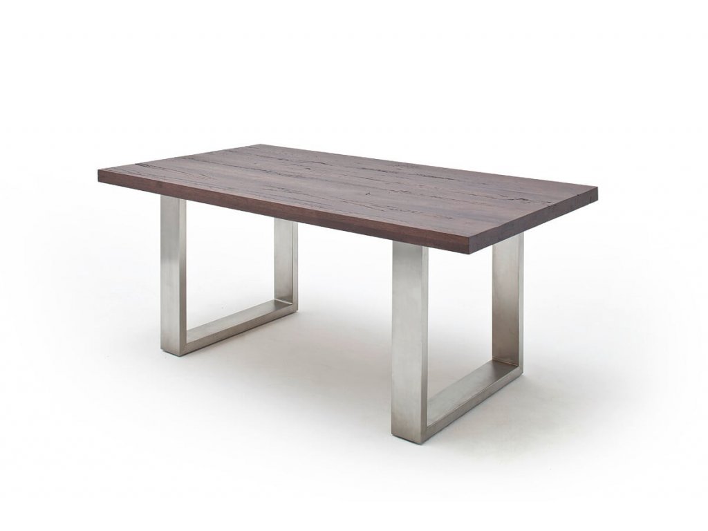Na jedálenskom stole Castello vás neupúta len jeho surový masívny vzhľad. Aj tento stôl patrí ako napríklad stôl Matras medzi jedinečné unikáty. Štyri druhy stromov, štyri rôzne prevedenia. Každý zo stromov, ktoré boli použité pri výrobe rastie v iných klimatických podmienkach, čo sa odráža na jedinečnej farebnosti, vzore, zakrivení a trhlinách. Jednoducho ORIGINÁL. Masívnej dubovej doske stola s hrúbkou 6 cm poskytuje pevnú podporu dvojica podnoží v tvare písmena U z nerezovej ocele.