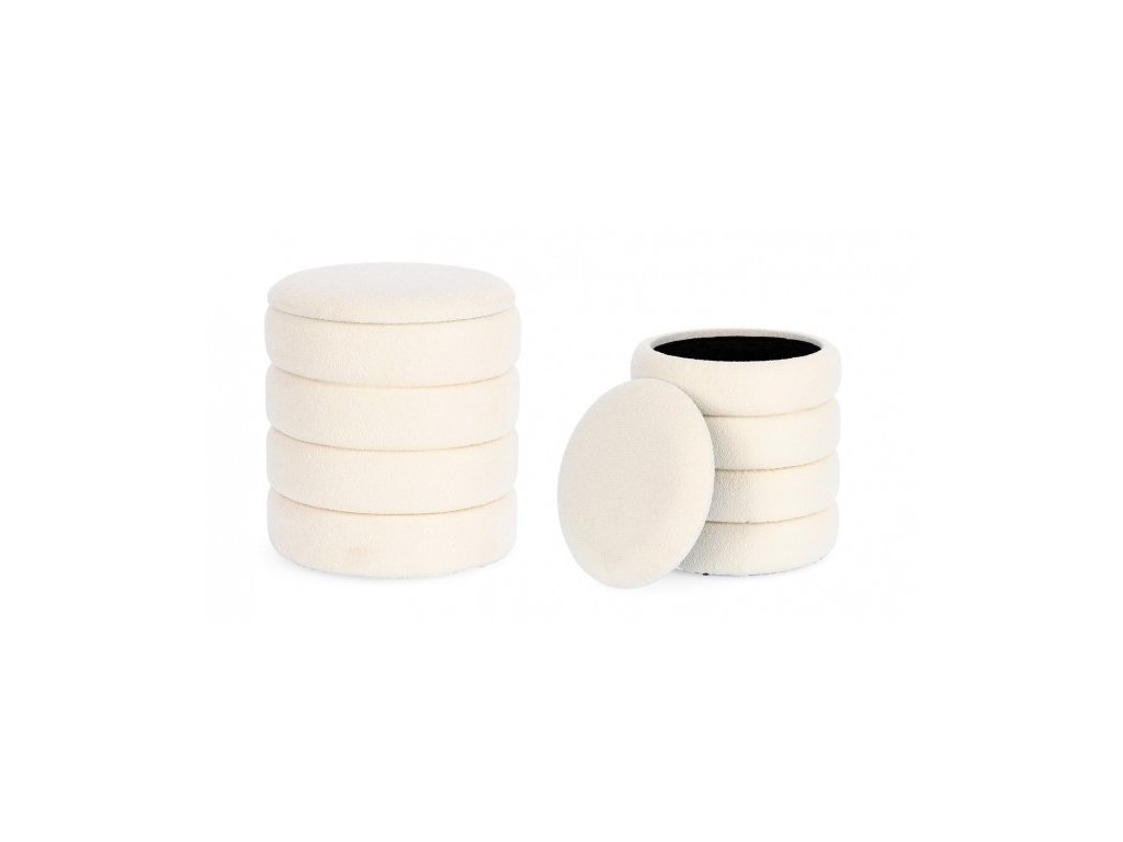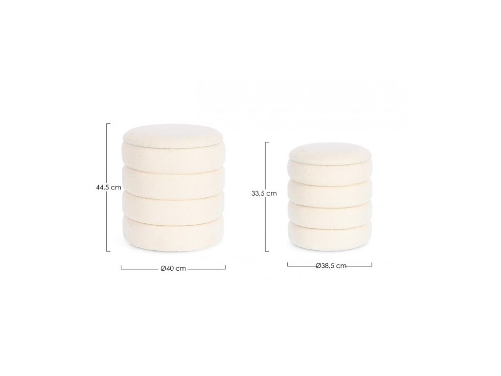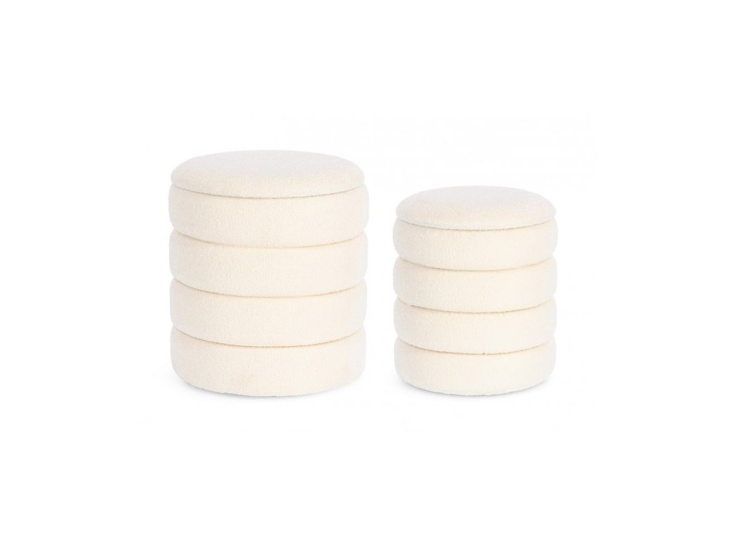 Set úložných pufov s buclé efektom bude nielen elegantným doplnkom do vášho interiéru, ale aj praktickým riešením vďaka úložnému priestoru. Vďaka originálnemu dizajnu, ktorý má vzhľad prstencov bude ideálnym doplnkom do každej obývacej izby, spálne alebo pracovne.