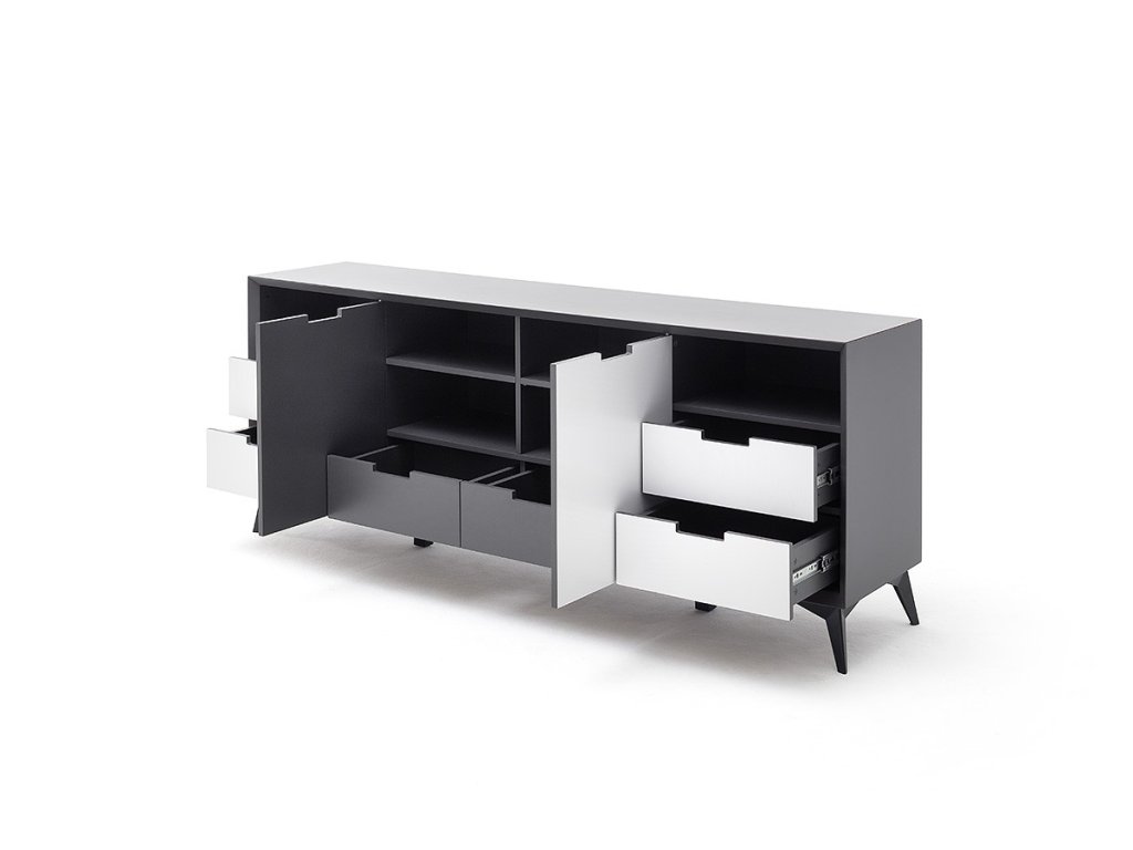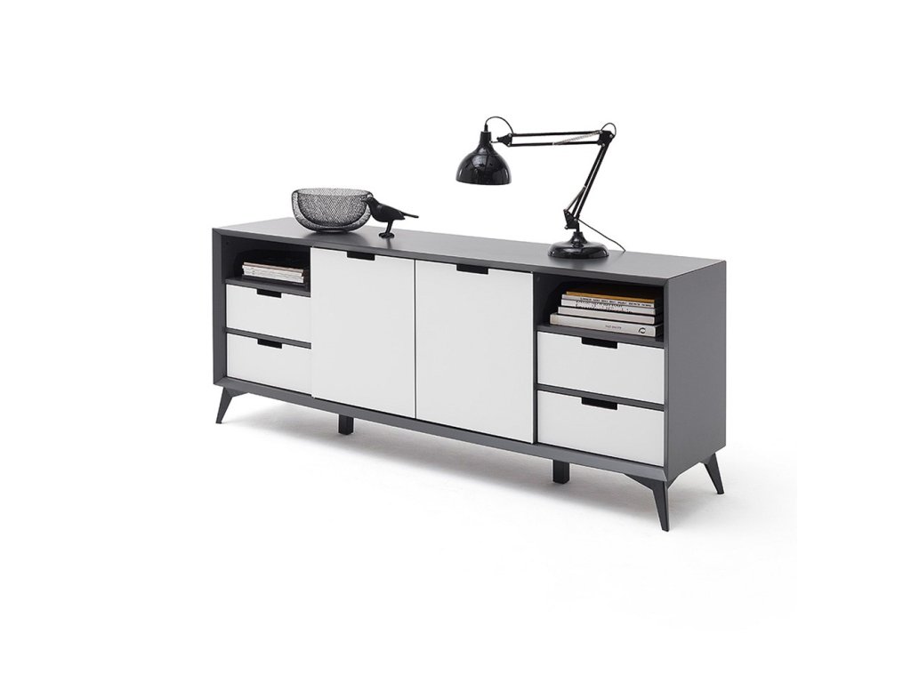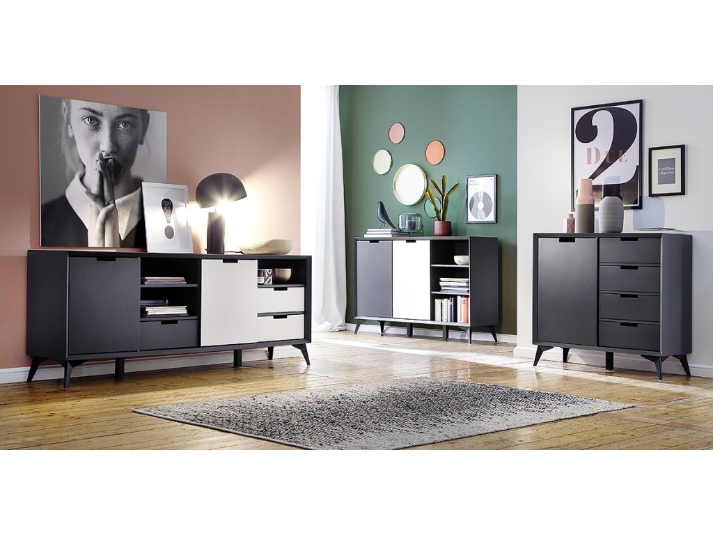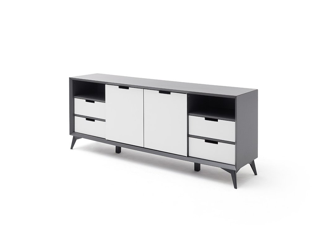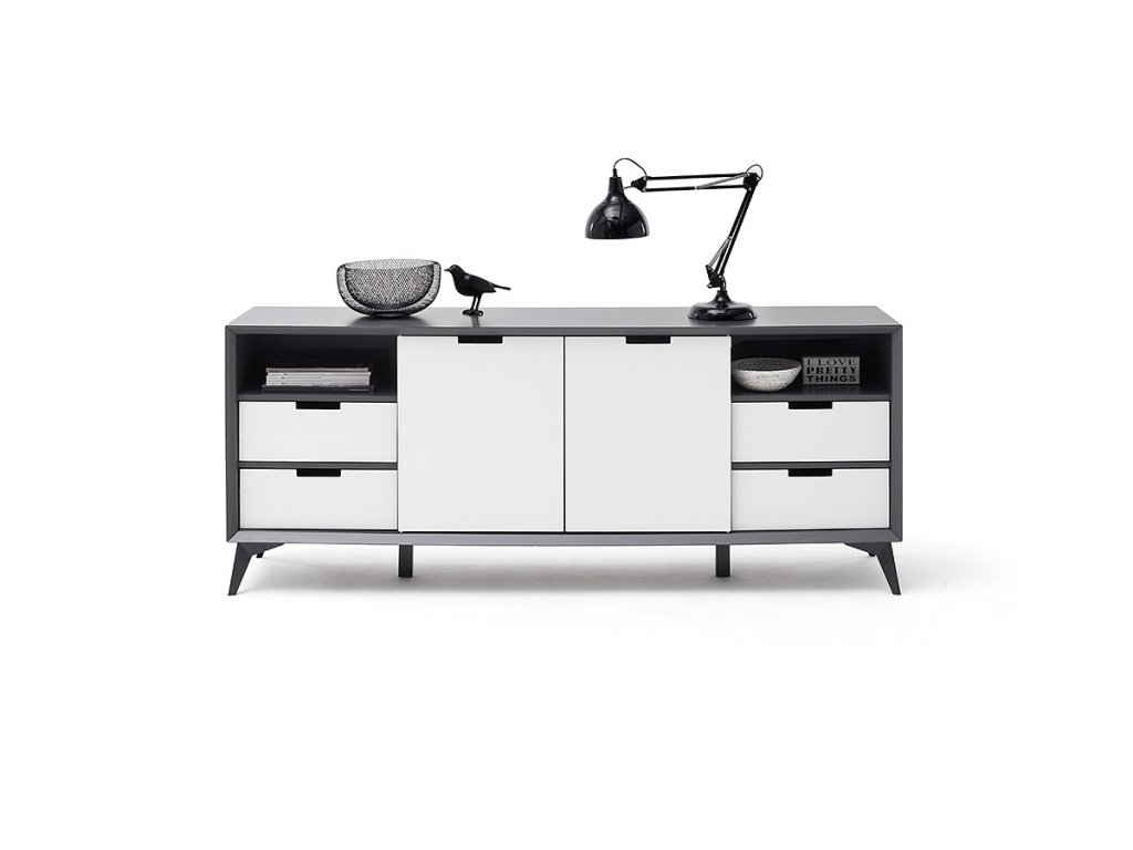 Nadčasová komoda v jedinečnom dizajne ktorý sa hlavne vyznačuje kombináciou farieb sivej a bielej. Komoda stojí na vyvýšených nohách čo umožňuje dobrý prístup pod komodu. Komoda disponuje skrinkami a zásuvkami.