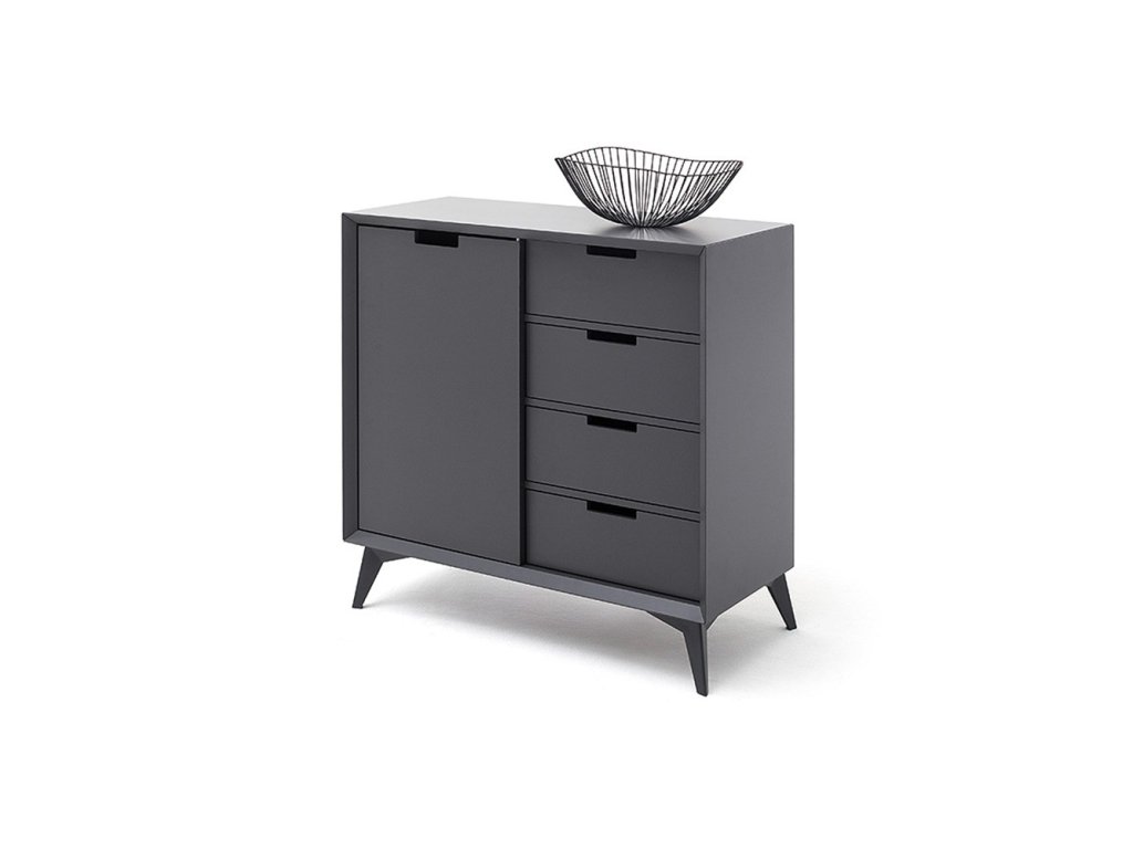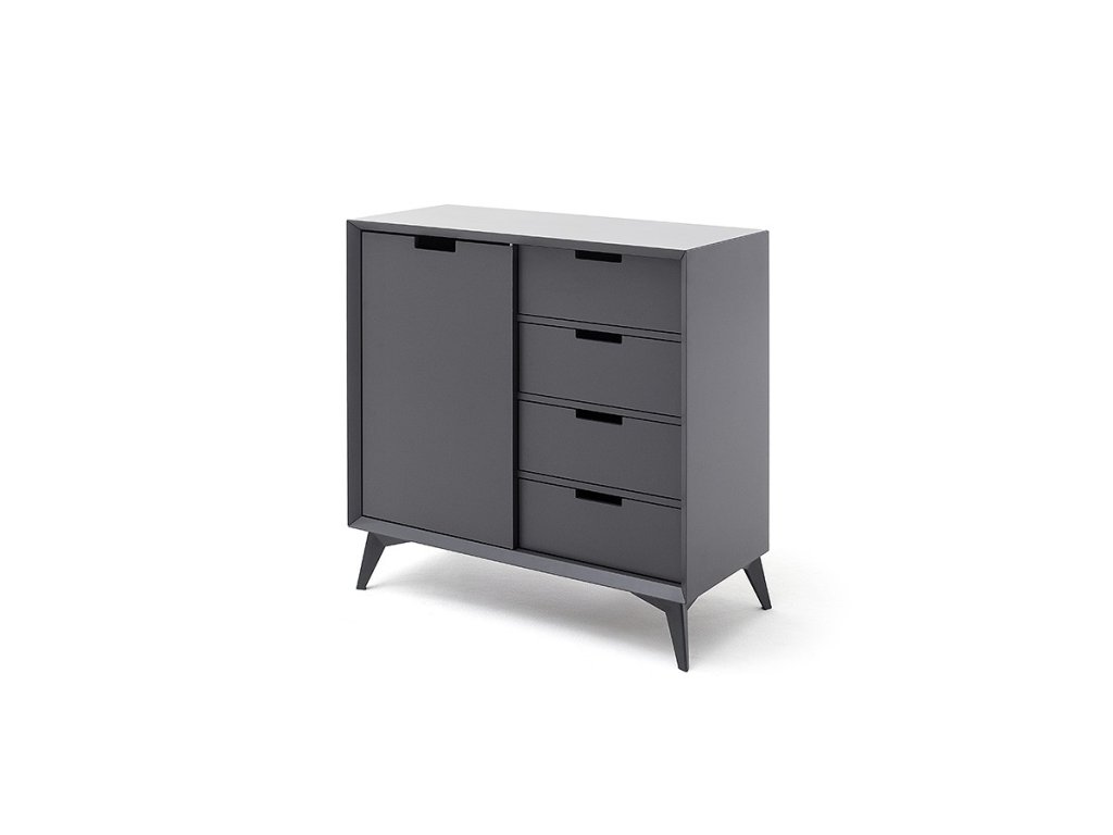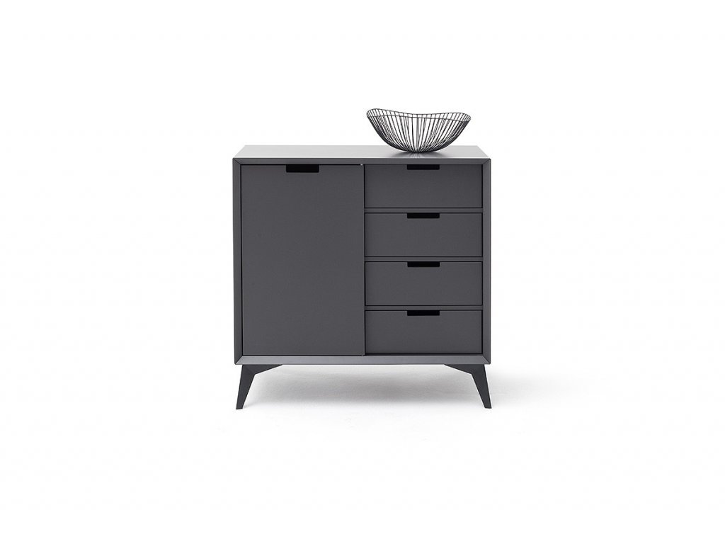 Nadčasová komoda v jedinečnom dizajne ktorý sa hlavne vyznačuje kombináciou farieb sivej a bielej. Komoda stojí na vyvýšených nohách čo umožňuje dobrý prístup pod komodu. Komoda disponuje skrinkami a zásuvkami.