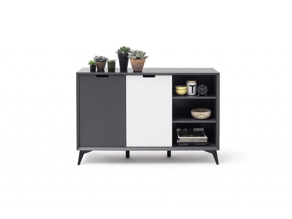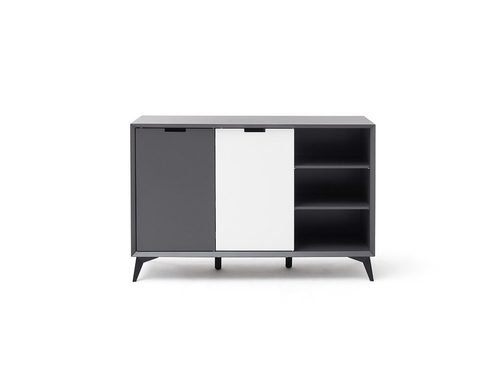 Nadčasová komoda v jedinečnom dizajne ktorý sa hlavne vyznačuje kombináciou farieb sivej a bielej. Komoda stojí na vyvýšených nohách čo umožňuje dobrý prístup pod komodu. Komoda disponuje skrinkami a zásuvkami.