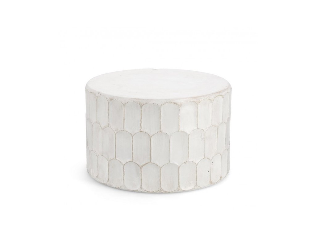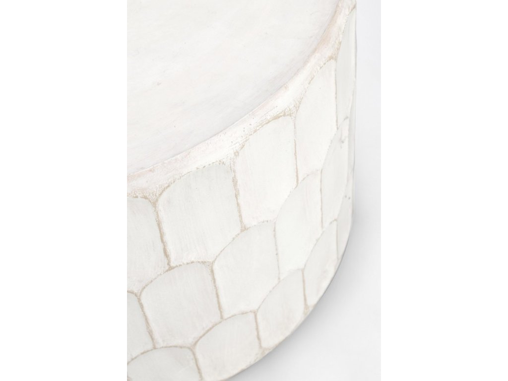 Povrch stolíka je upravený do matnej bielej farby s jemnými nádychmi patiny, čo mu dodáva nadčasový vzhľad a vytvára dojem, akoby tento kúsok patril medzi starodávne sochárske diela. Jedinečný geometrický vzor je zároveň dostatočne decentný, aby ladil s rôznymi štýlmi interiéru, od moderného až po rustikálny.