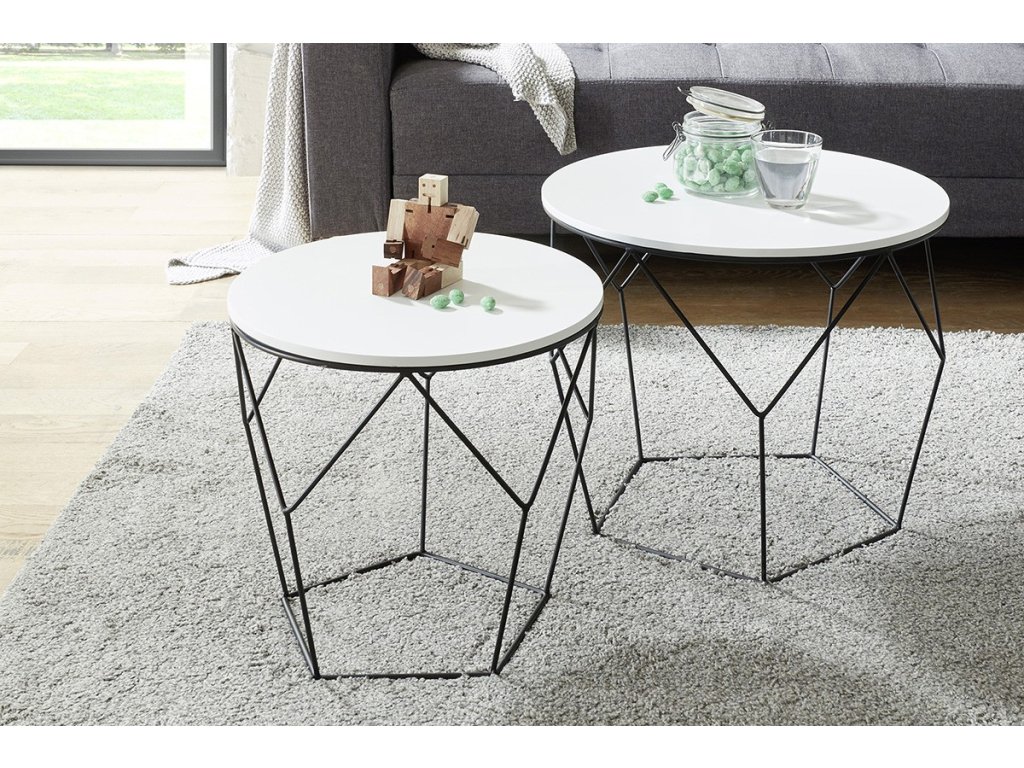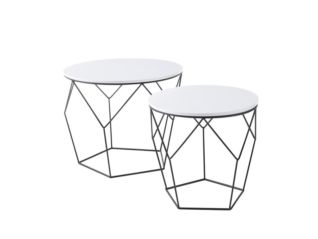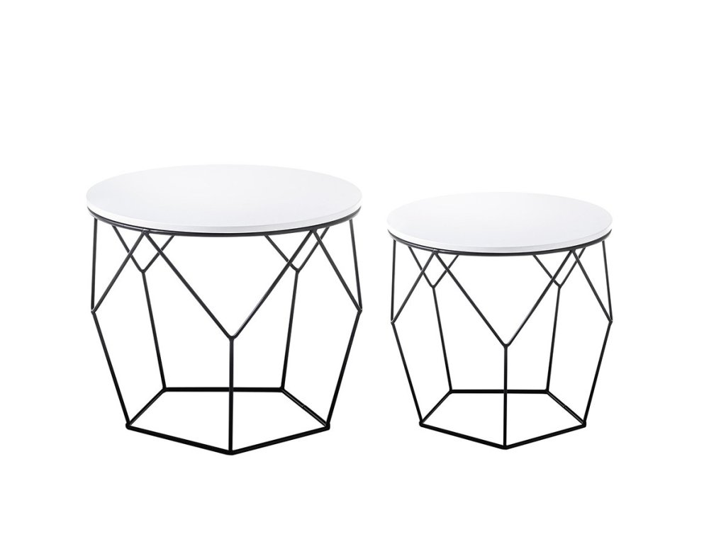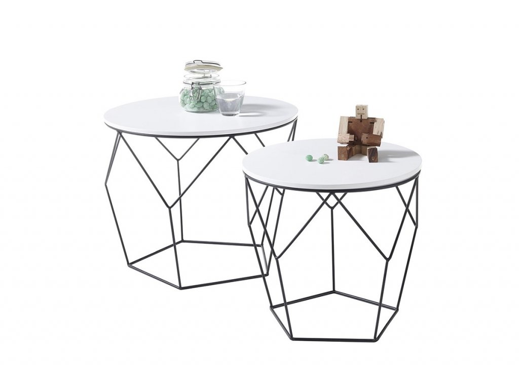 Zostava 2 stolíkov o dvoch rôznych rozmeroch zaujme priemyselným a zároveň jednoduchým dizajnom. Podnož stolíkov tvorí kovová konštrukcia v čiernej farbe. Dosku tvorí lakovaná MDF doska v bielom matnom prevedení.