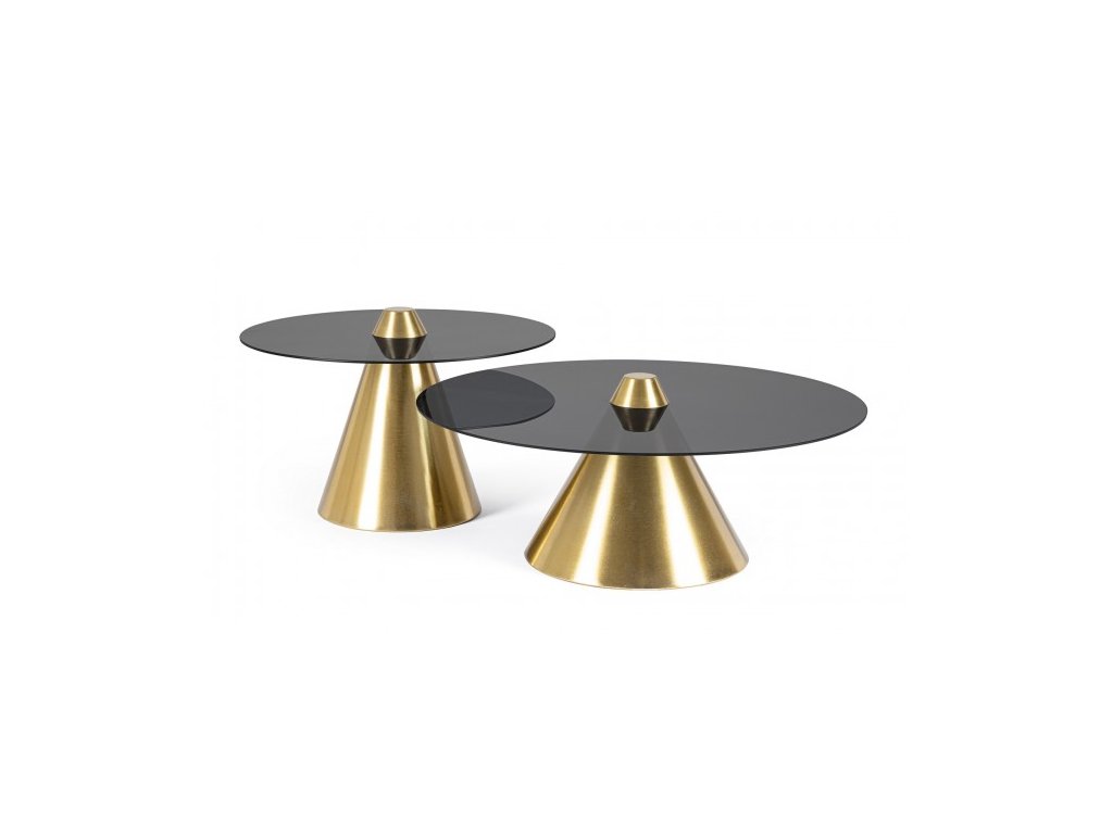 Moderný set dvoch konferenčných stolíkov. Vrchnú dosku stolov tvorí tvrdené tvarované sklo, nohy stolov tvorí lakovaná oceľ v zlatej farbe. Okrúhle konferenčné stolíky sa hodia do modernej obývačky či haly.