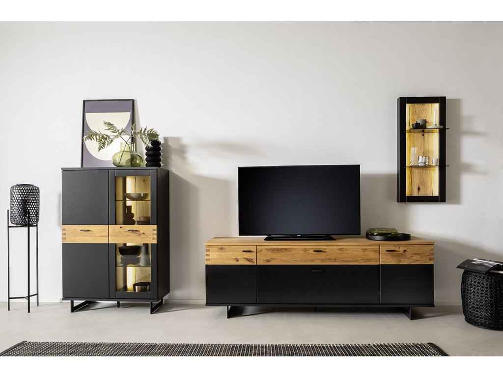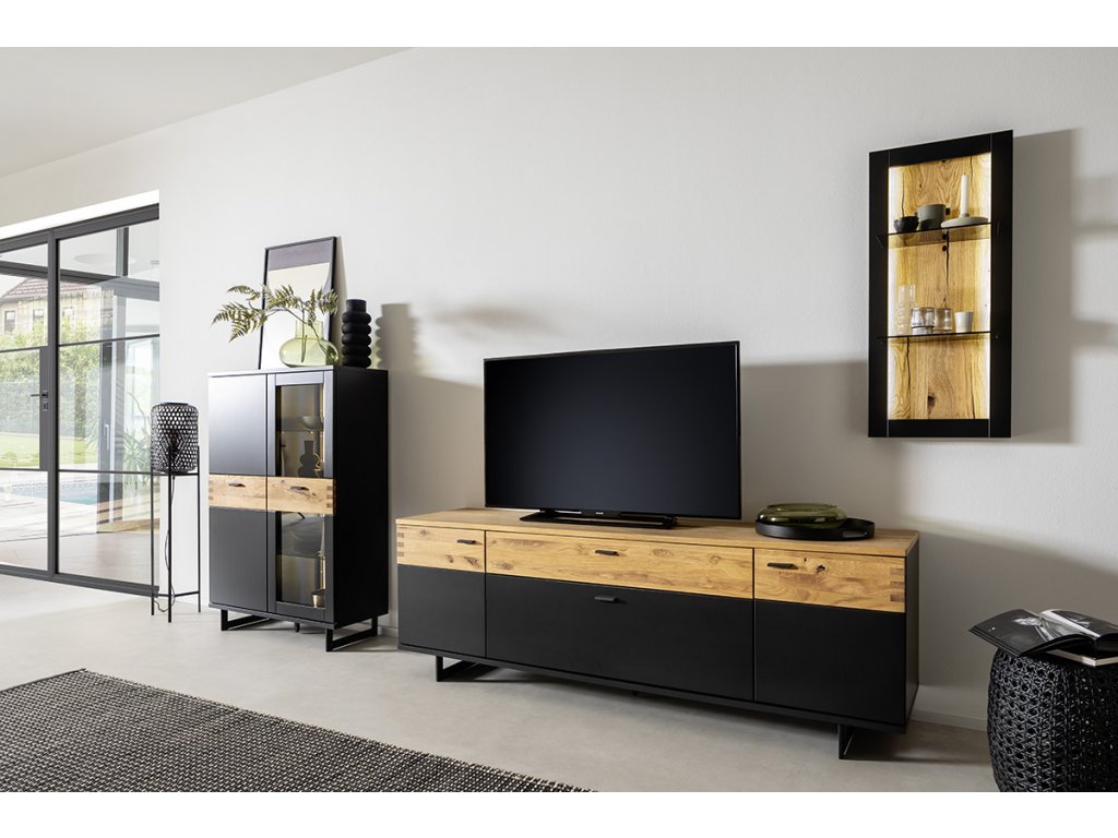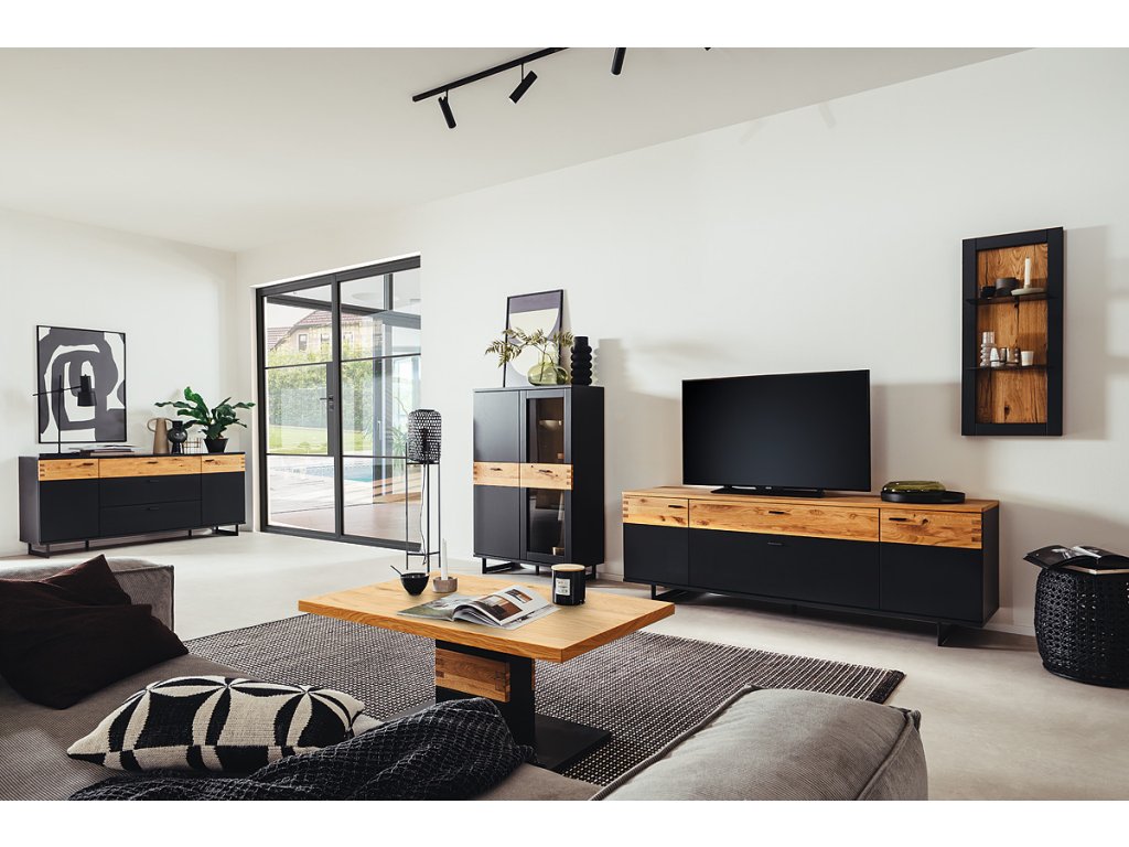 | Materiál: | MDF čiernosivá melamín, dubová dyha olejovaná, sklo |