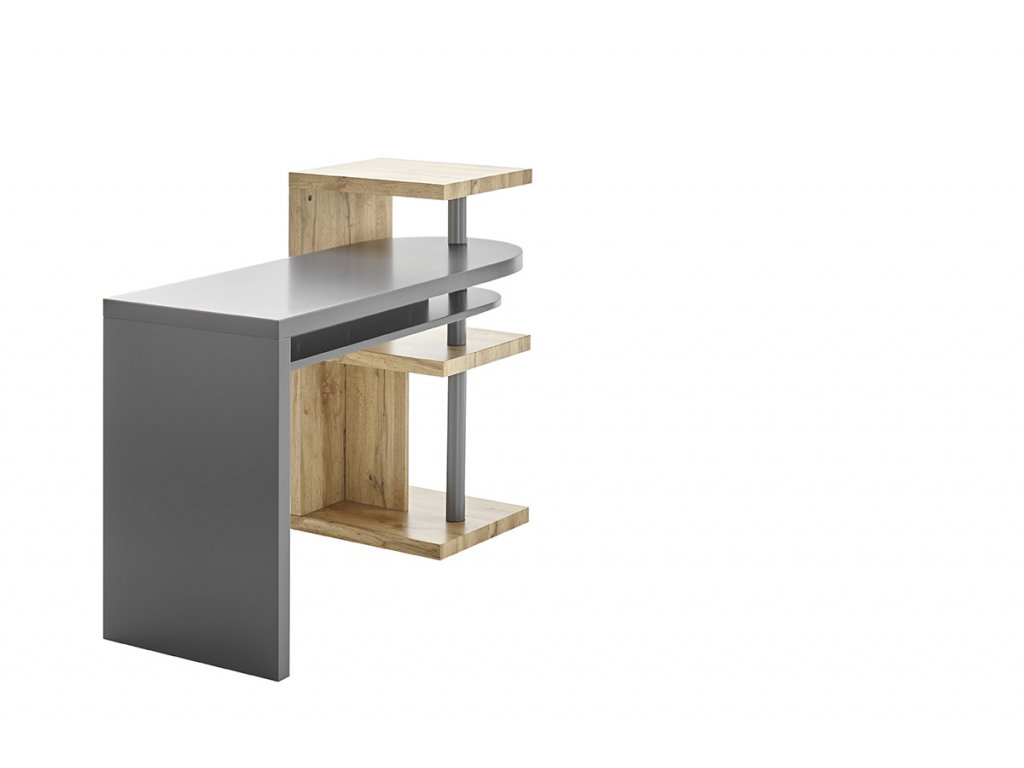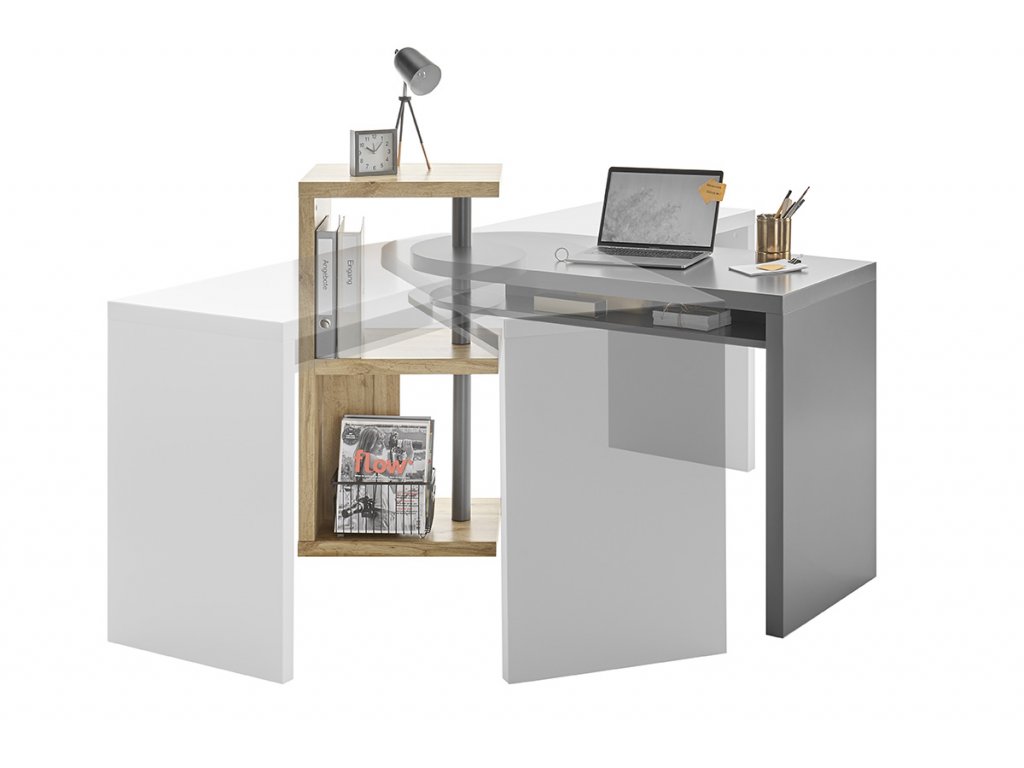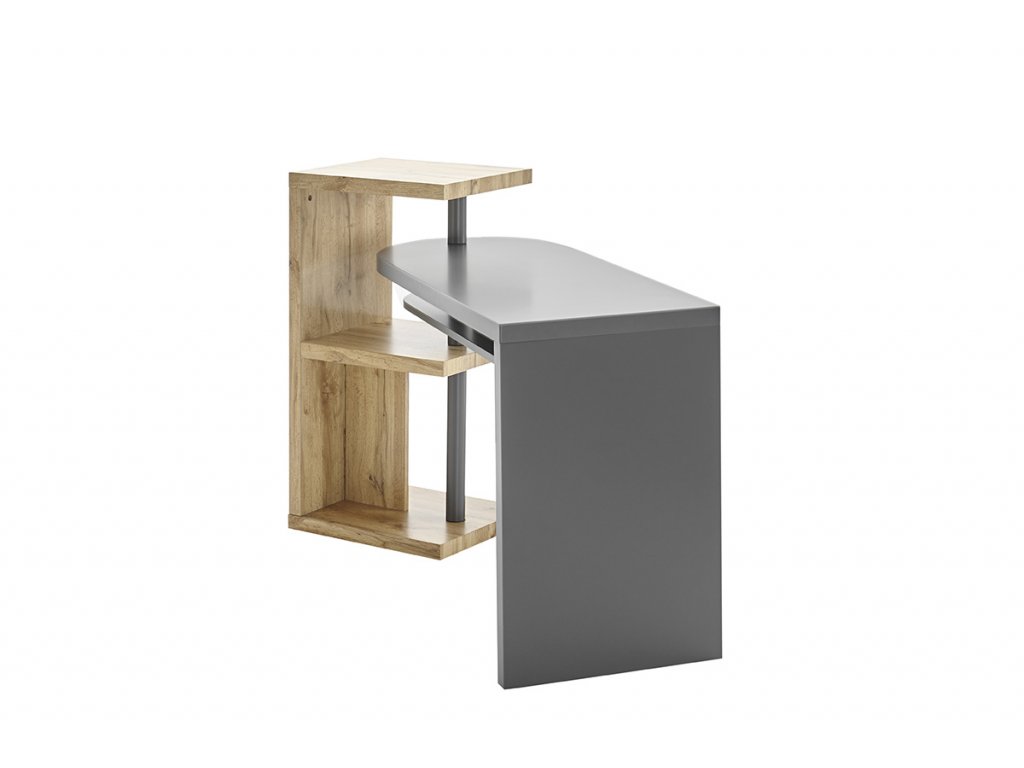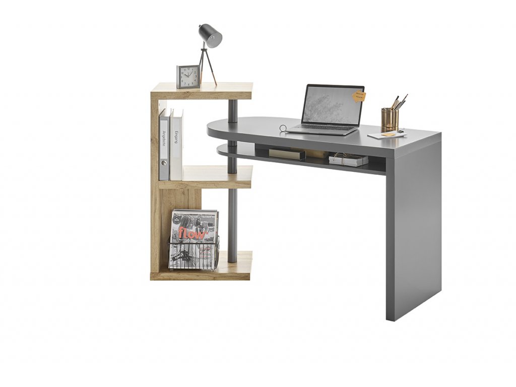 Uhlový písací stôl Moura v matnom sivom laku a dubovom prevedení dokonale spája funkčnosť a dizajn do jedného celku. Je ideálnym moderným nábytkom do pracovne. Osobitnou zaujímavosťou je praktická funkcia otáčania stola. Práve preto je mimoriadne prispôsobivý. Vďaka trom priehradkám prináša dostatok úložného priestoru. Sofistikovaný a neobvyklý stôl, ktorý dokonale vynikne v moderných priestoroch.