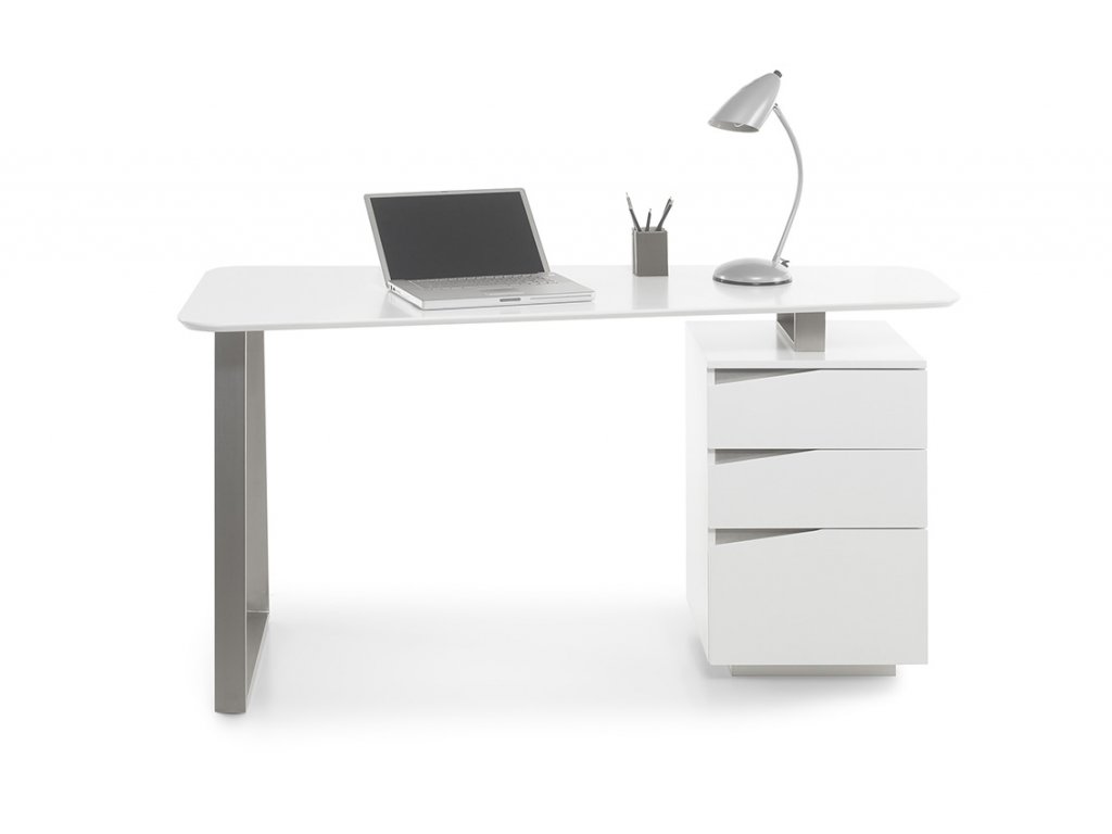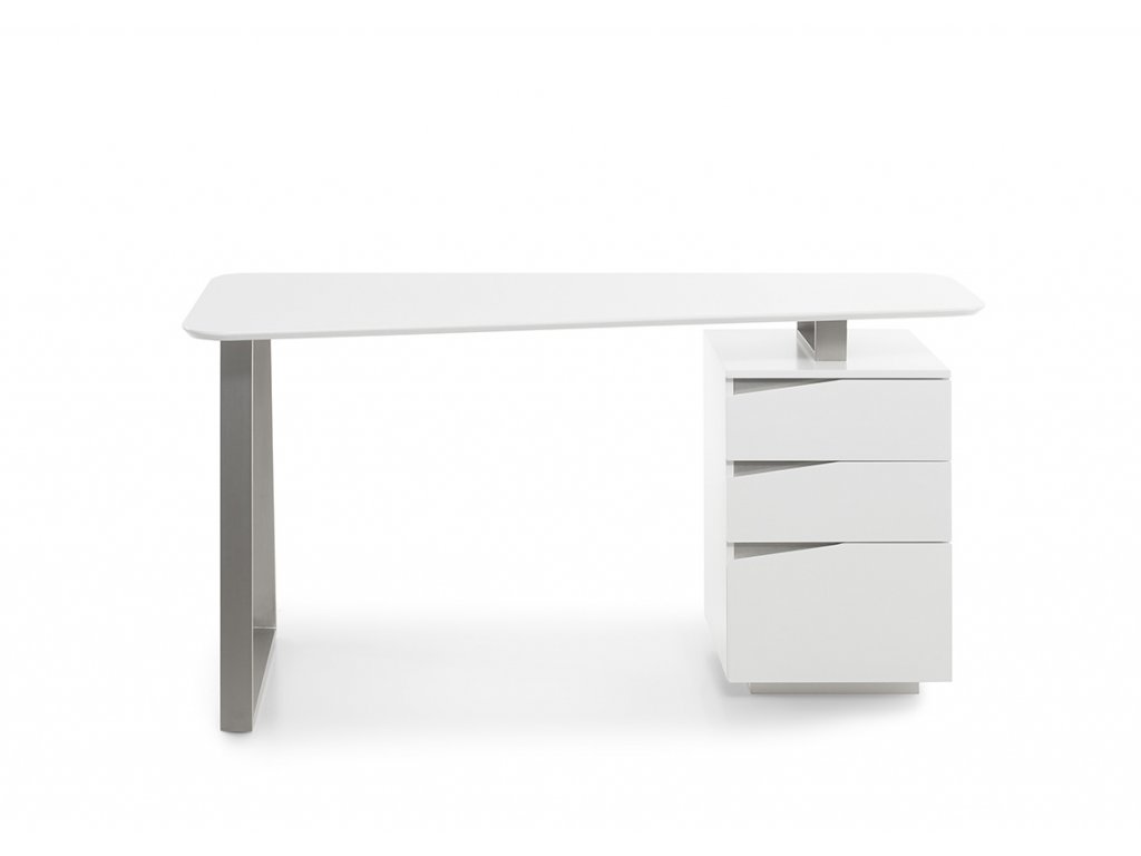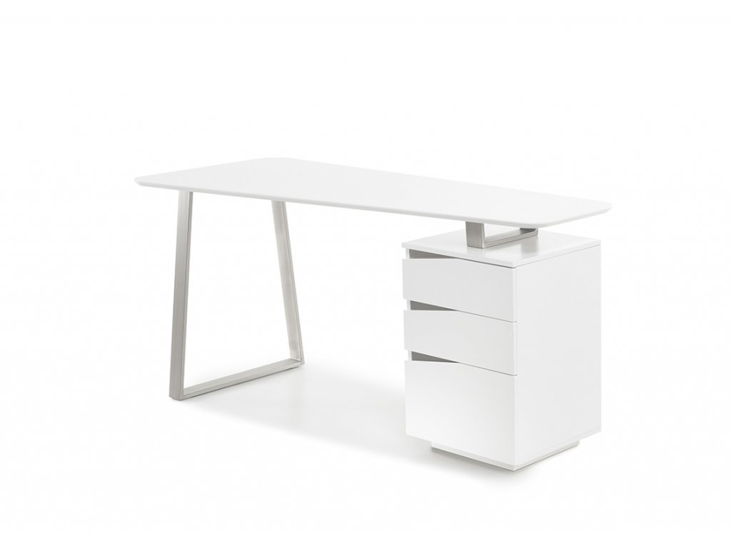 Moderný pracovný stolík, ktorý je výnimočný svojim prevedením vrchnej asymetrickej dosky v bielom matnom laku. Nadčasový dizajn dodáva stolíku podstava v tvare trojuholníka a zásuvky so šikmými úchytmi. Šírka dosky v užšej časti 42 cm.1ks =1 balík = 41 kg