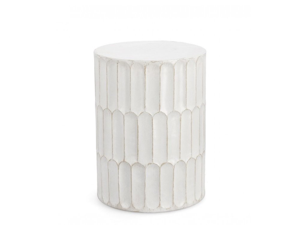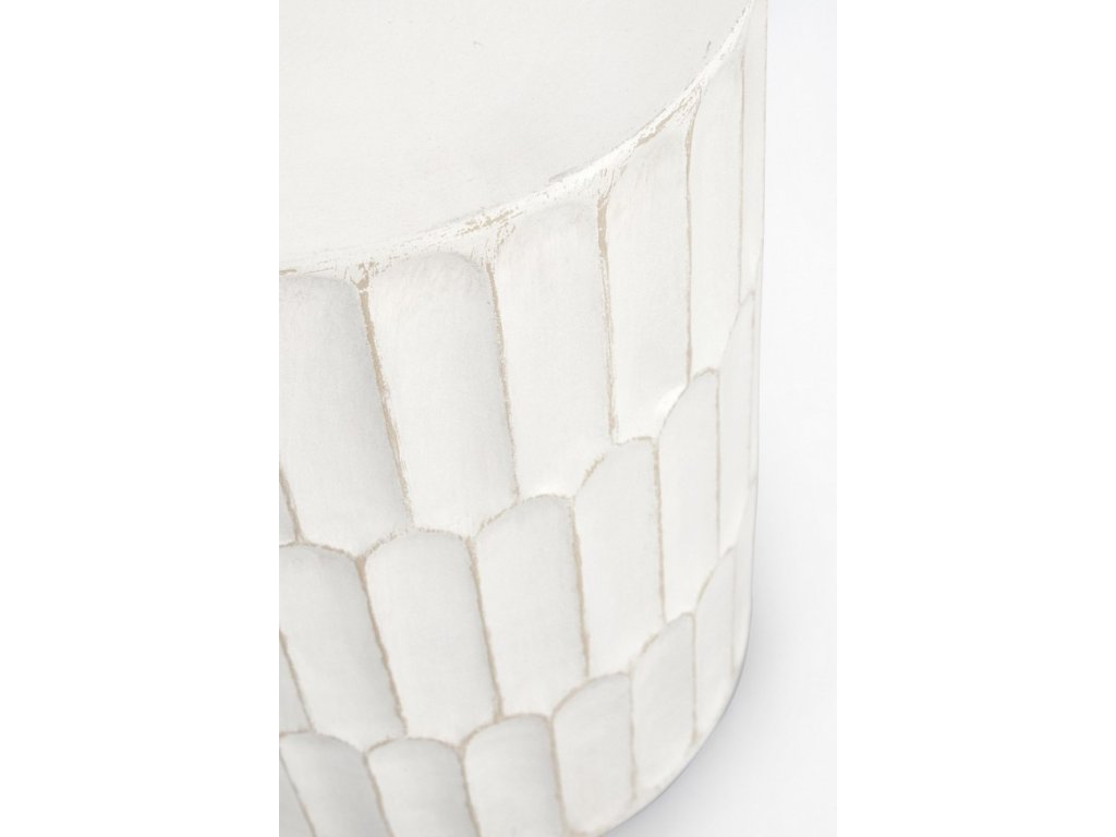 Povrch stolíka je upravený do matnej bielej farby s jemnými nádychmi patiny, čo mu dodáva nadčasový vzhľad a vytvára dojem, akoby tento kúsok patril medzi starodávne sochárske diela. Jedinečný geometrický vzor je zároveň dostatočne decentný, aby ladil s rôznymi štýlmi interiéru, od moderného až po rustikálny.