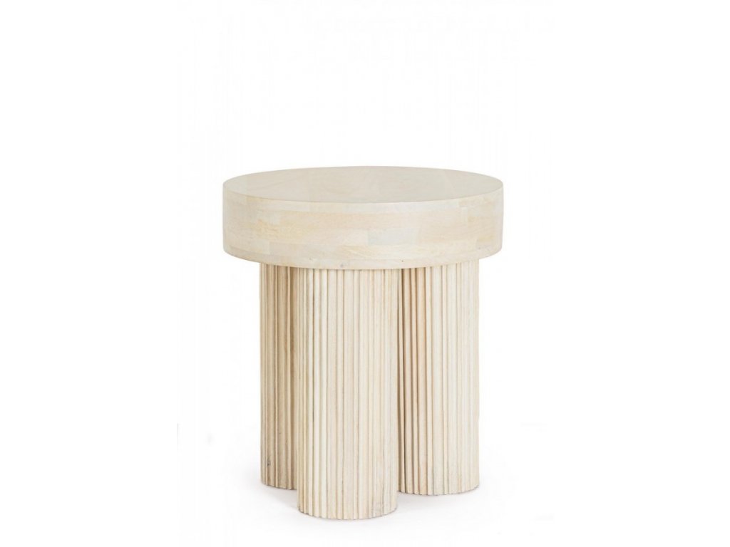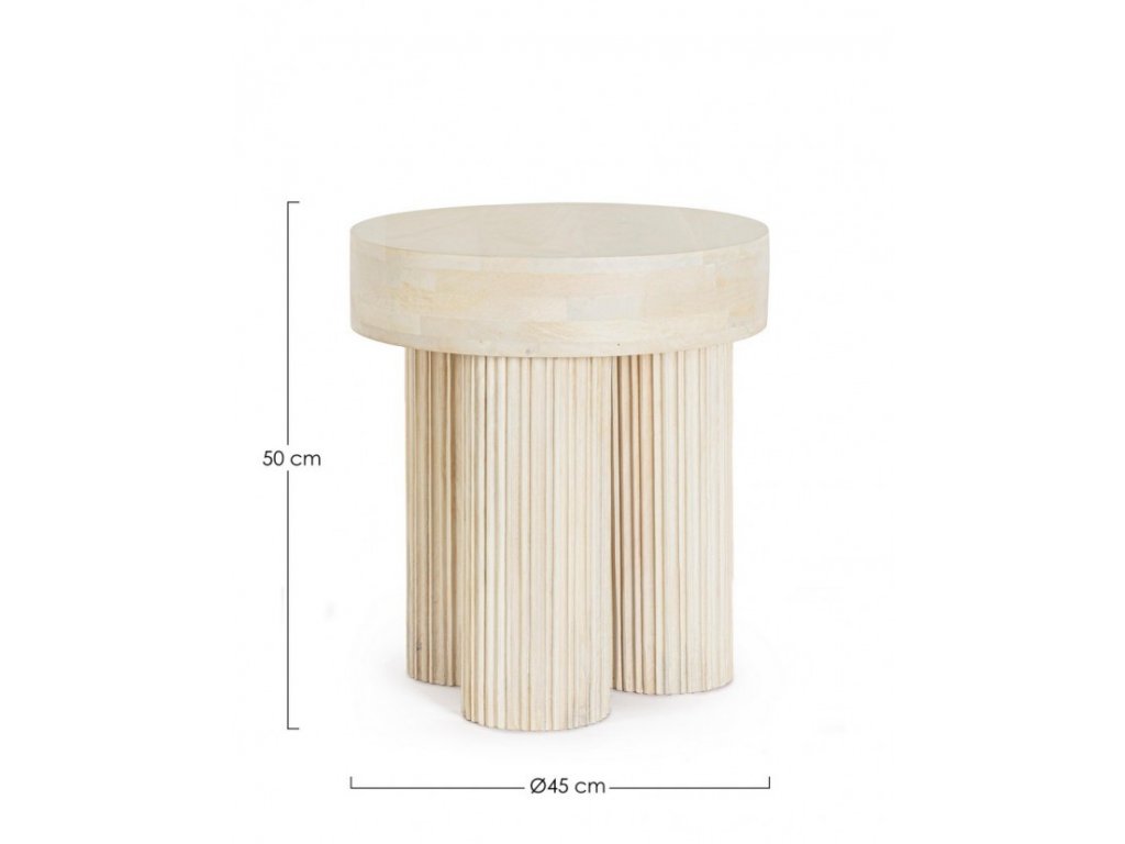 Okrúhly príručný stolík Dacca s výrazným charakterom v japonskom štýle a precíznou prepracovanosťou z mangového dreva v naturálnom prevedení.