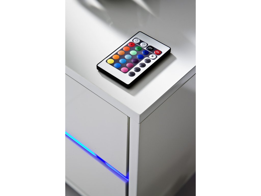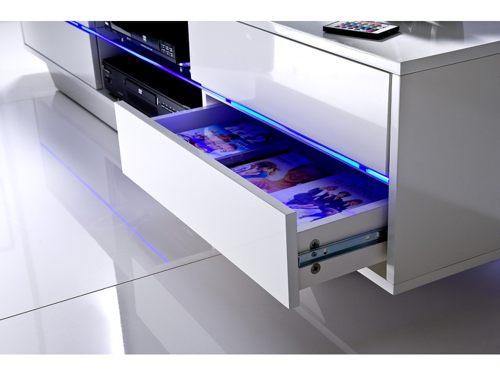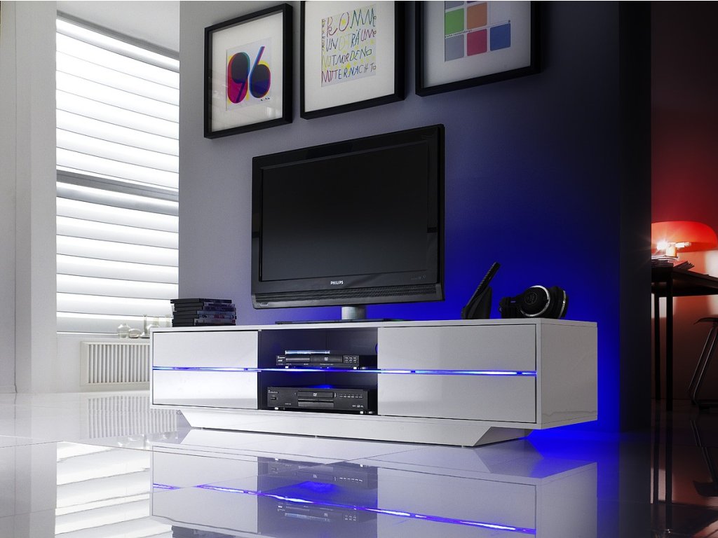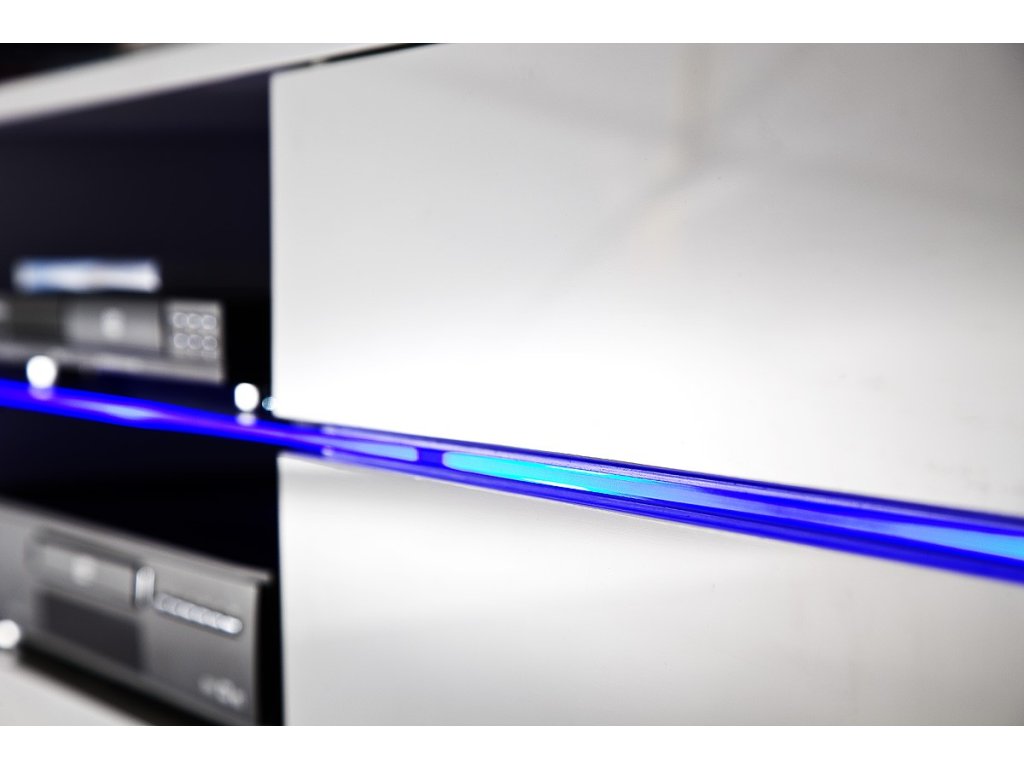 Vysokolesklý TV stolík so zásuvkami s dotykovým otváraním. Priestor medzi zásuvkami je vybavený LED podsvietením. Nosnosť stolíka je 40kg