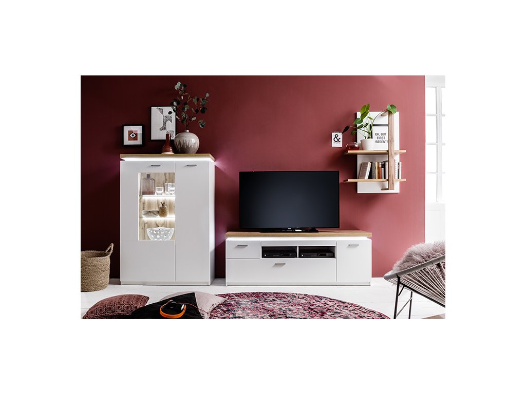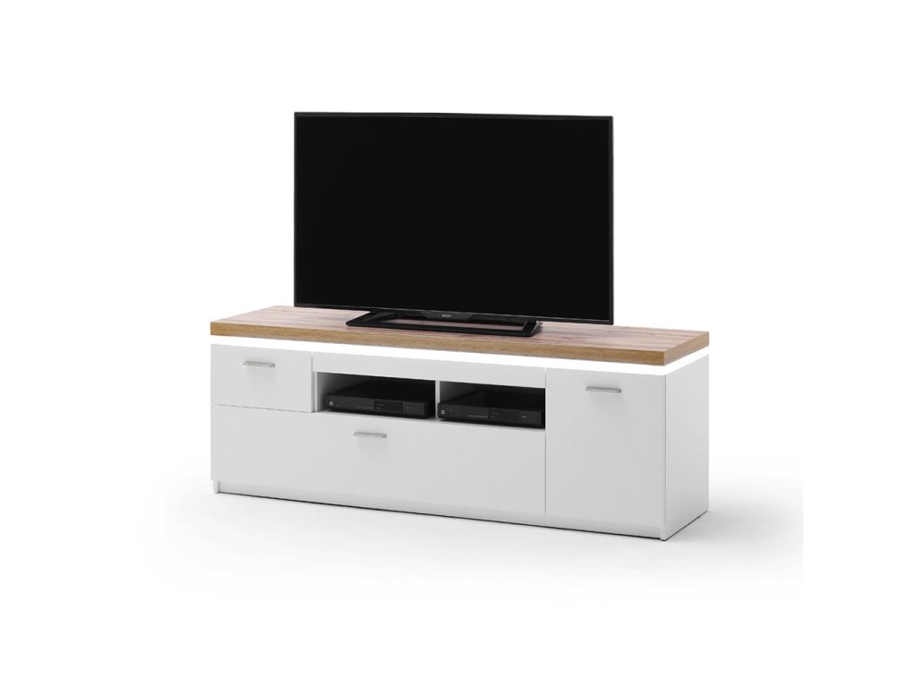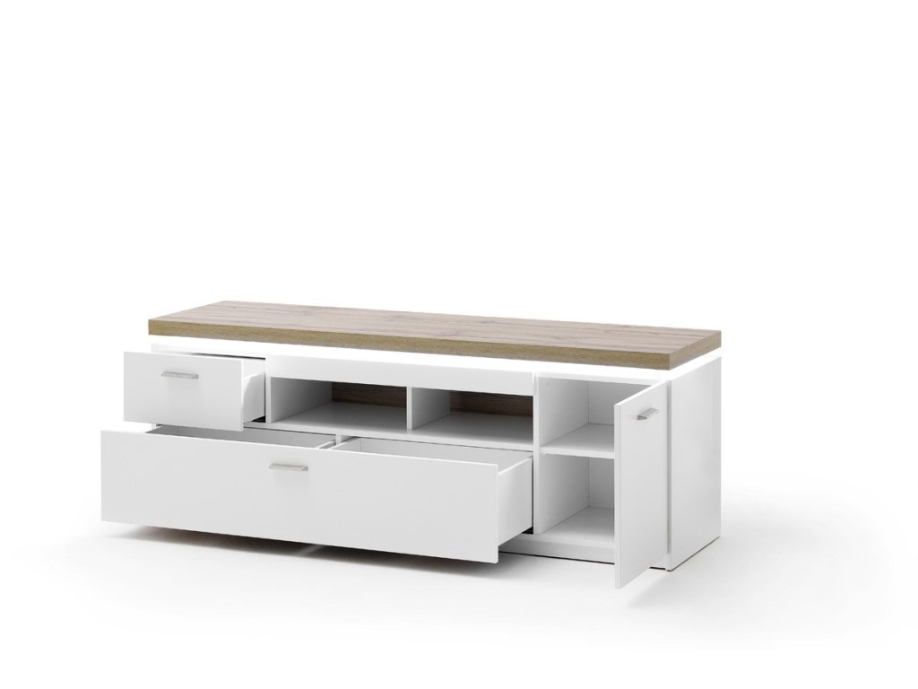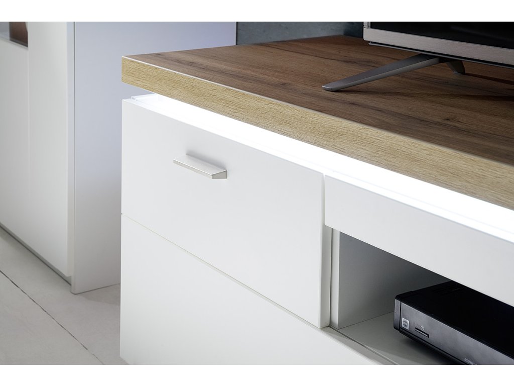 TV stolík z dizajnovej kolekcie nábytku "CALI". Štýl tohto stolíka vyznačuje hlavne kombináciou bielej repliky melamínu a repliky dubového melamínu. Stolík ponúka úložný priestor v podobe 1 malej zásuvky, 1 veľkej zásuvky a 1 skrinky s dvierkami. Disponuje LED osvetlením.