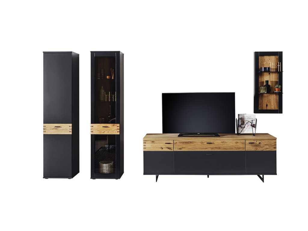 TV stolík/komoda Cesena je skvelým doplnkom kolekcie Cesena. Ako aj pri ďalšom nábytku z rovnomennej série, aj tu nájdeme príťažlivú kombináciu matnej čiernosivej farby a olejovaného dubového masívu s priebežnými lamelami. Vysoké kovové nohy a kovové rukoväte v čiernosivom prevedení sú samozrejmosťou. Dvojica bočných skriniek s poličkami a zásuviek vám dáva na výber kam čo uložiť.