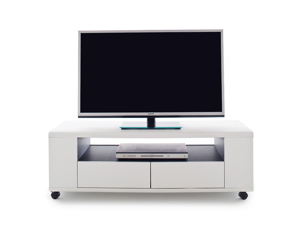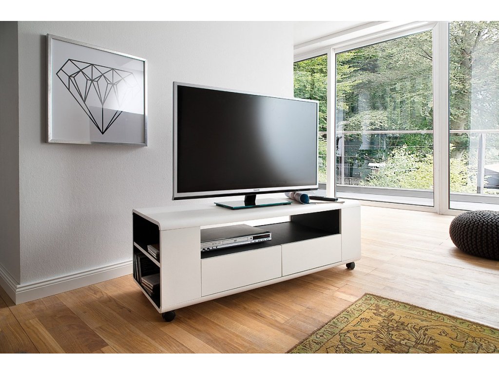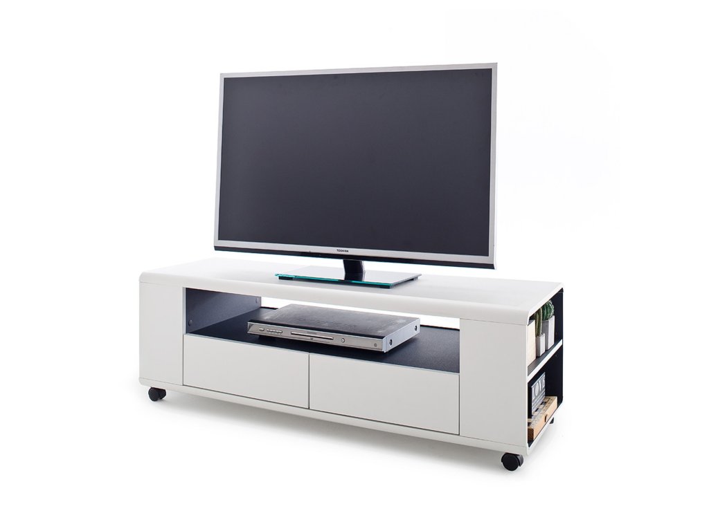 Dizajnový TV stolík na kolieskach so stredovým otvoreným priestorom v antracitovej dekorácii. Ďalší ukladací priestor v podobe zásuviek spredu a otvorených políc na stranách. Stolík je vyhotovený v bielom matnom prevedení.