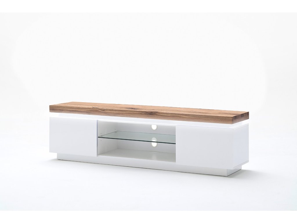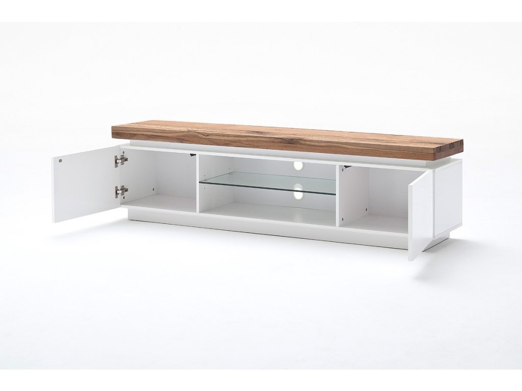 Dizajnový TV stolík v kombinácii MDF biely matný lak a masív - dub olejovaný. Vrchná doska z dubového masívu v hrúbke 6cm. V ponuke sa nachádzajú aj ďalšie kúsky z tejto kolekcie, stačí do vyhľadávania zadať "ROMINA" pre ich zobrazenie.