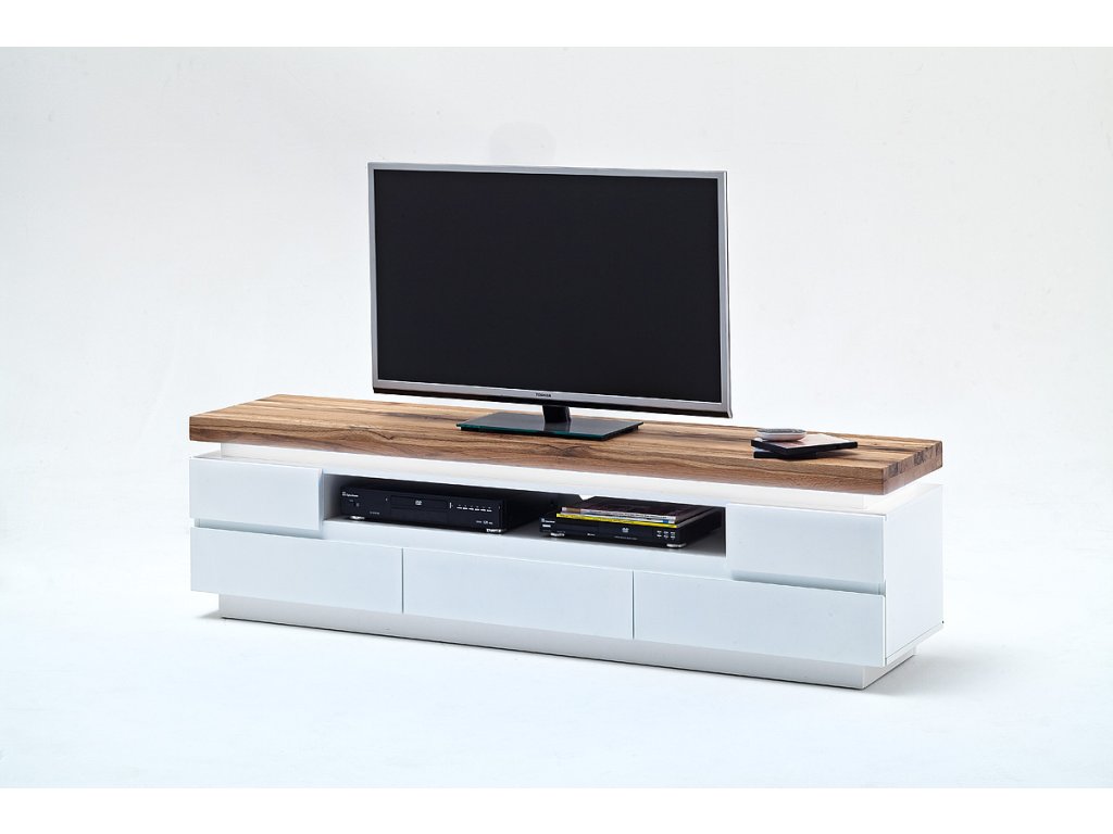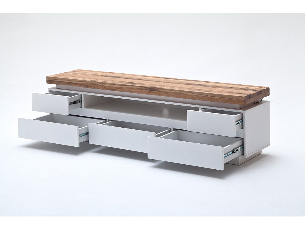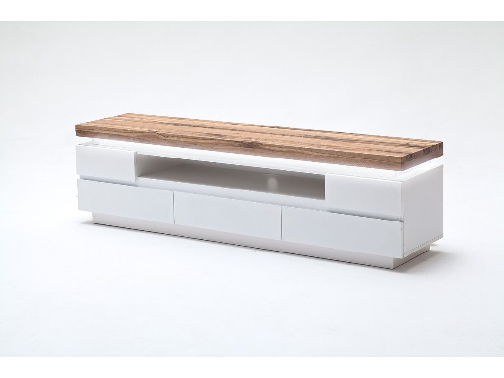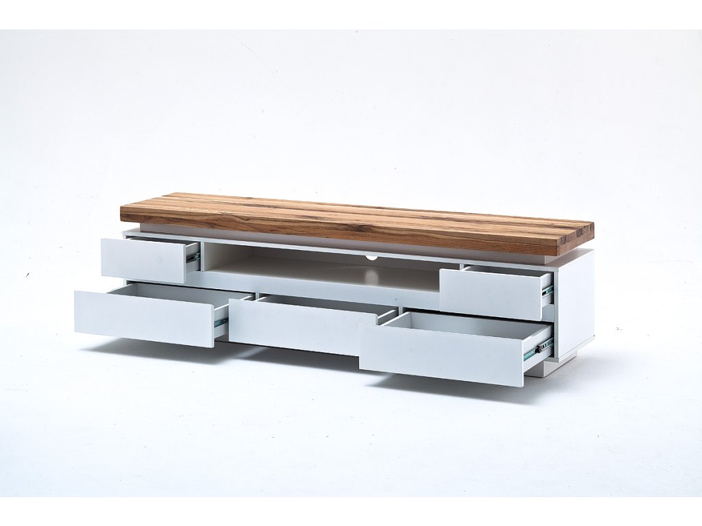 Designový TV stolek s LED osvětlením ovládaným přes dálkové ovládání. Upoutá nejen ve dne, ale i při nedostatku světla. Kombinace MDF desek v bílém matném laku a masivní desky z olejovaného dubového dřeva je jednoduše skvělá. Deska stolu má štědrou tloušťku až 6 cm. Úkryt pro různé předměty poskytuje až 5 zásuvek a jedna polička. S tímto stolkem bude každý moderní obývací pokoj kompletní. V nabídce se nacházejí i další kousky z této kolekce, stačí do vyhledávání zadat „ROMINA“ pro jejich zobrazení.