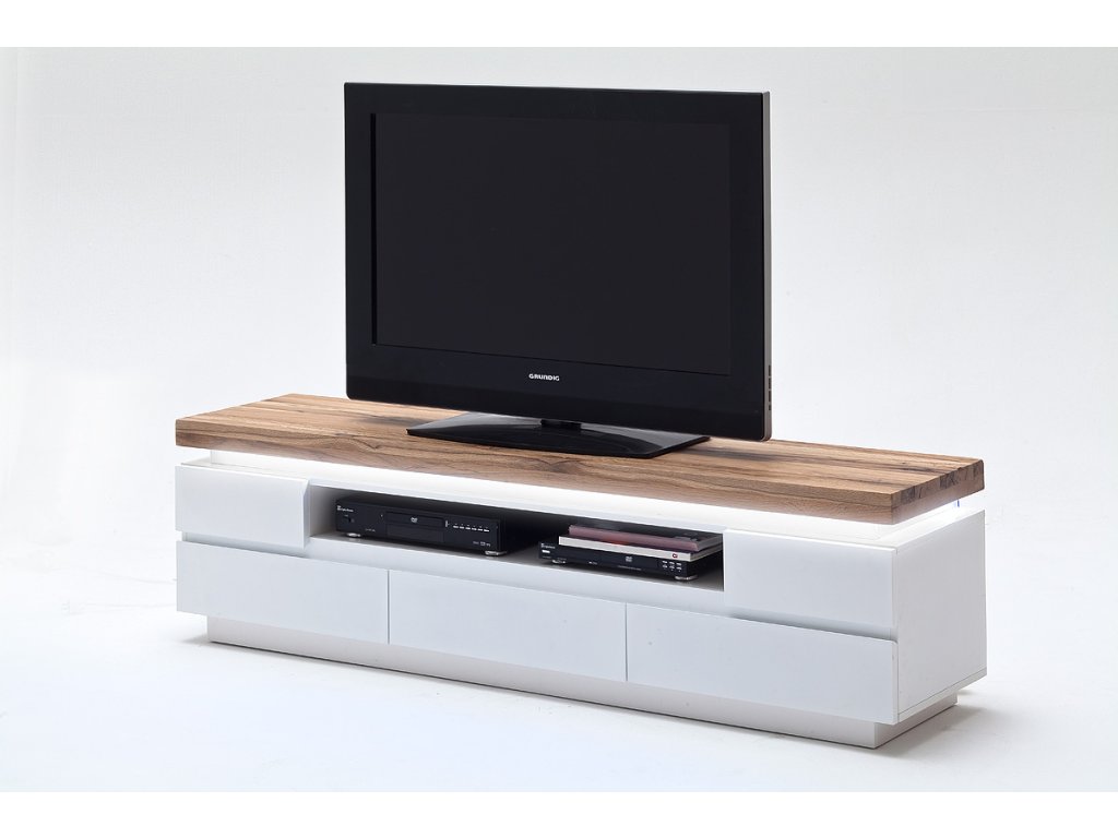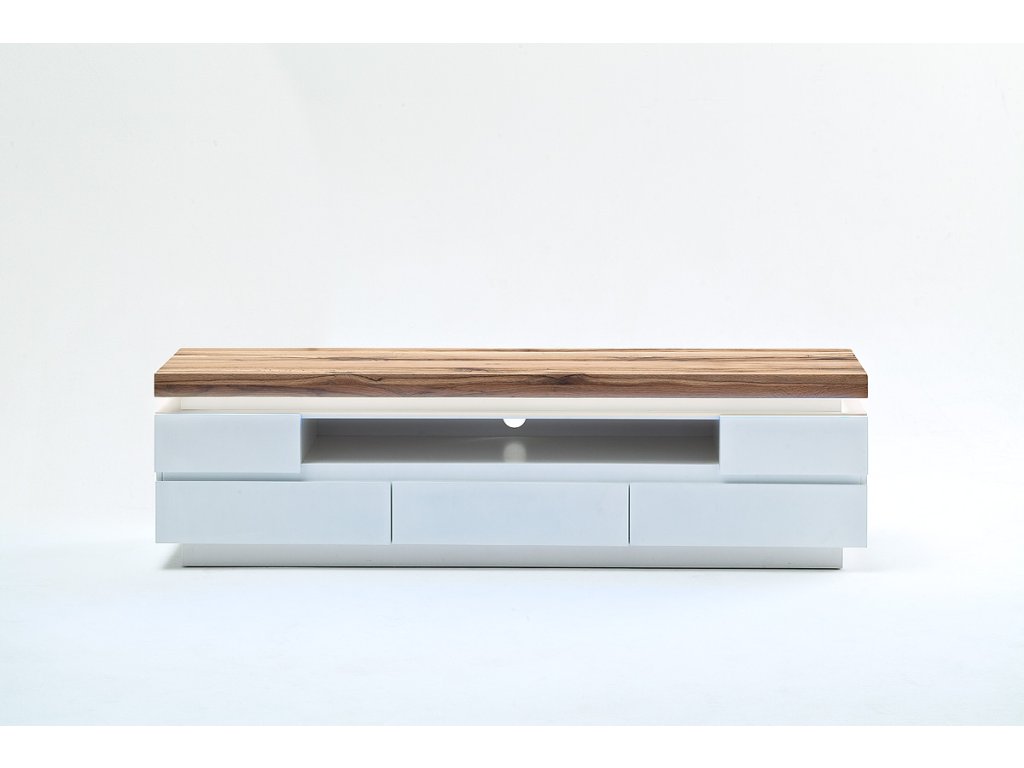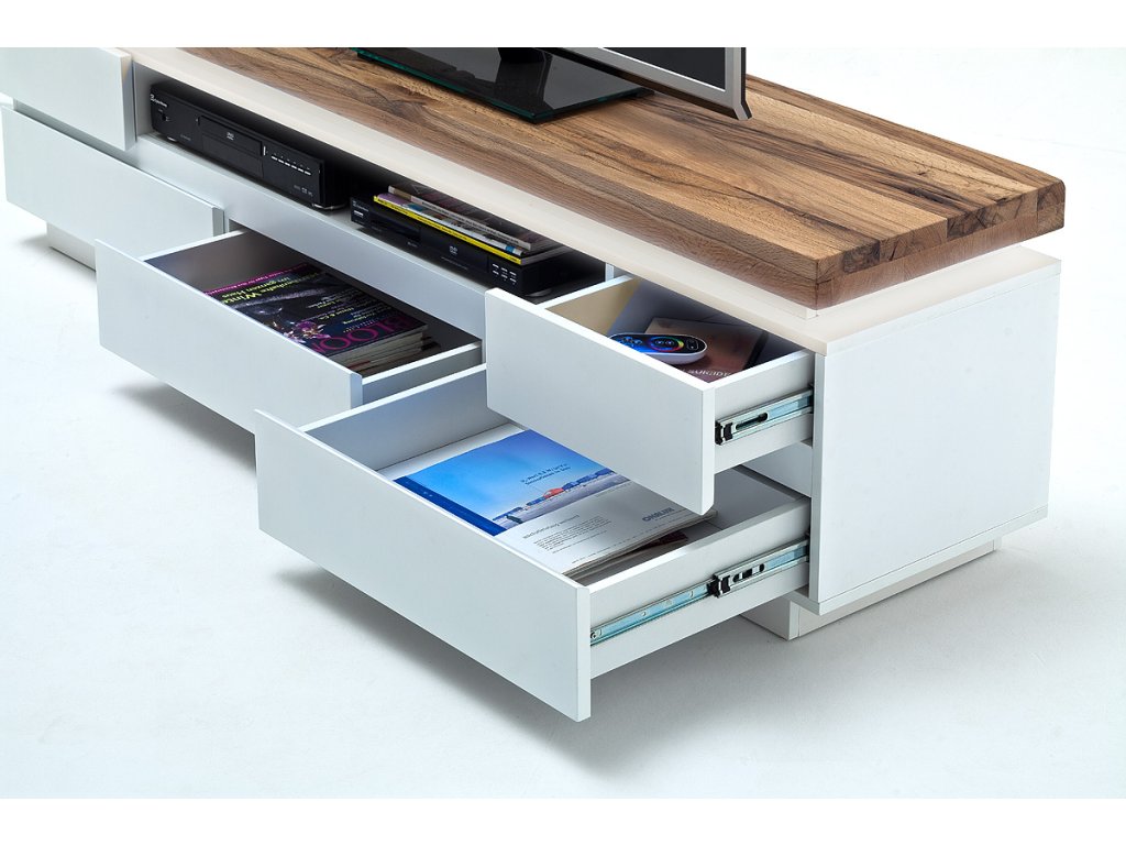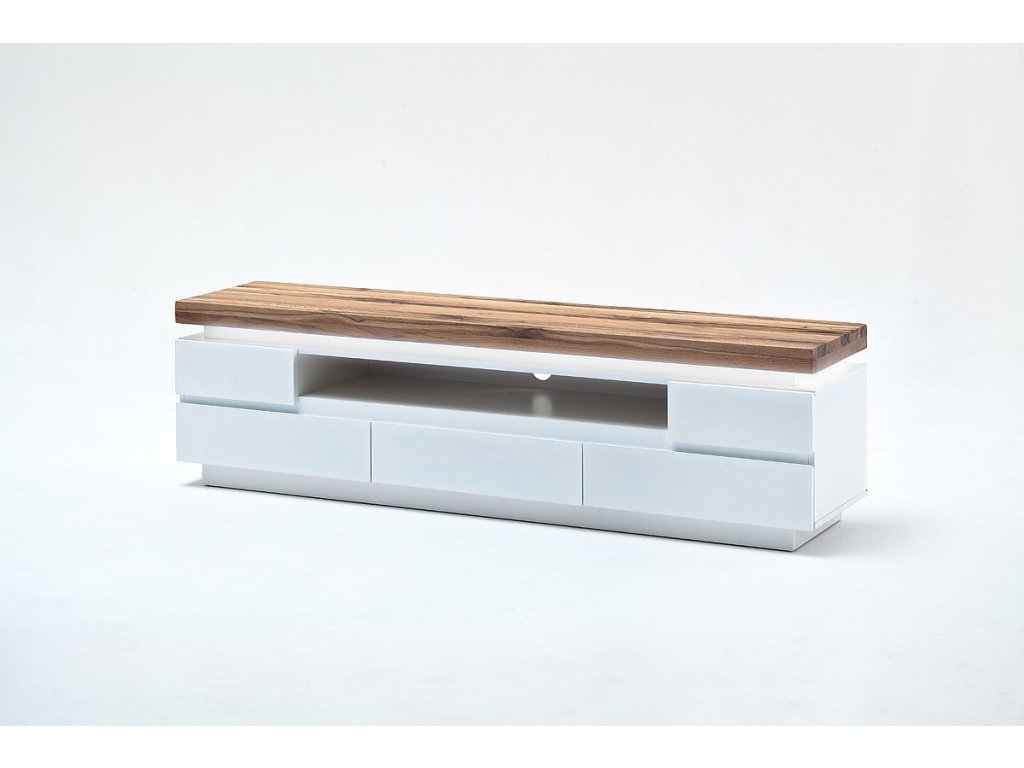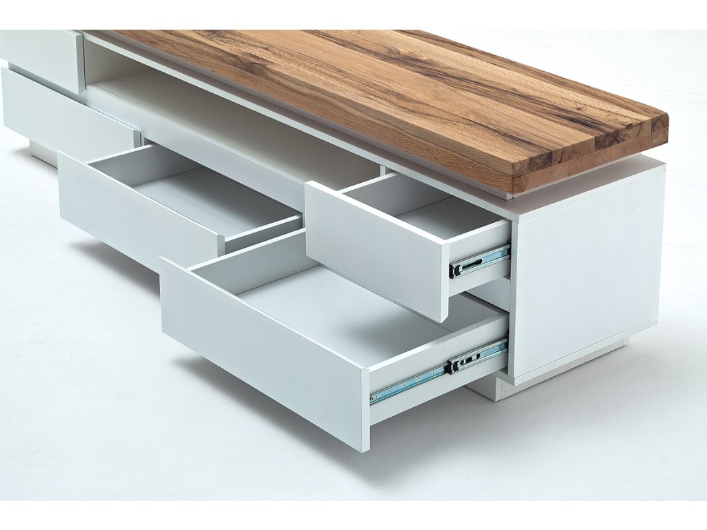 Designový TV stolek s LED osvětlením ovládaným přes dálkové ovládání. Upoutá nejen ve dne, ale i při nedostatku světla. Kombinace MDF desek v bílém matném laku a masivní desky z olejovaného dubového dřeva je jednoduše skvělá. Deska stolu má štědrou tloušťku až 6 cm. Úkryt pro různé předměty poskytuje až 5 zásuvek a jedna polička. S tímto stolkem bude každý moderní obývací pokoj kompletní. V nabídce se nacházejí i další kousky z této kolekce, stačí do vyhledávání zadat „ROMINA“ pro jejich zobrazení.