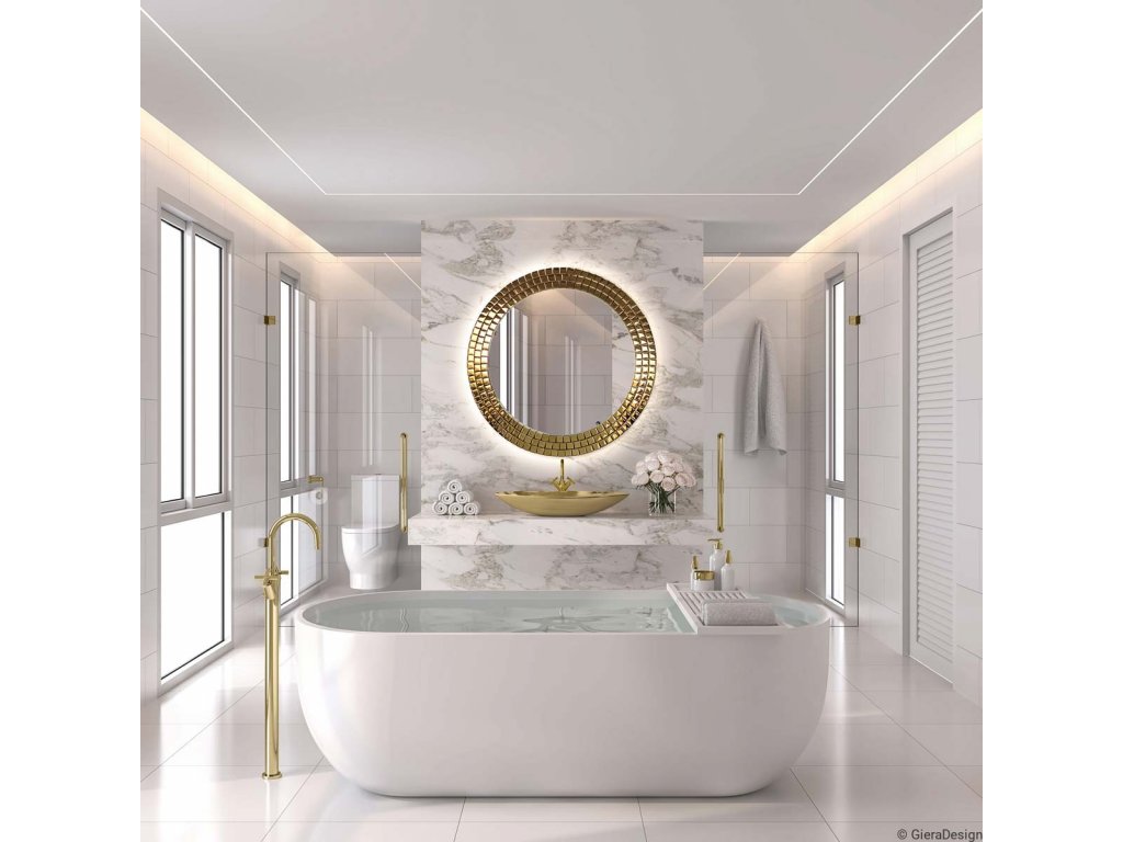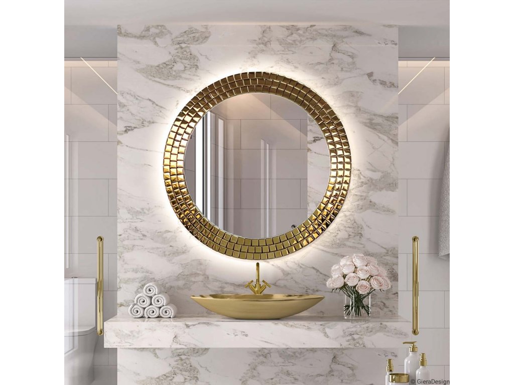 Moderné nástenné zrkadlo do kúpeľne v prepychovom ráme, ktorý tvorí zlatá mozaika osvetlená LED svetlom. Rám je vyrobený z kvalitnej zlatej mozaiky, do nej je vlepené leštené zrkadlo vo vysokom lesku. Vešiaky sú namontované vzadu, na prianie môže byť zrkadlo bez ramienok.