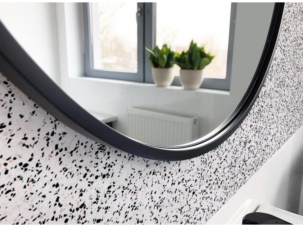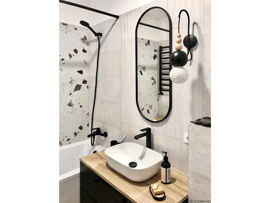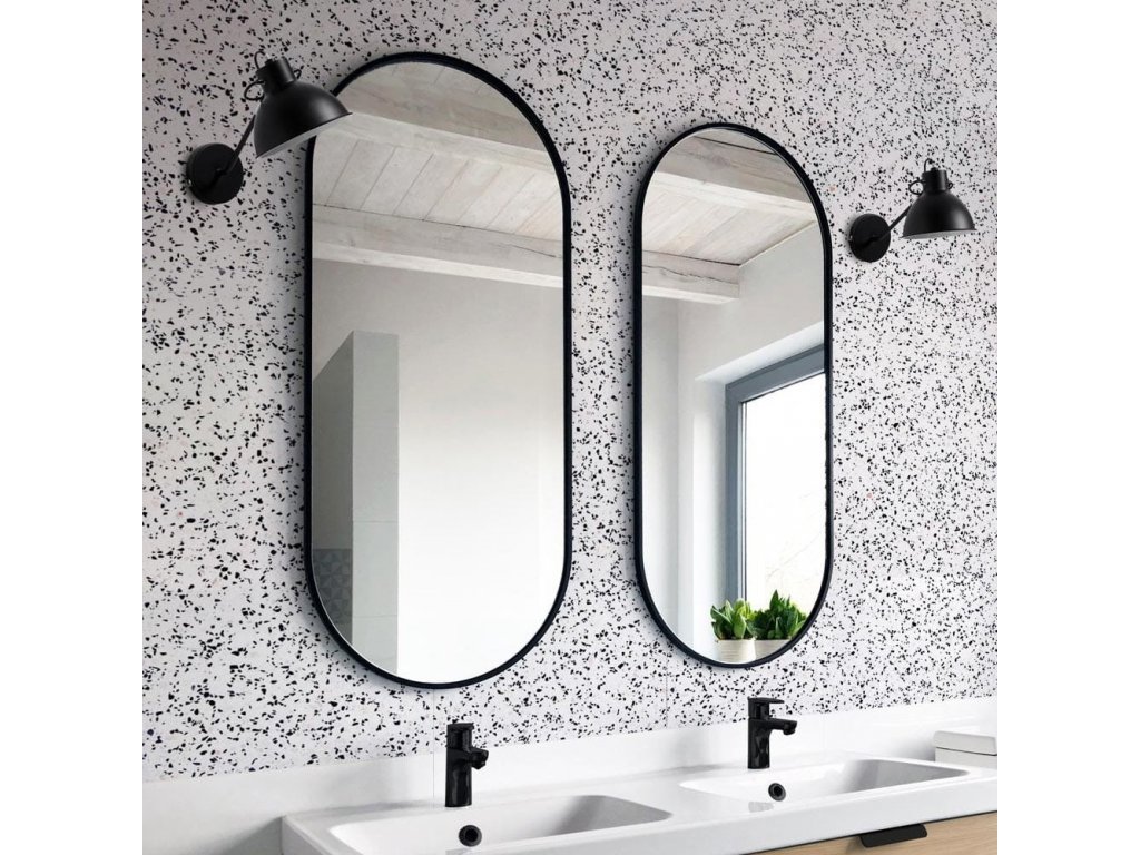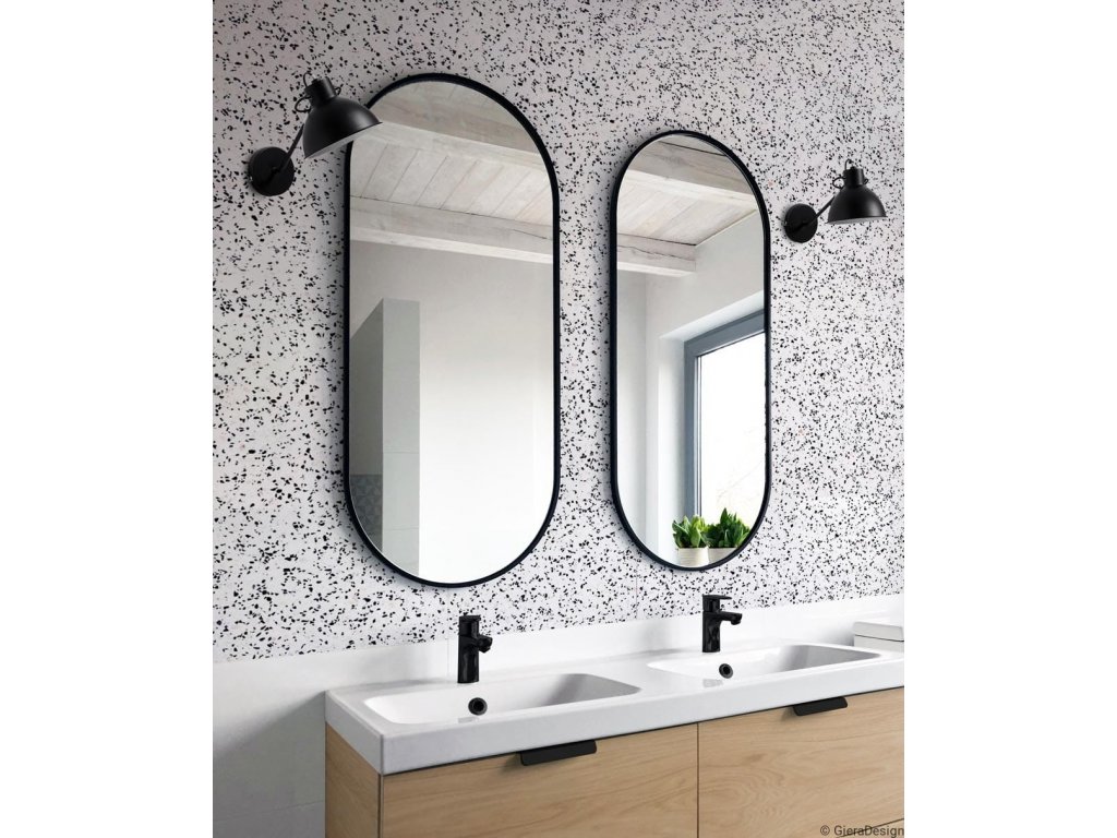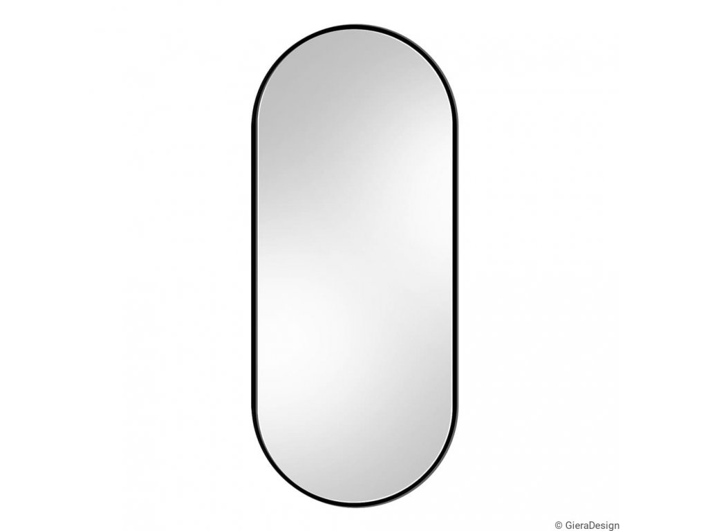 Oválne nástenné zrkadlo vo veľmi úzkom ráme v čiernej farbe. Moderné zrkadlo na stenu sa hodí do interiérov v eklektickom, škandinávskom alebo modernom štýle. Rám nástenného zrkadla je vyrobený z vodeodolnej MDF lakovanej na čierno tvrdým dvojzložkovým polyuretánovým lakom. Vysoko lesklé zrkadlo s leštenými hranami je zabezpečené vrstvou teflónu, ktorá ho chráni pred korozívnymi účinkami vlhkosti - vhodné aj do kúpeľne. Luxusné zrkadlo do kúpeľne.