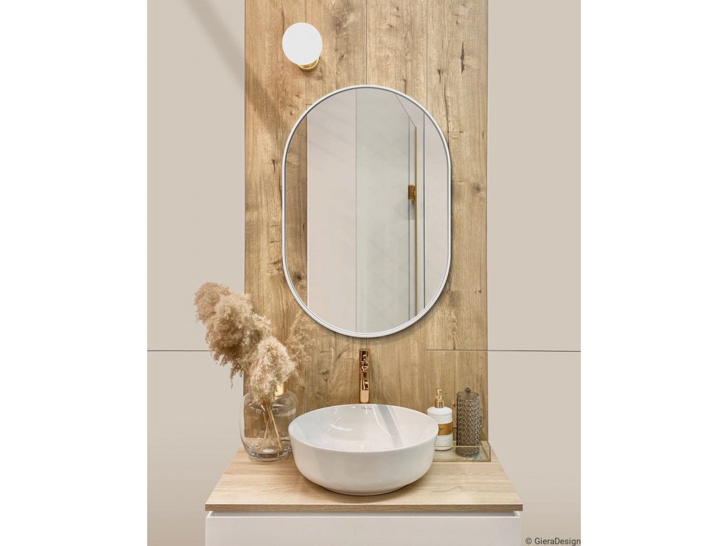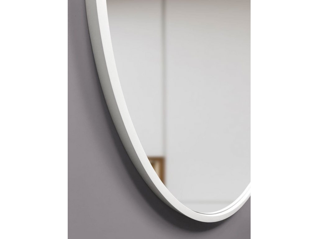 Oválne nástenné zrkadlo vo veľmi tenkom bielom matnom ráme sa perfektne sa hodí do interiérov v eklektickom, škandinávskom alebo modernom štýle. Rám zrkadla je vyrobený z vodeodolnej MDF lakovanej na bielo tvrdým dvojzložkovým polyuretánovým lakom. Vysoko lesklé zrkadlo s leštenými hranami je zabezpečené vrstvou teflónu, ktorá ho chráni pred korozívnymi účinkami vlhkosti - vhodné aj do kúpeľne. Zrkadlová tabuľa je dodatočne zozadu zaistená fóliou, ktorá zvyšuje pevnosť zrkadla a v prípade rozbitia udržuje jeho časti v ráme.Zrkadlá sú vyrobené z tých najkvalitnejších belgických zrkadiel s vysokou priepustnosťou a leskom. Brúsenie a leštenie hrán je vykonávané na kvalitných talianskych strojoch pre spracovanie skla.