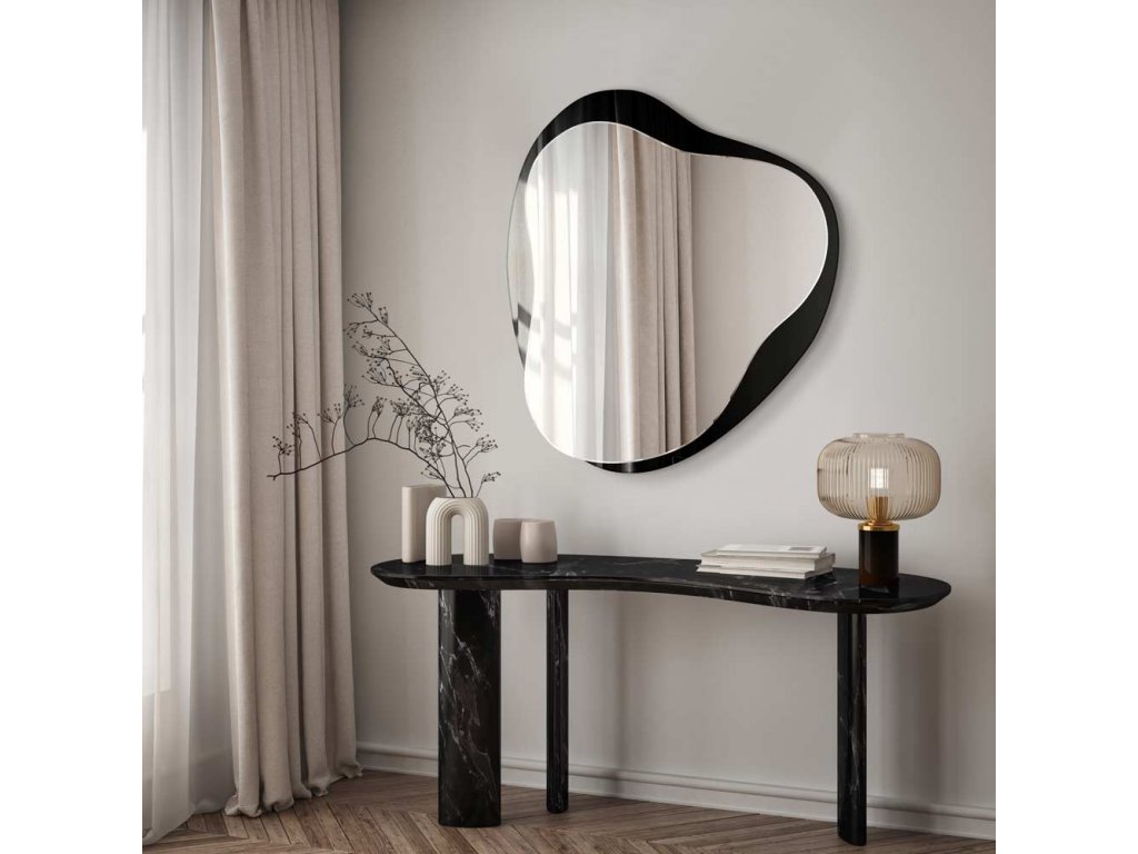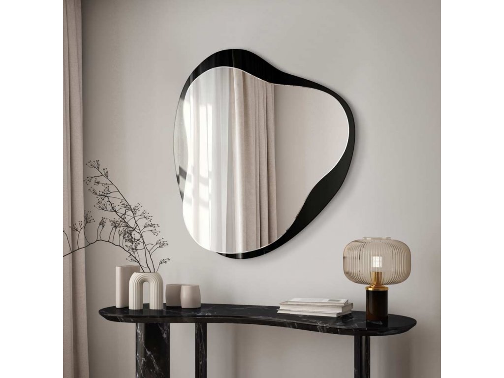 - Nepravidelný rám zrkadla Amo je vyrobený z čierneho skla Lacobel. Jeho okraje sú brúsené a leštené. Čierna farba sa pri umývaní neodiera ani nepoškriabe. Toto zrkadlo je vhodné aj do kúpeľne.