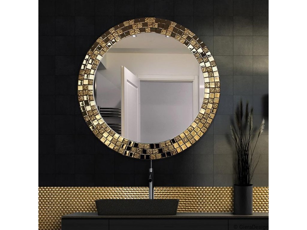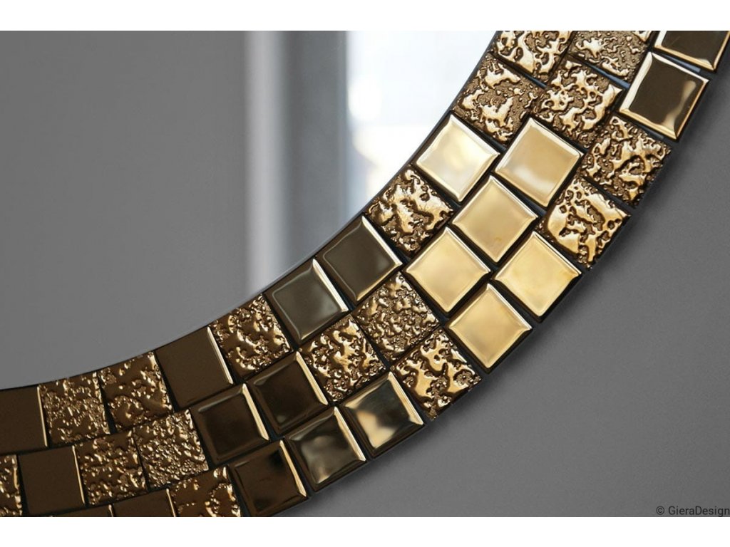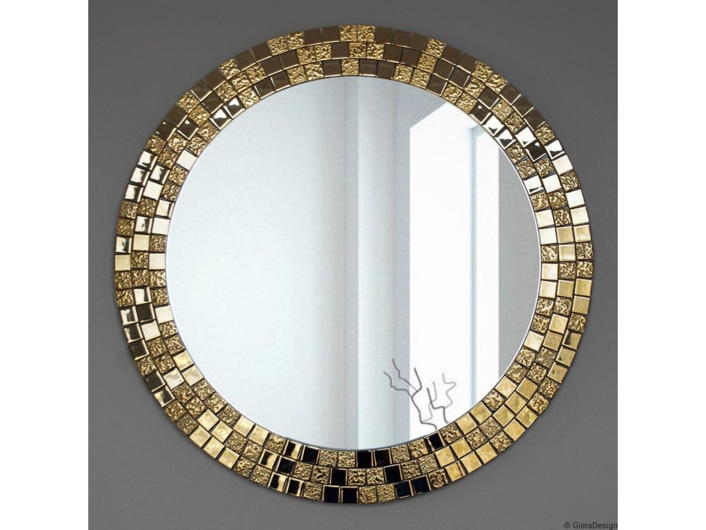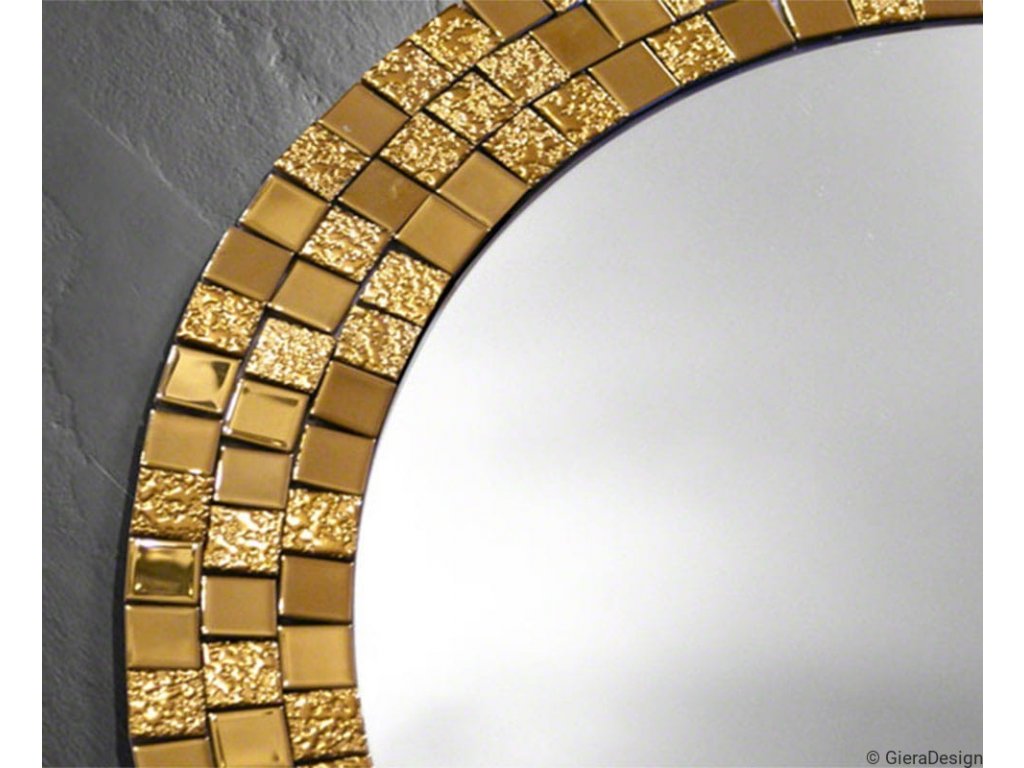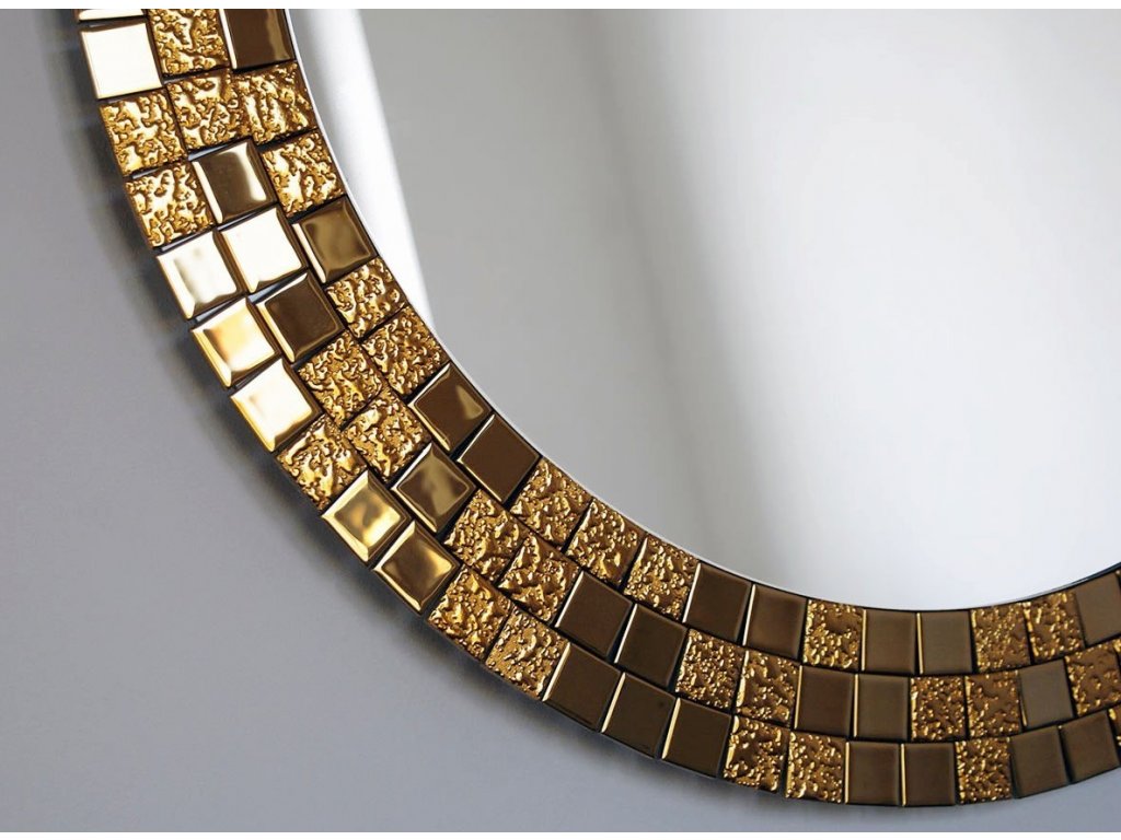 Elegantné okrúhle zrkadlo s prepychovým rámom, ktorý tvorí zlatá mozaika sa vynikajúco hodí ako dekorácia do spálne, obývacej izby či jedálne. Zrkadlo je zabezpečené teflónom, ktorý ho chráni pred korozívnym účinkom vlhkosti - vhodné i do kúpeľne.Zrkadlo sa zhotovuje na zákazku, je možné vyrobiť aj iný rozmer. Zrkadlá sú vyrobené z tých najkvalitnejších belgických zrkadiel s vysokou priepustnosťou a leskom. Brúsenie a leštenie hrán je vykonávané na kvalitných talianskych strojoch pre spracovanie skla.