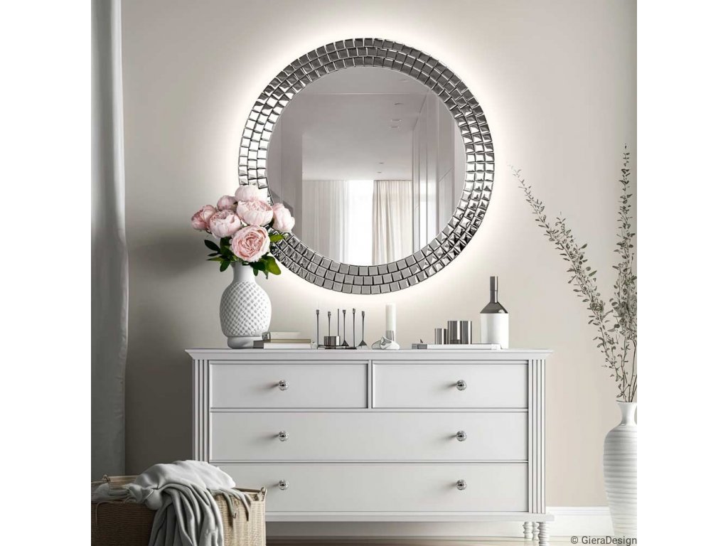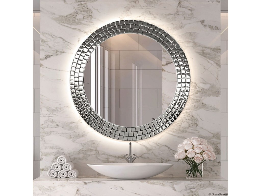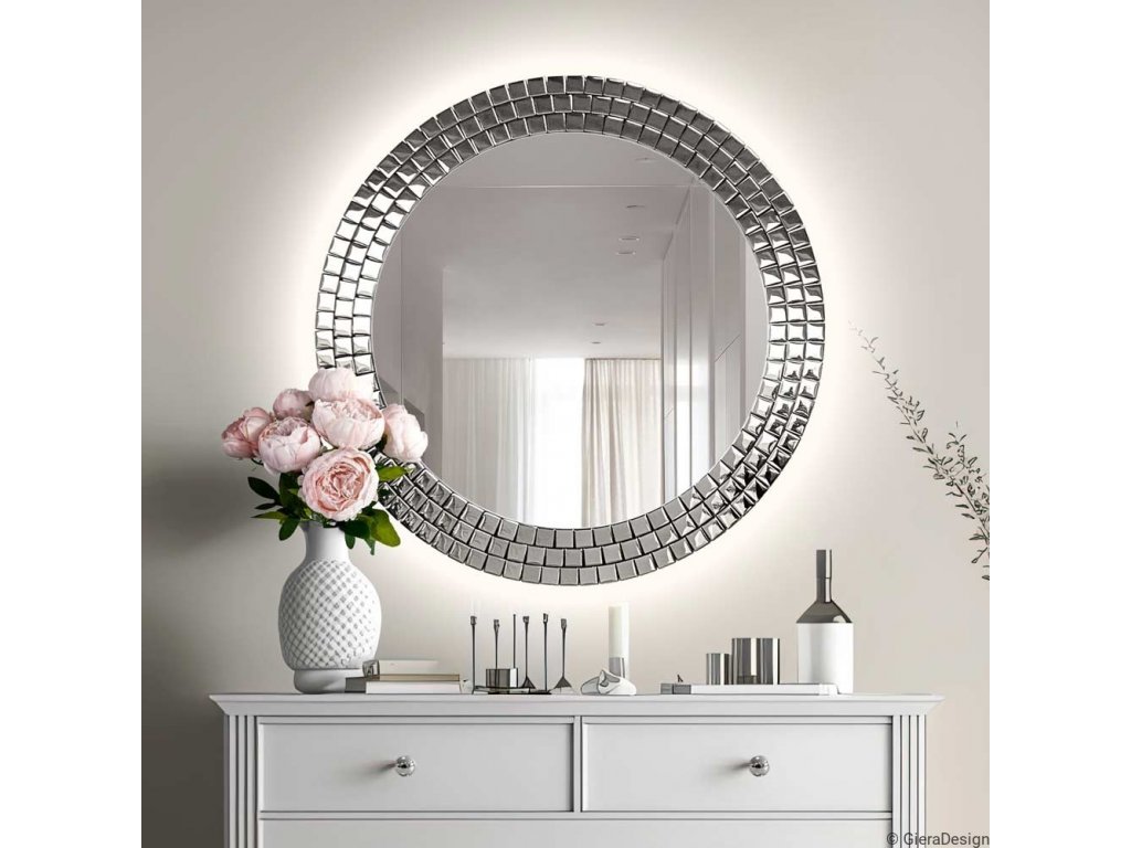 Moderné nástenné zrkadlo do kúpeľne v prepychovom ráme, ktorý tvorí strieborná mozaika osvetlená LED svetlom. Rám je vyrobený z kvalitnej striebornej mozaiky, do nej je vlepené leštené zrkadlo vo vysokom lesku. Vešiaky sú namontované vzadu, na želanie môže byť zrkadlo bez vešiakov.