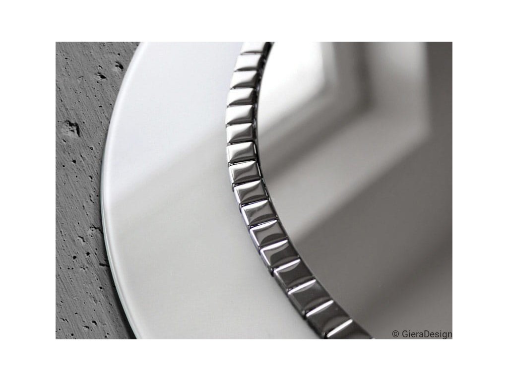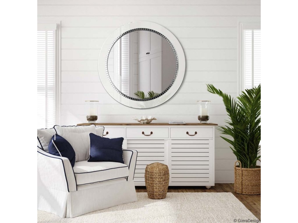 Okrúhle nástenné zrkadlo má nadčasový dizajn, ktorý odkazuje na štýl Art Deco. Zrkadlo je zabezpečené teflónom, ktorý ho chráni pred korozívnym účinkom vlhkosti - vhodné i do kúpeľne. Novodobý kúsok do moderných interiérov. Zbrúsené a leštené okraje zrkadla sú samozrejmosťou.Rám je vyrobený zo bieleho skla Lacobel a vysoko kvalitnej mozaiky zo strieborného skla (jedna kocka 15 × 15 mm). Háčiky sú namontované na zadnej strane pre vertikálnu alebo horizontálnu inštaláciu. Na požiadanie môže byť zrkadlo upravené bez háčikov.