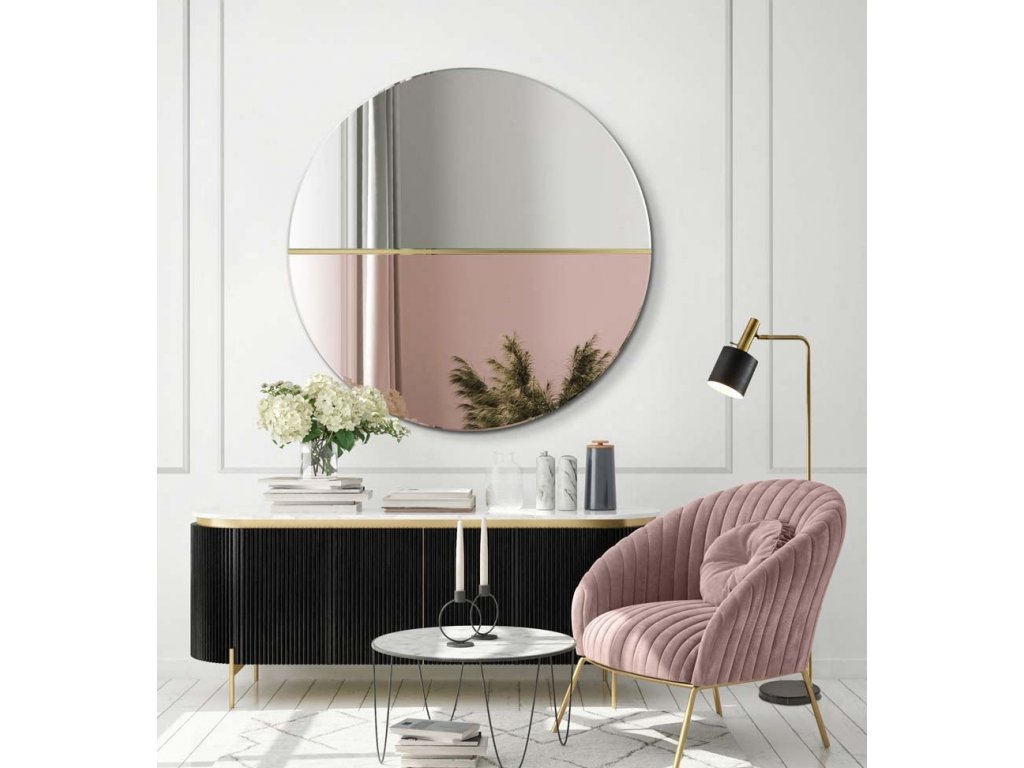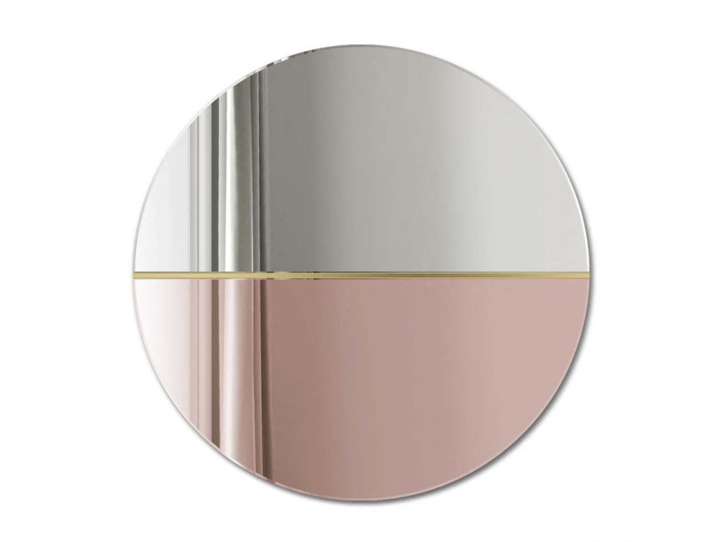 Originálne dvojfarebné dekoratívne zrkadlo vyrobené z klasického a medeného zrkadlového skla. Tieto dva prvky sú spojené úzkou lištou z leštenej mosadze, ktorá dodáva zrakdlu štýl a eleganciu. Na jednej polovici bolo použité zrkadlo s medeným tieňom, tiež nazývané ružové zlato, ktoré dokonale zapadá do súčasných trendov interiéru.