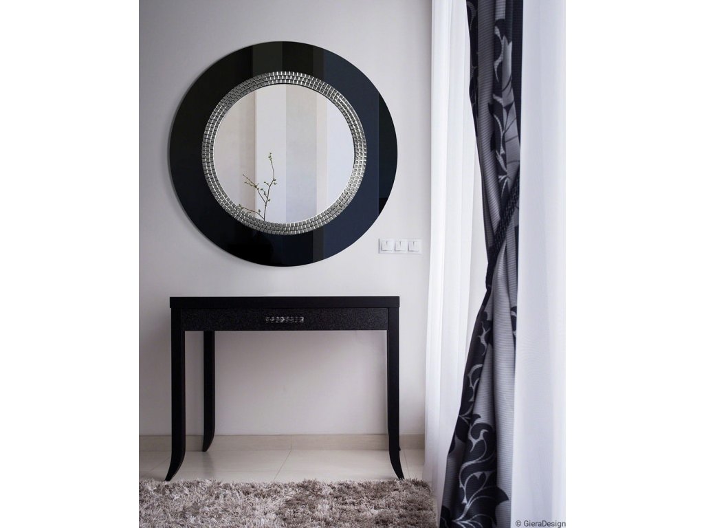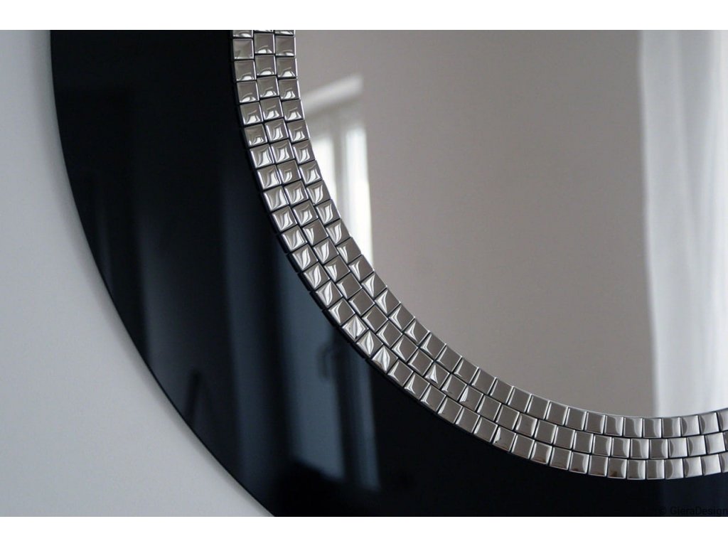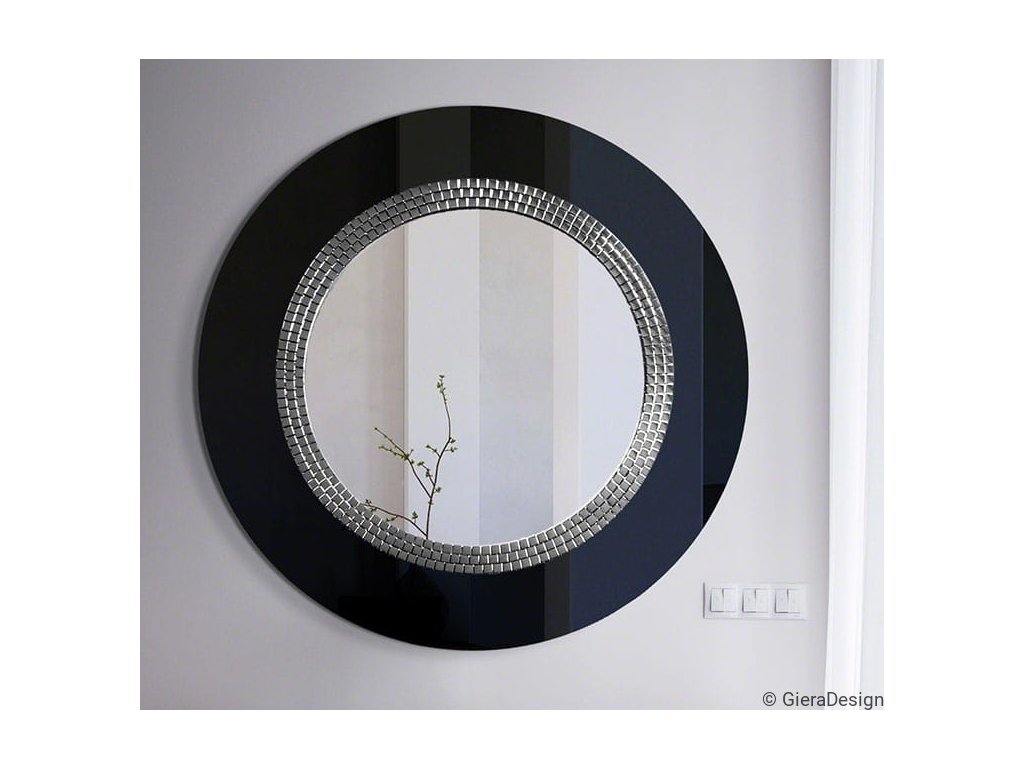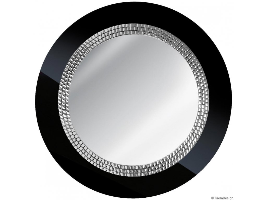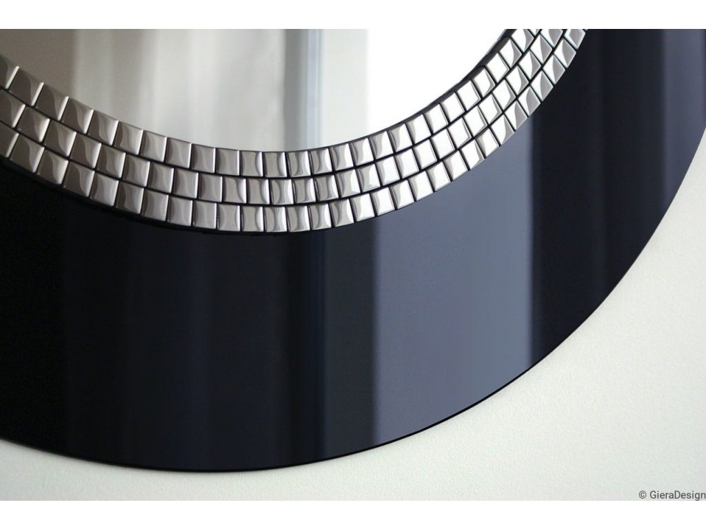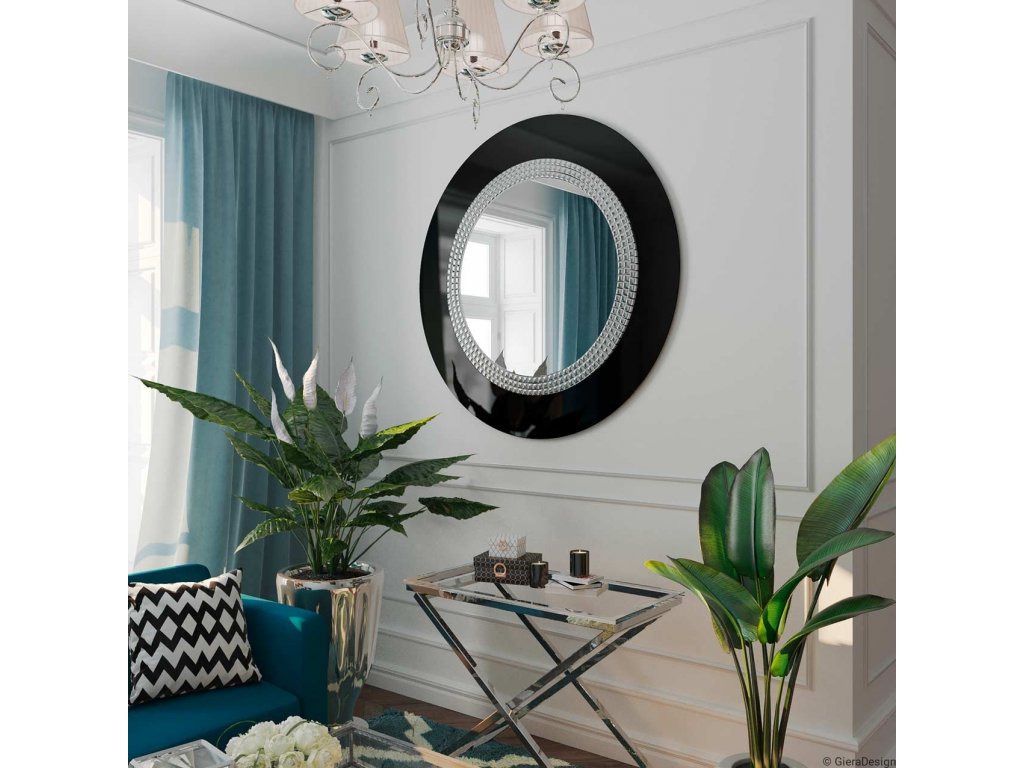 Elegantné, okrúhle nástenné zrkadlo v čiernom ráme zdobené striebornou mozaikou. Nadčasový dizajn odkazujúci na štýl Art Deco. Perfektne sa hodí do obývacej izby, jedálne alebo spálne. Zrkadlo je zabezpečené teflónom, ktorý ho chráni pred korozívnym účinkom vlhkosti - vhodné i do kúpeľne. Zbrúsené a leštené okraje zrkadla sú samozrejmosťou.Rám zrkadla je vyrobený z čierneho skla Lacobel a kvalitnej sklenenej striebornej mozaiky (tri rady kociek 15 × 15 mm). Na ňu je nalepené leštené zrkadlo s vysokým leskom. Vzadu sú namontované vešiaky, na želanie môže byť bez vešiakov, na lepenie.