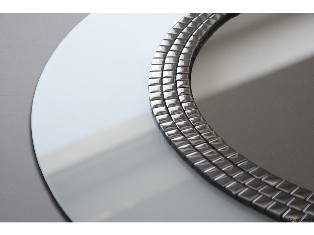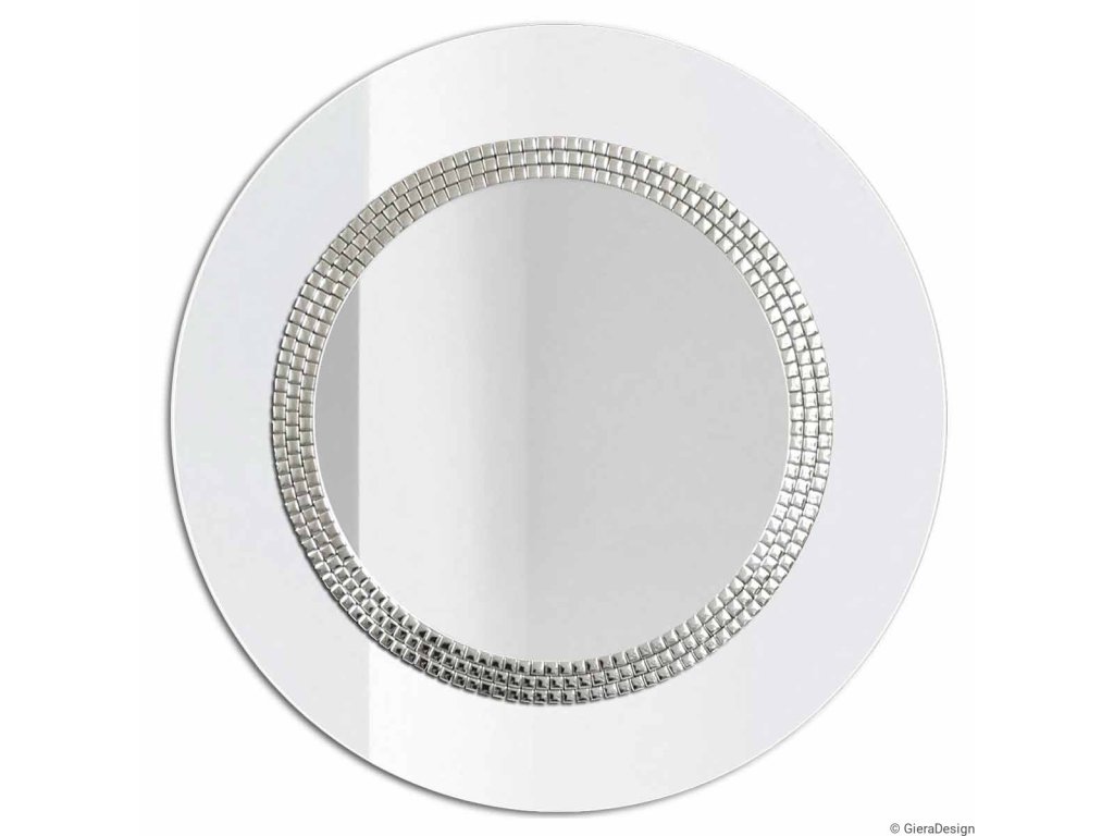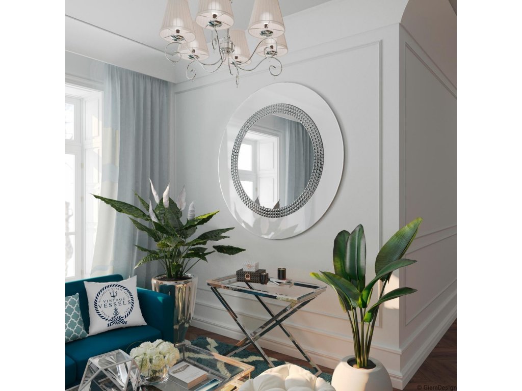 Elegantné, okrúhle nástenné zrkadlo v bielom ráme zdobené striebornou mozaikou. Nadčasový dizajn odkazujúci na štýl Art Deco. Perfektne sa hodí do obývacej izby, jedálne alebo spálne. Zrkadlo je zabezpečené teflónom, ktorý ho chráni pred korozívnym účinkom vlhkosti - vhodné i do kúpeľne. Zbrúsené a leštené okraje zrkadla sú samozrejmosťou.Rám zrkadla je vyrobený z bieleho skla Lacobel a kvalitnej sklenenej striebornej mozaiky (tri rady kociek 15 × 15 mm). Na ňu je nalepené leštené zrkadlo s vysokým leskom. Vzadu sú namontované vešiaky, na želanie môže byť bez vešiakov, na lepenie.