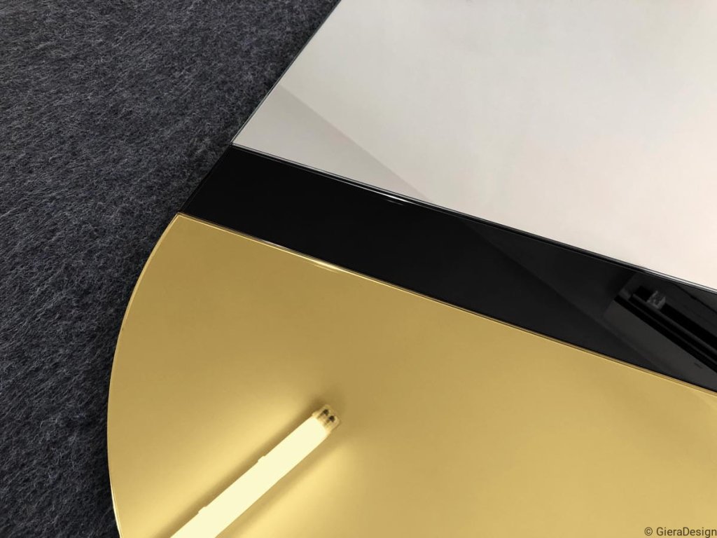 Originálne zrkadlo v modernom štýle, inšpirované grafikou 60. rokov, ozdobí modernú obývaciu izbu, spálňu alebo predsieň ako umelecké dielo. Toto oválne zrkadlo je krásnou ozdobou moderného interiéru, je vynikajúce aj pre moderné eklektické interiéry. Zrkadlo je kombináciou troch rôznych prvkov. Najväčšiu časť tvorí zrkadlová plocha najvyššej akosti. Nasleduje prúžok v čiernej farbe. Poslednú časť zrkadla spestruje plocha v zlatej farbe.